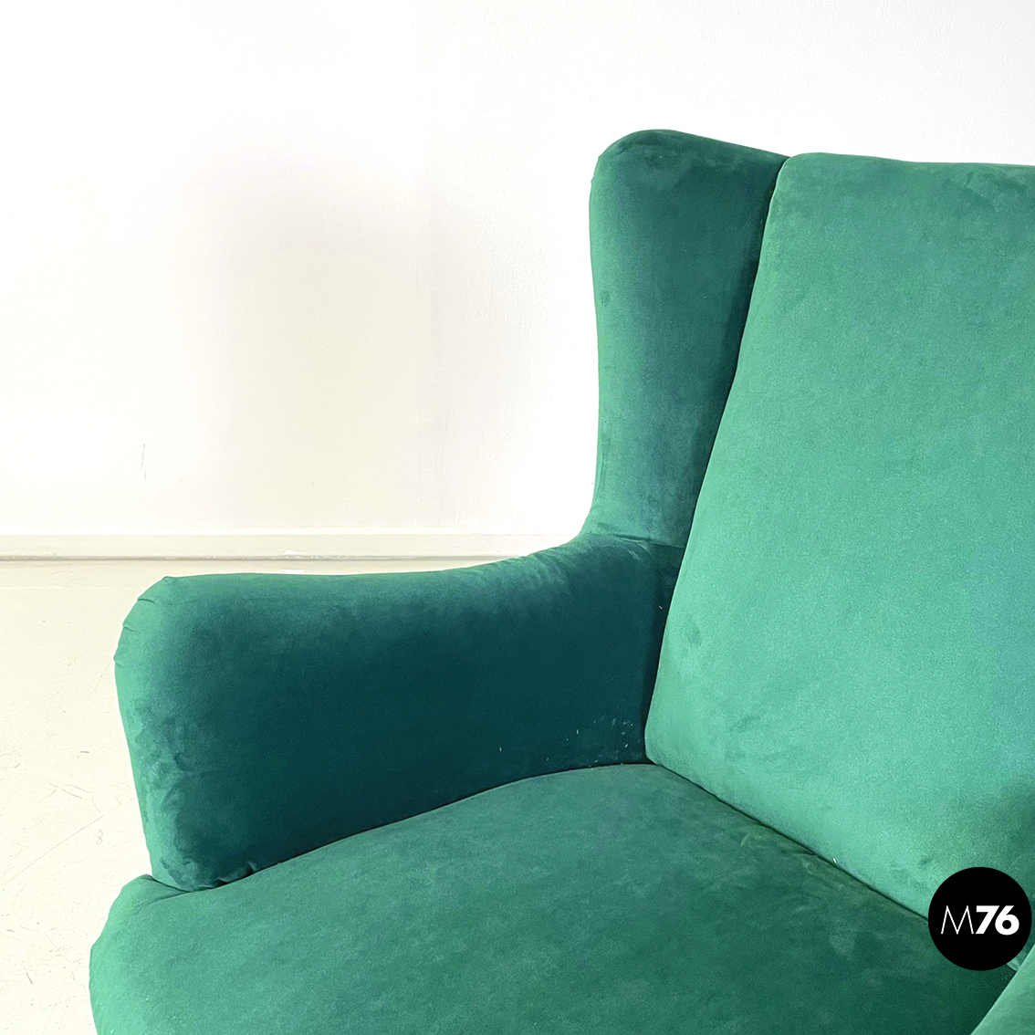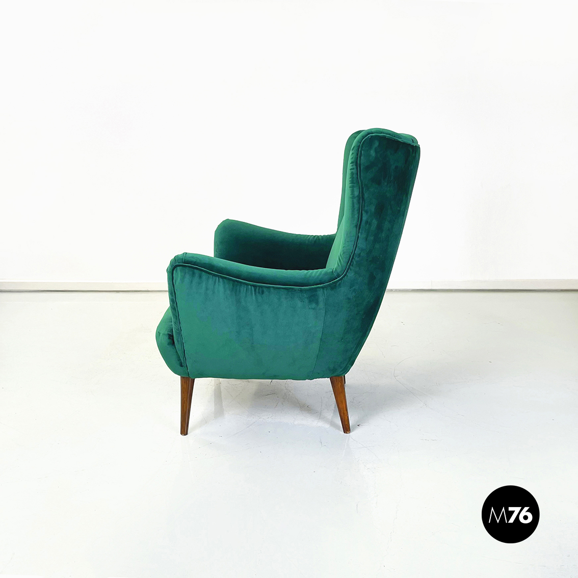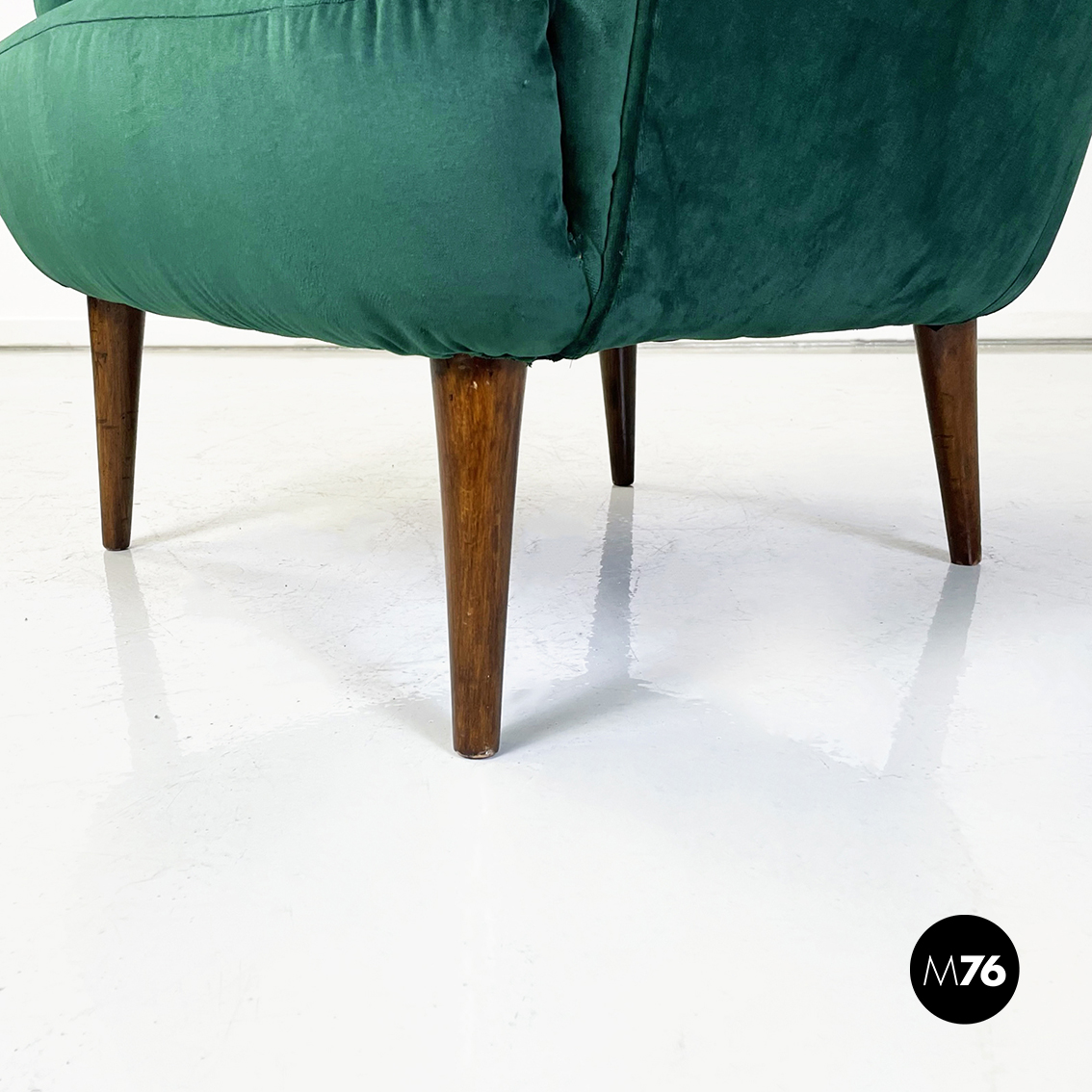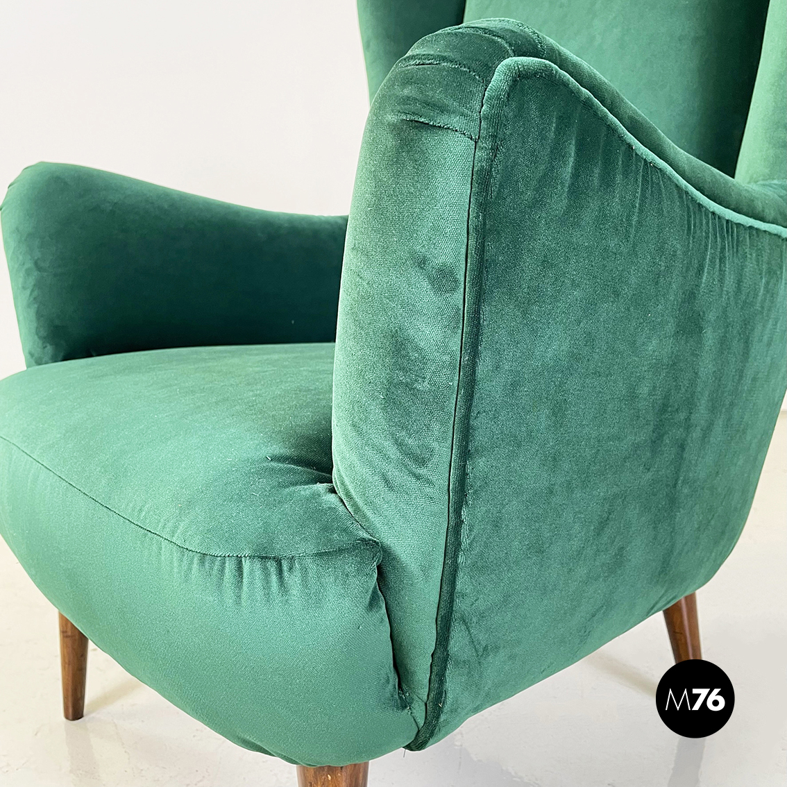 Coppia di poltrone interamente imbottite e rivestite in velluto verde bosco. Braccioli presenti. Zampe in legno.