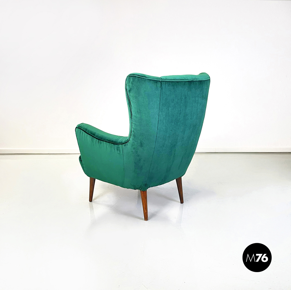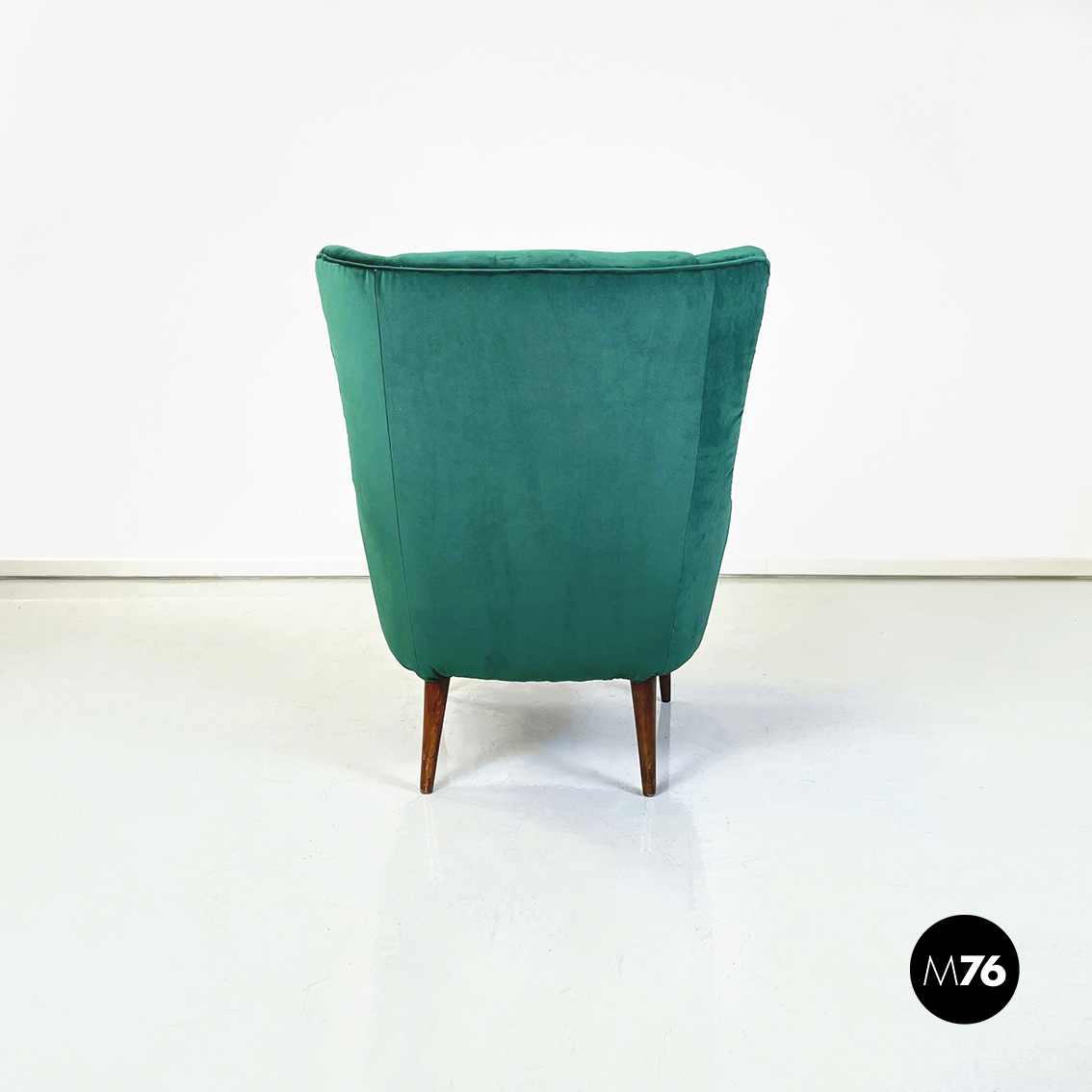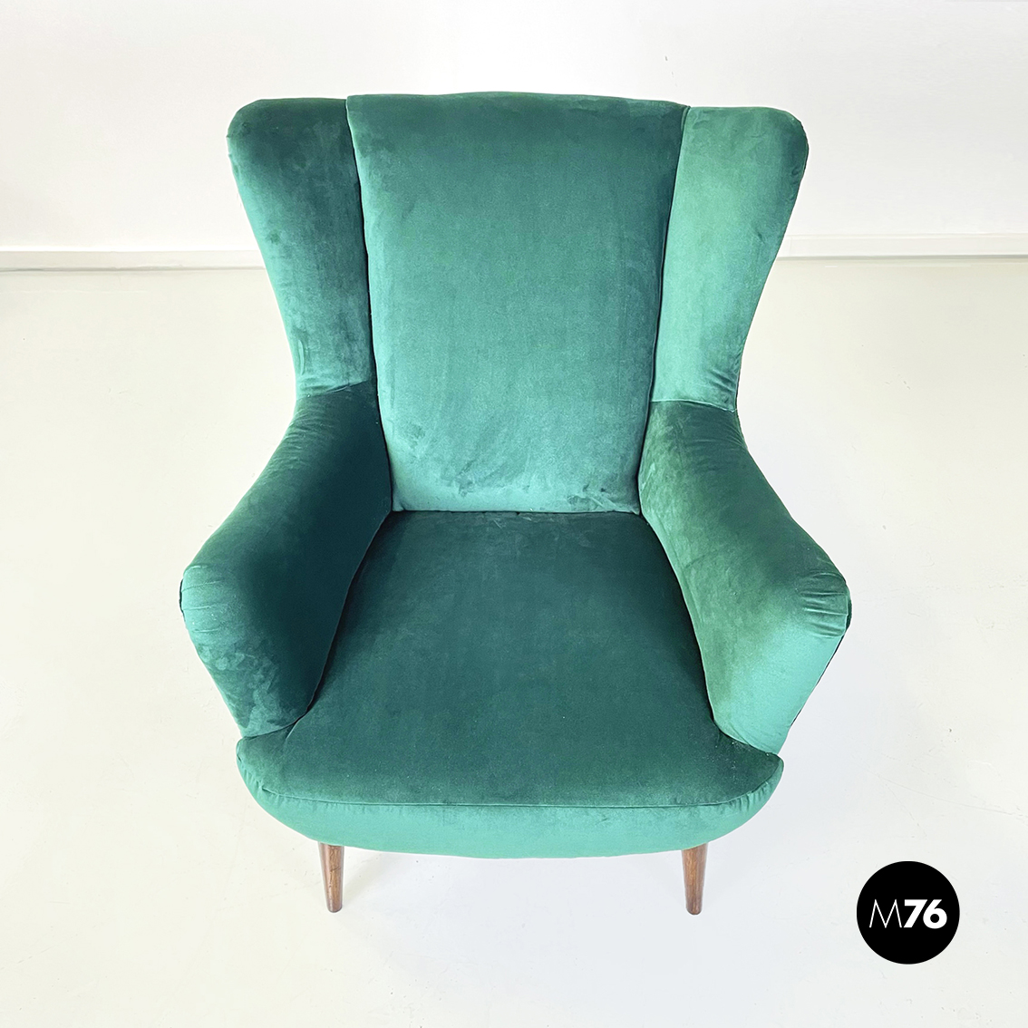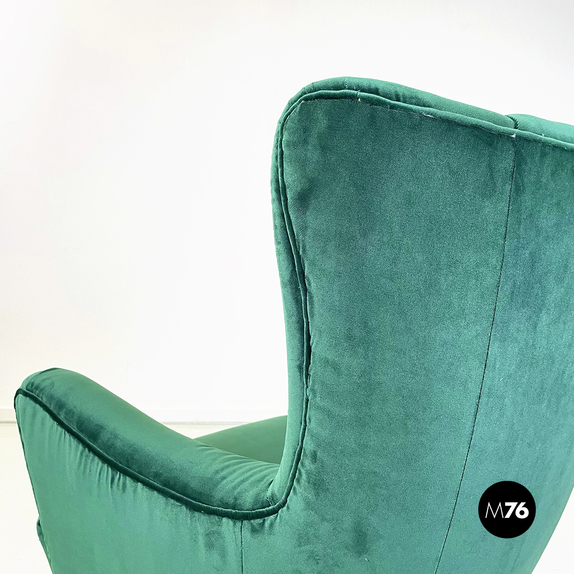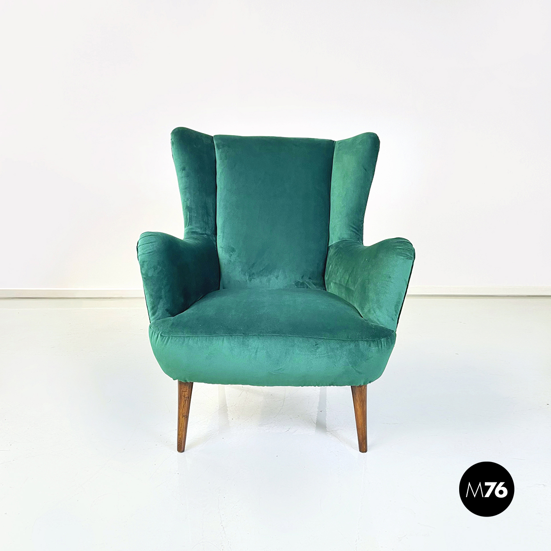 Coppia di poltrone interamente imbottite e rivestite in velluto verde bosco. Braccioli presenti. Zampe in legno.