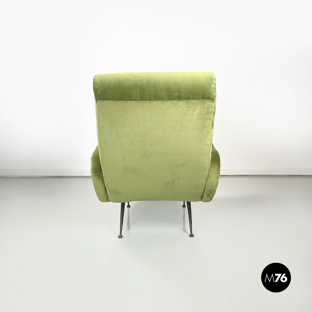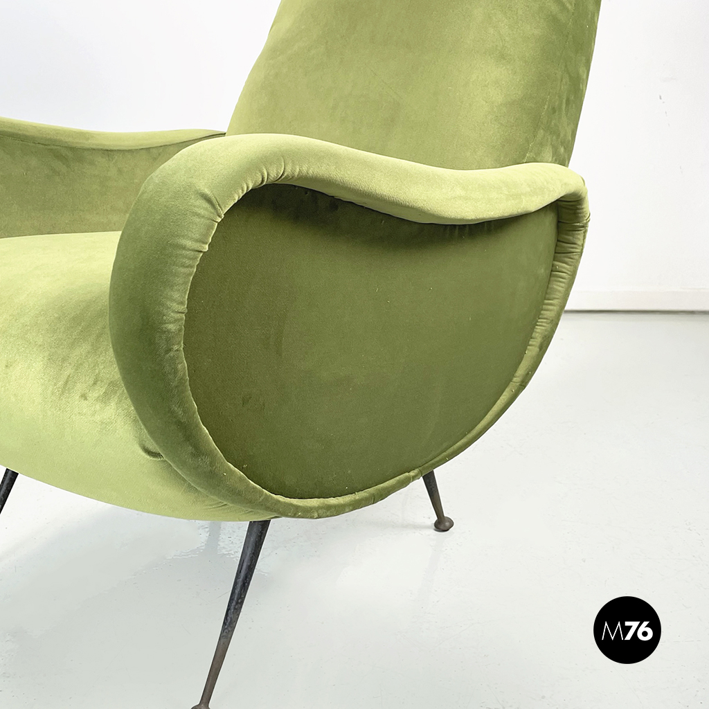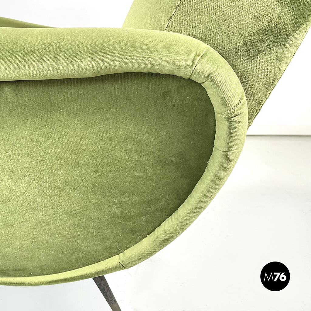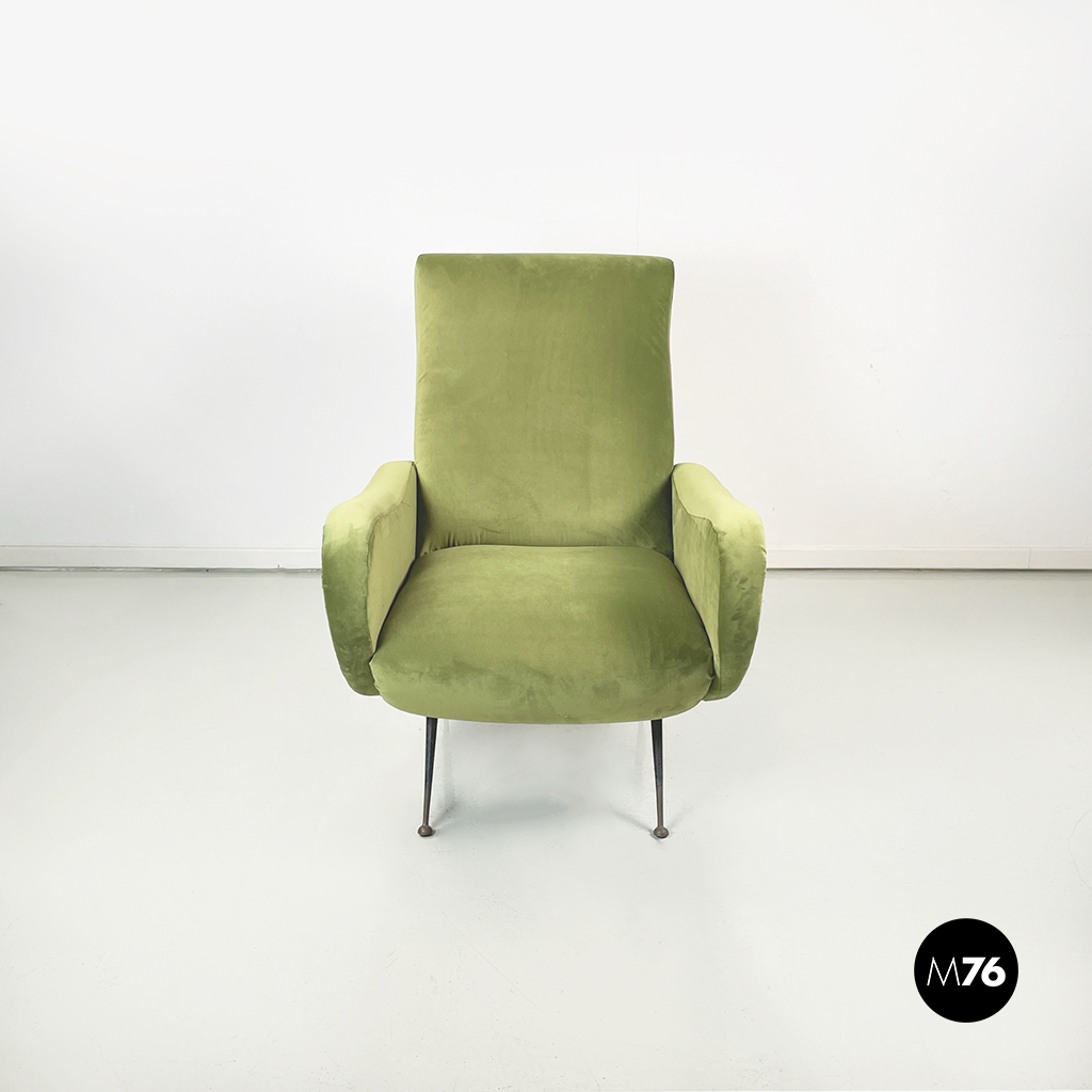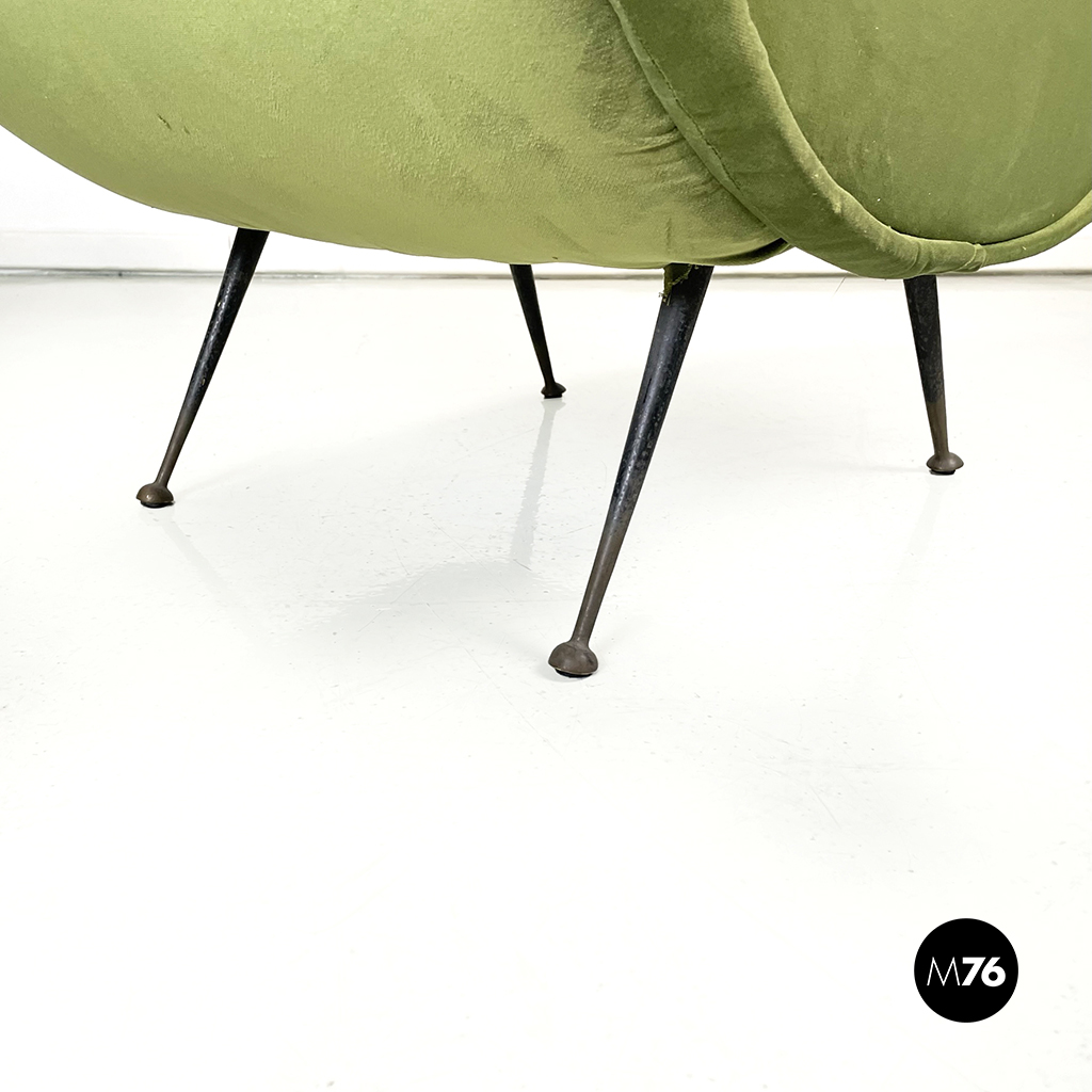 Coppia di poltrone in velluto verde chiaro. I braccioli lo schienale inclinato e la seduta della poltrona presentano dalle forme arrotondate e sinuose. Zampe a sezione tonda con piedini tondi in metallo verniciato nero.