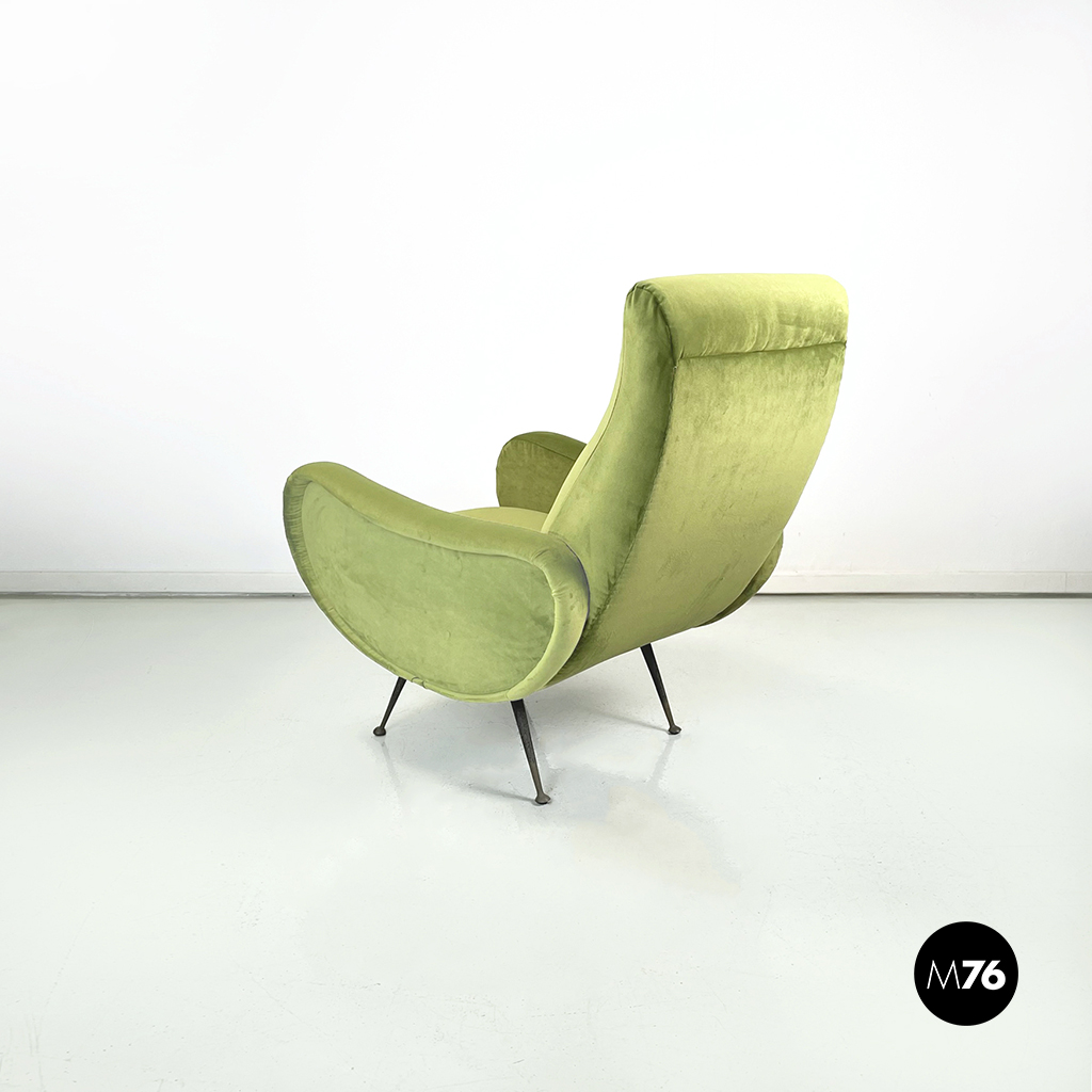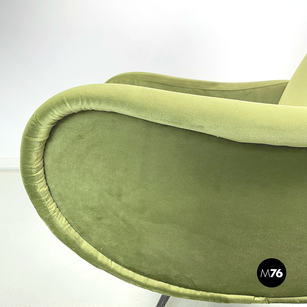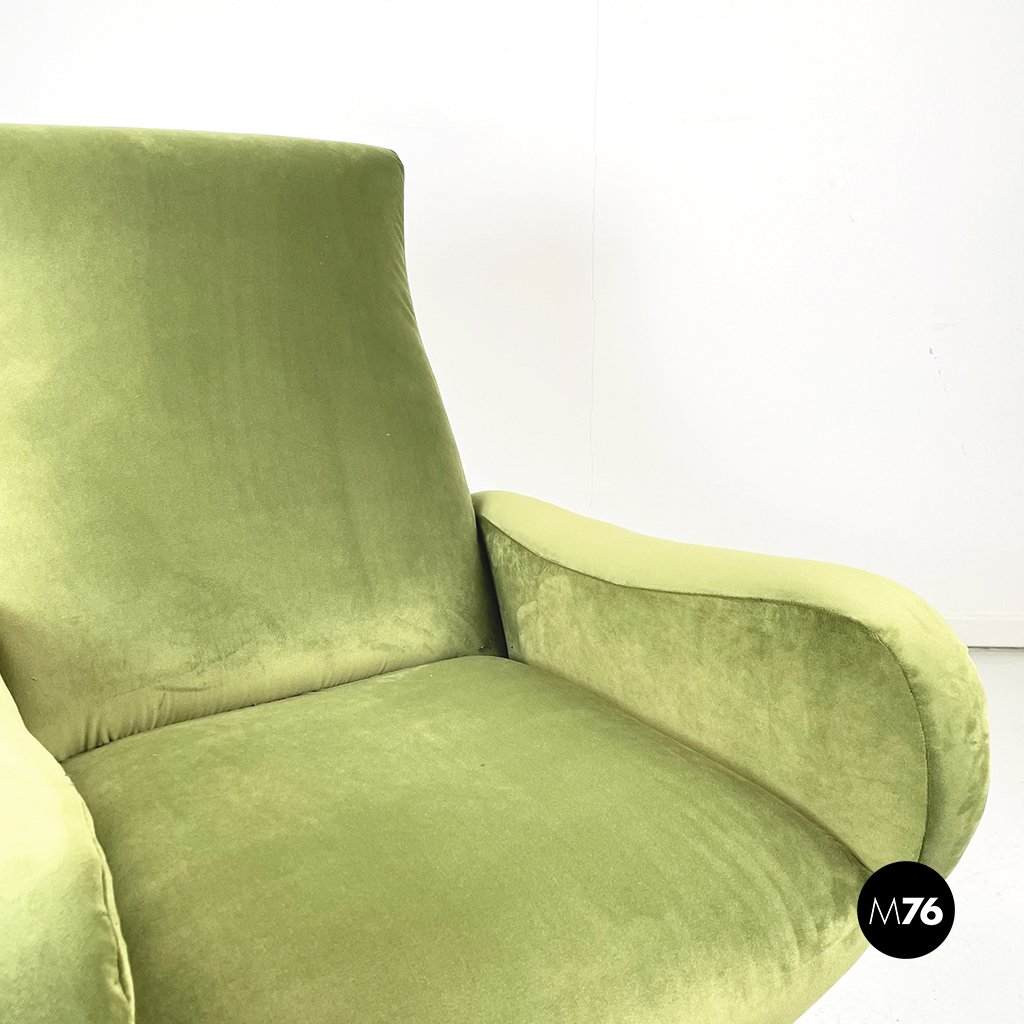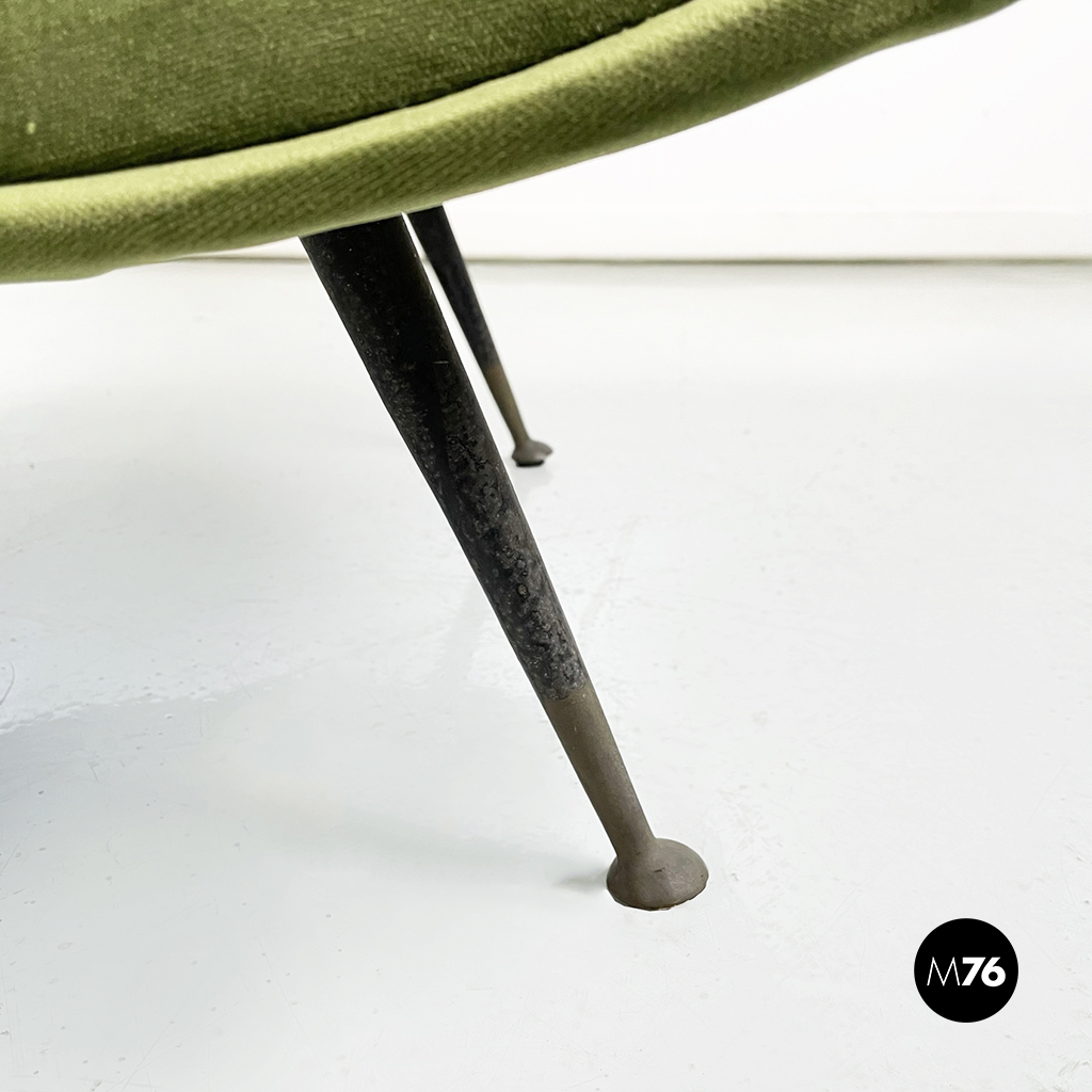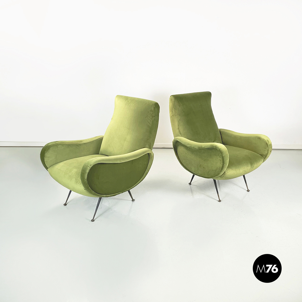 Coppia di poltrone in velluto verde chiaro. I braccioli lo schienale inclinato e la seduta della poltrona presentano dalle forme arrotondate e sinuose. Zampe a sezione tonda con piedini tondi in metallo verniciato nero.