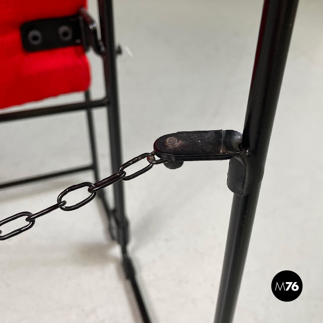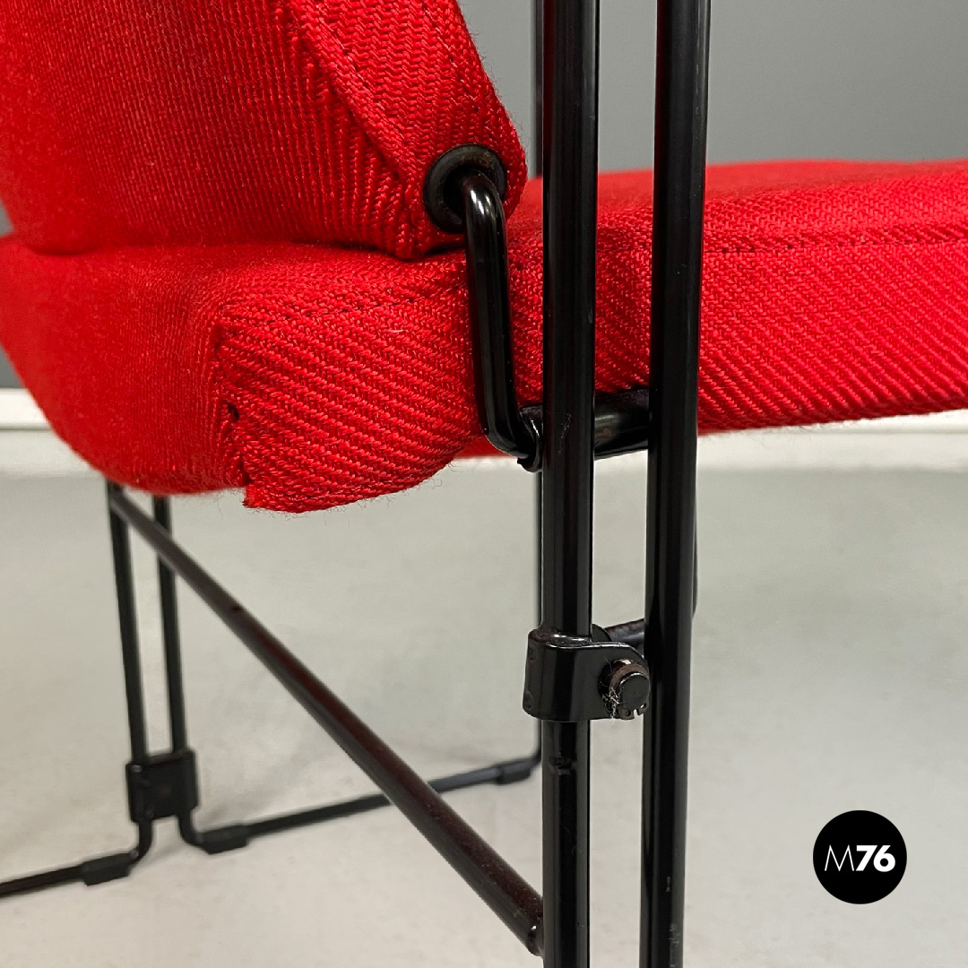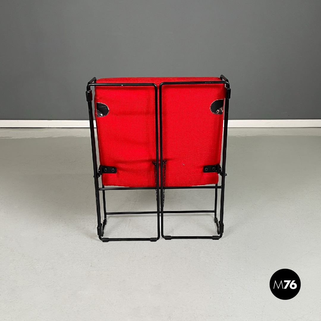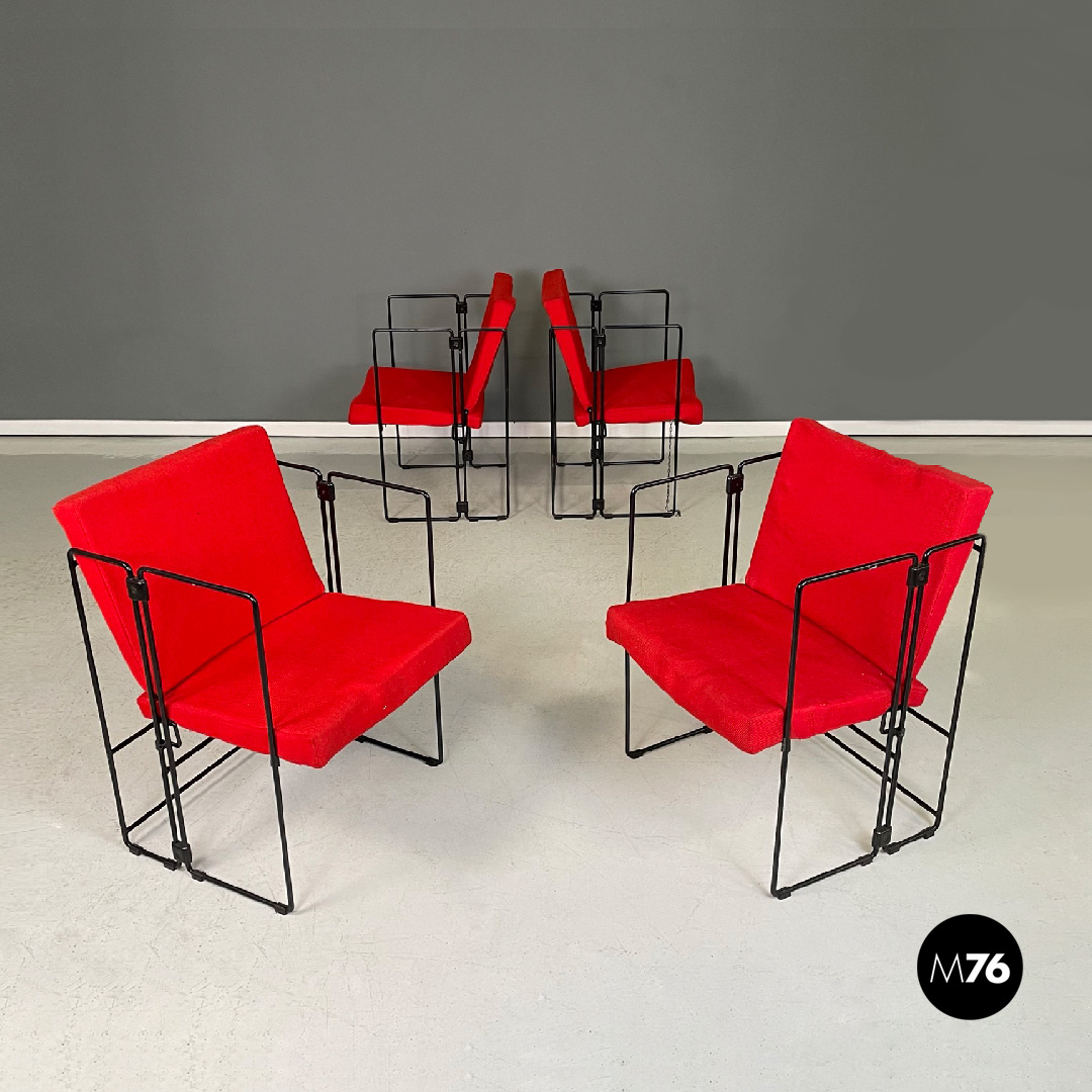 Set di quattro poltrone modello Jolly a base rettangolare. La struttura è in tondino di metallo verniciato nero e fa anche da braccioli. La seduta e lo schienale sono imbottiti e rivestiti in tessuto rosso. Il telaio è pieghevole e completamente richiudibile. Hanno una catenella che sorregge la seduta quando sono aperte.