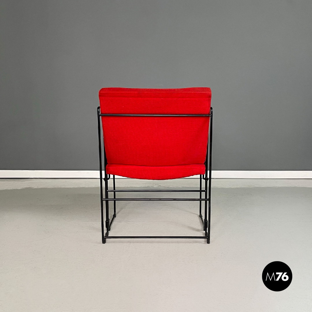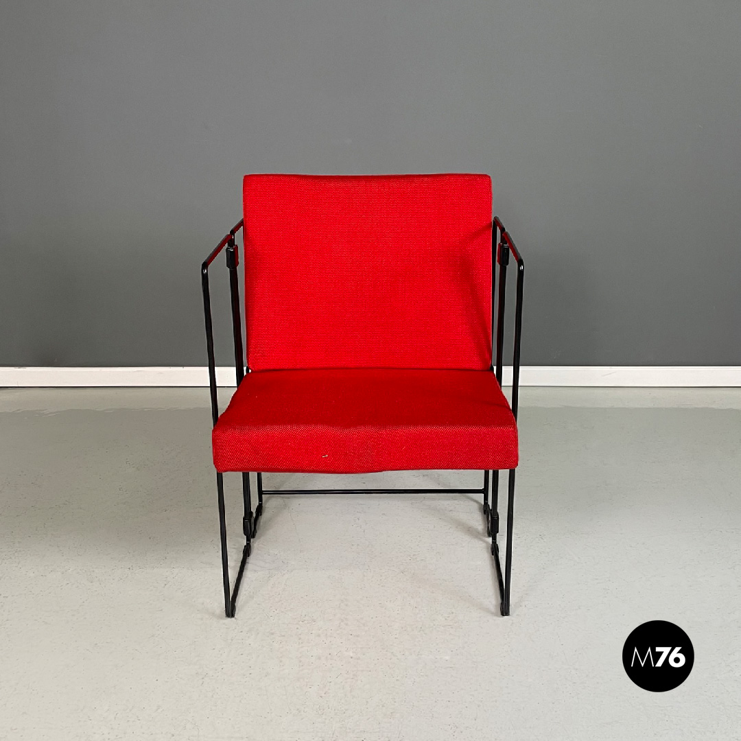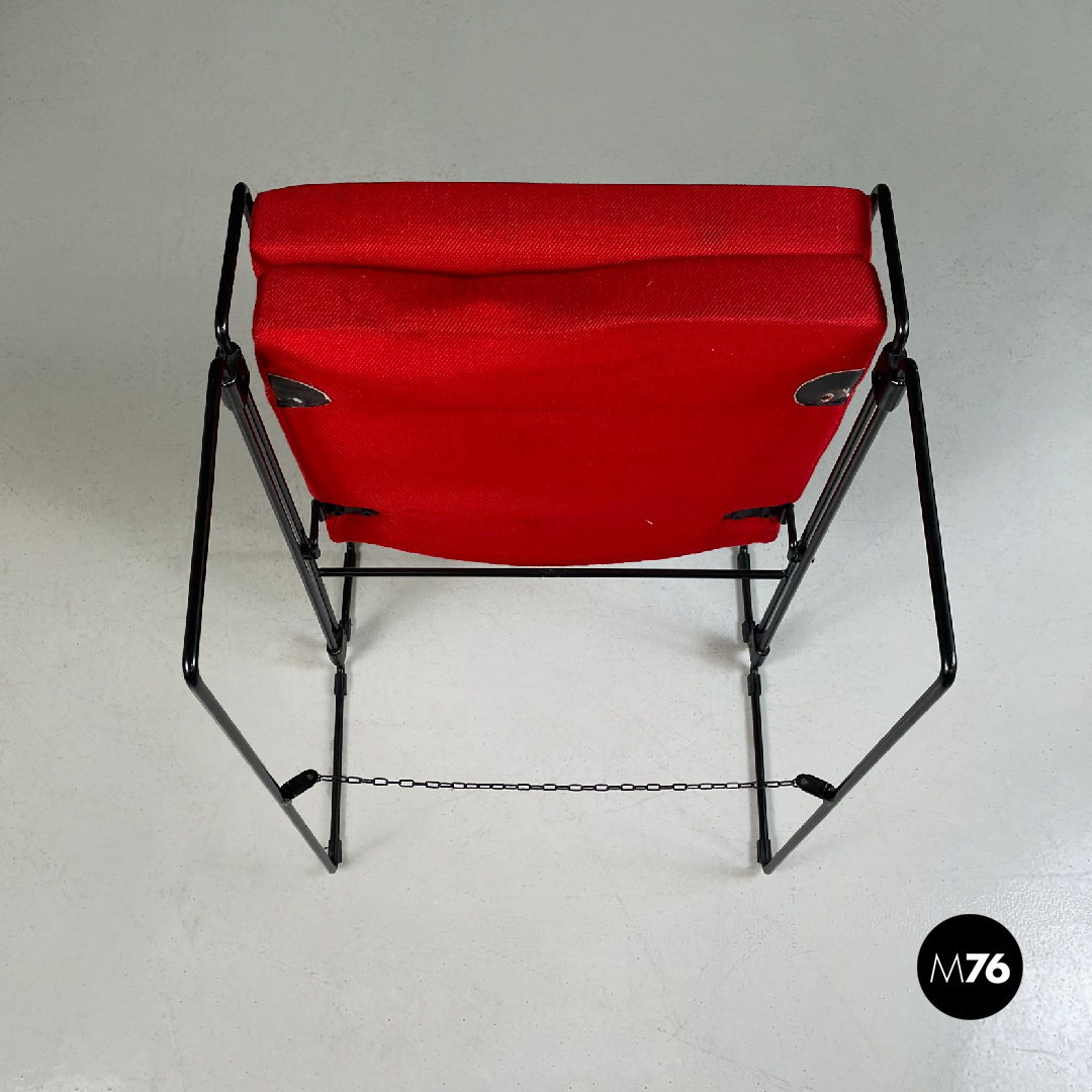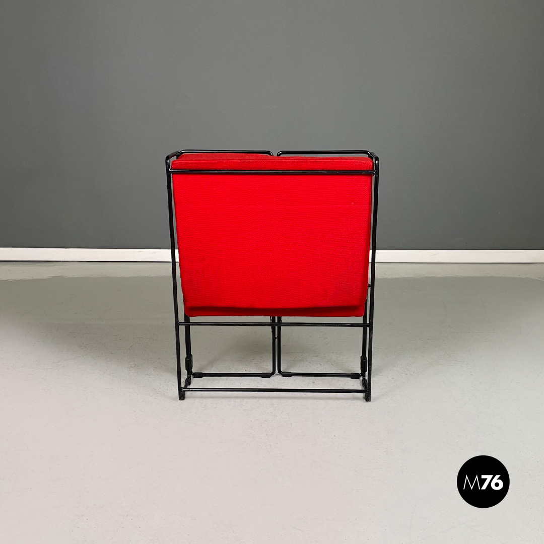 Set di quattro poltrone modello Jolly a base rettangolare. La struttura è in tondino di metallo verniciato nero e fa anche da braccioli. La seduta e lo schienale sono imbottiti e rivestiti in tessuto rosso. Il telaio è pieghevole e completamente richiudibile. Hanno una catenella che sorregge la seduta quando sono aperte.