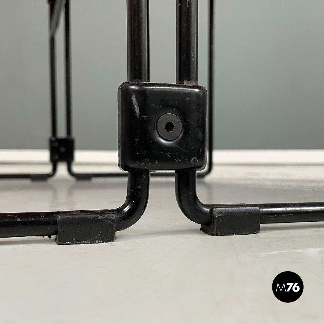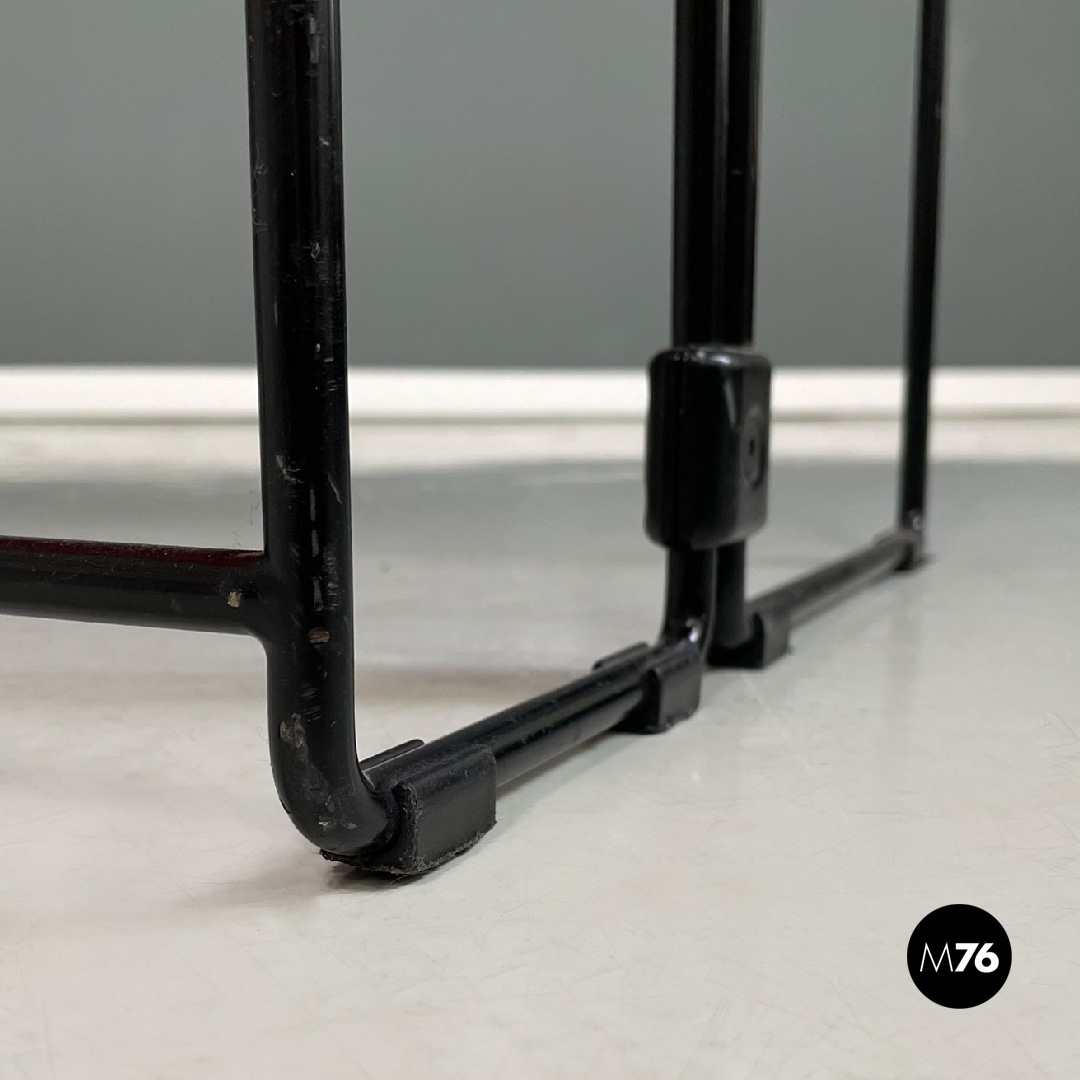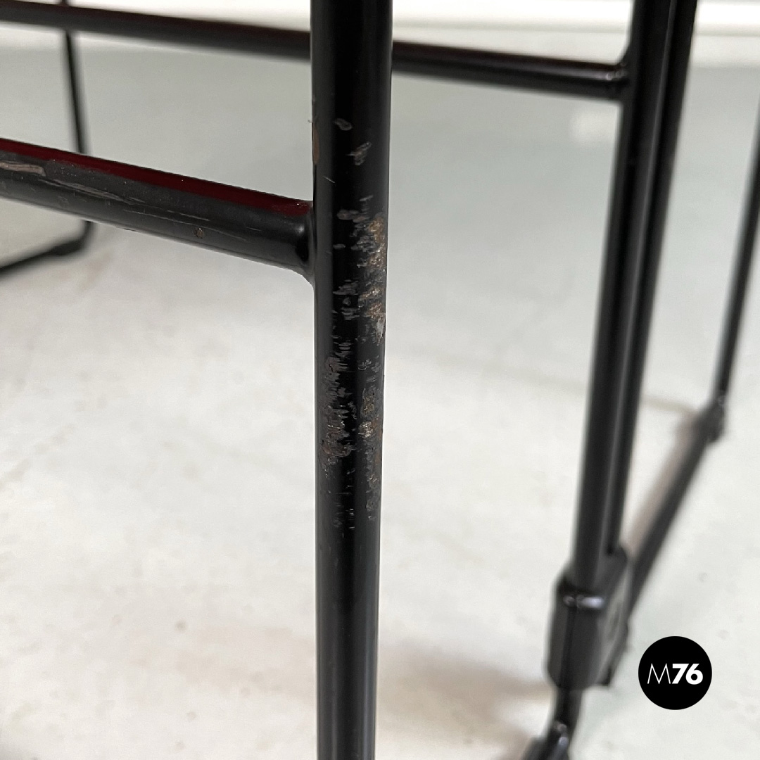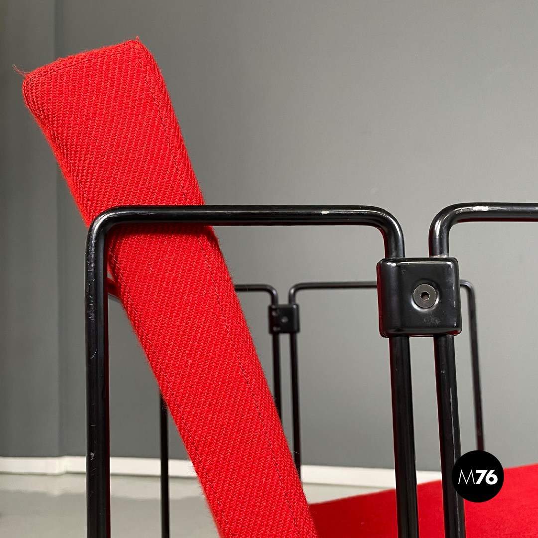 Set di quattro poltrone modello Jolly a base rettangolare. La struttura è in tondino di metallo verniciato nero e fa anche da braccioli. La seduta e lo schienale sono imbottiti e rivestiti in tessuto rosso. Il telaio è pieghevole e completamente richiudibile. Hanno una catenella che sorregge la seduta quando sono aperte.