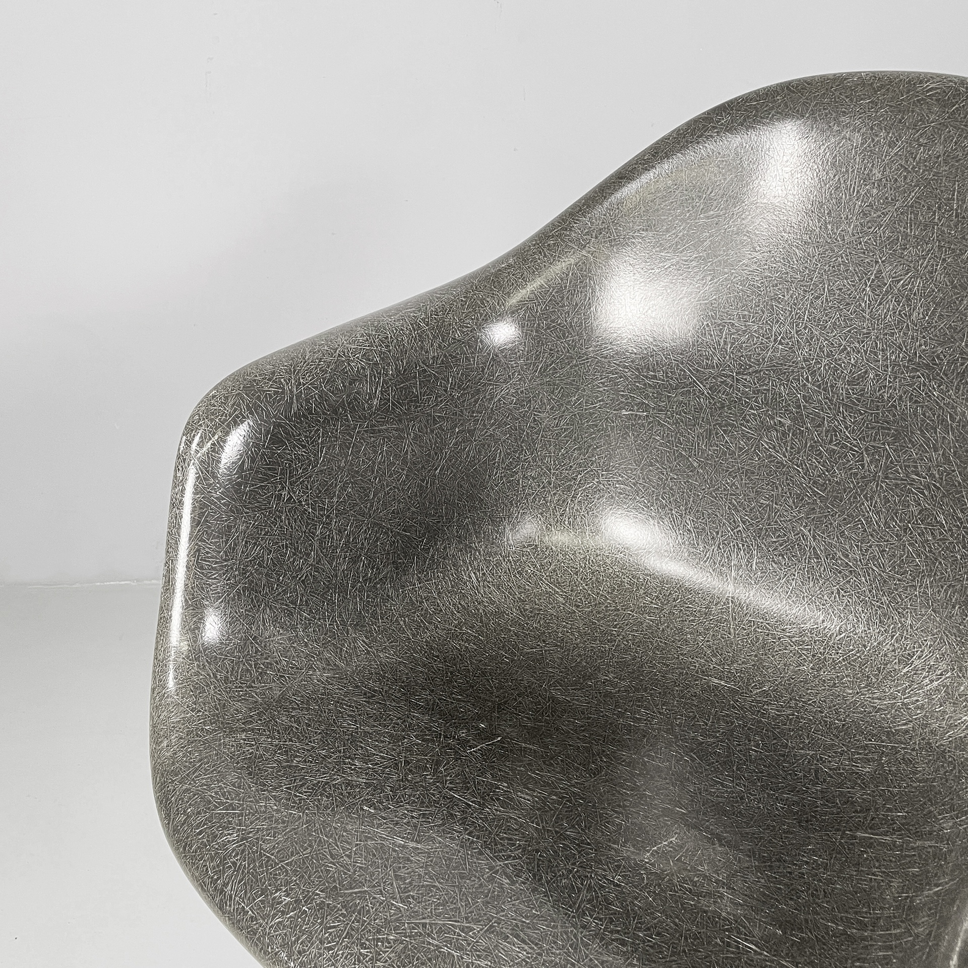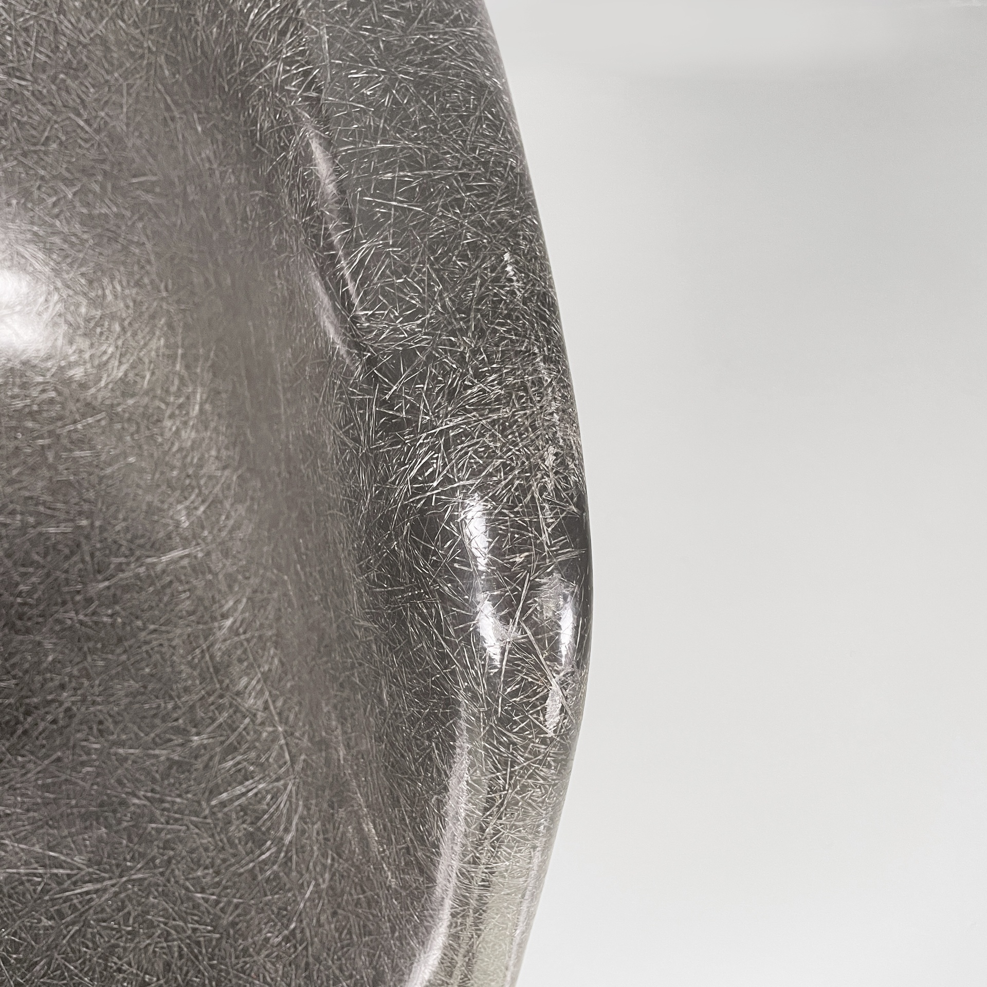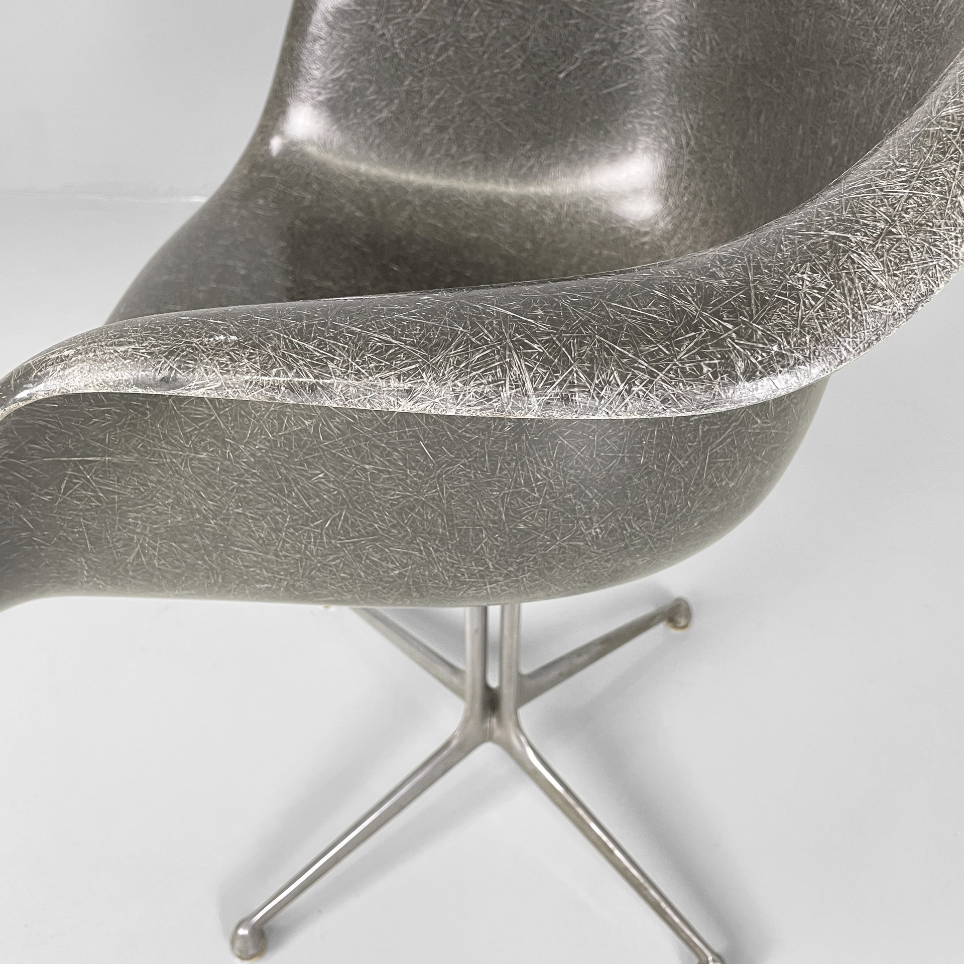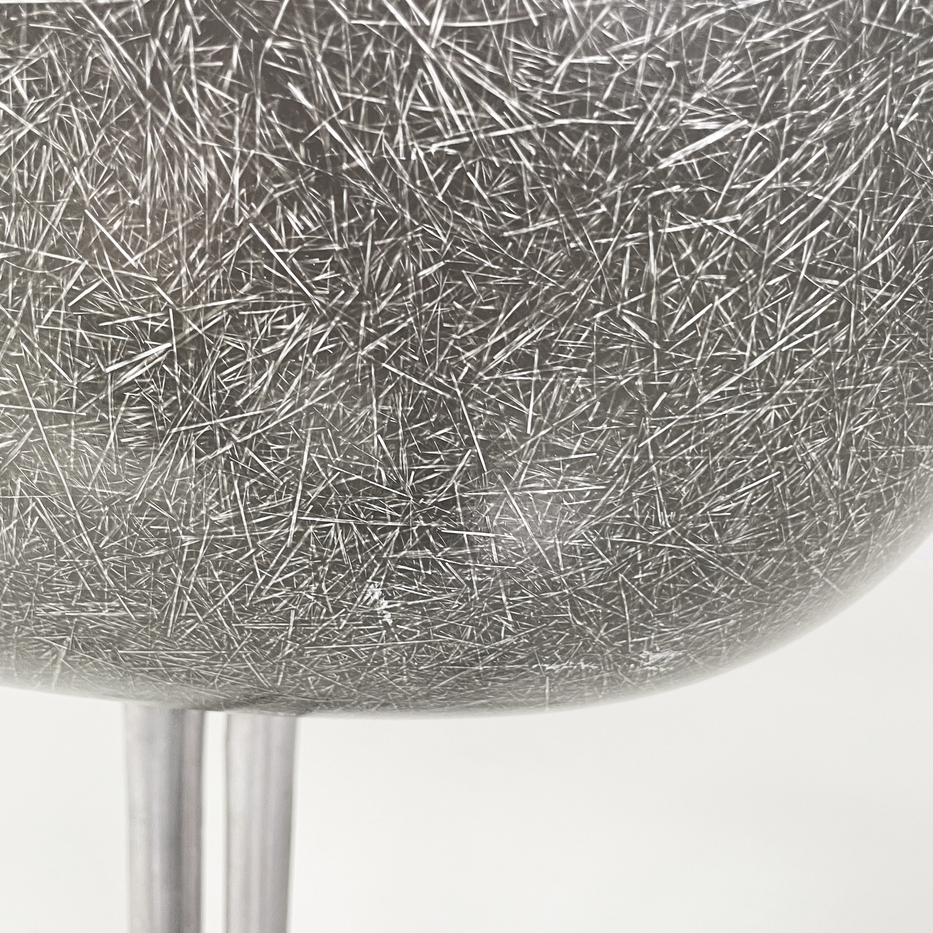 Set di sei poltrone modello La Fonda con seduta e schienale monoscocca curvata in vetroresina griga. Braccioli presenti. La base in alluminio è formata da quattro razze con piedini tondi. Possono essere usati come sedie da ufficio.