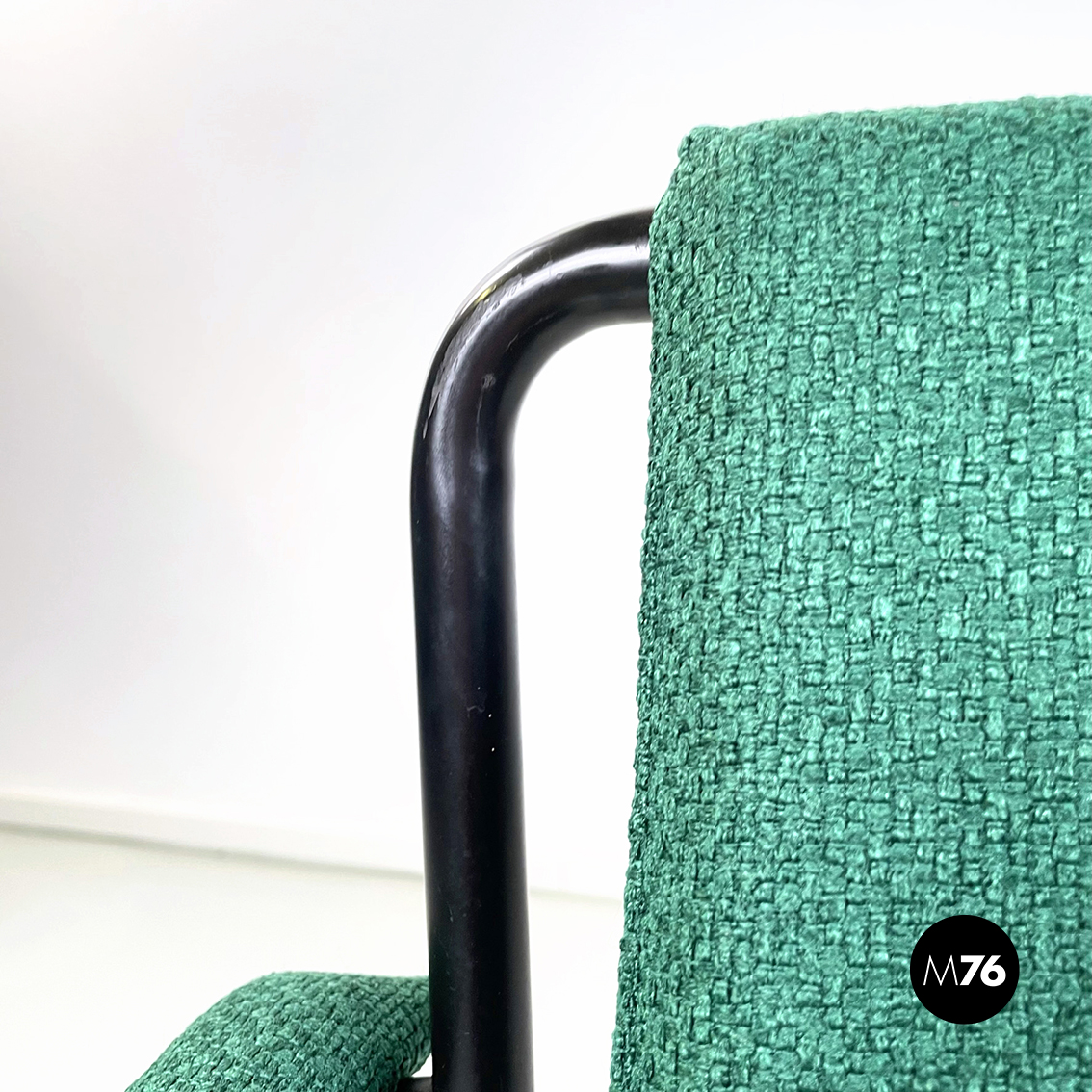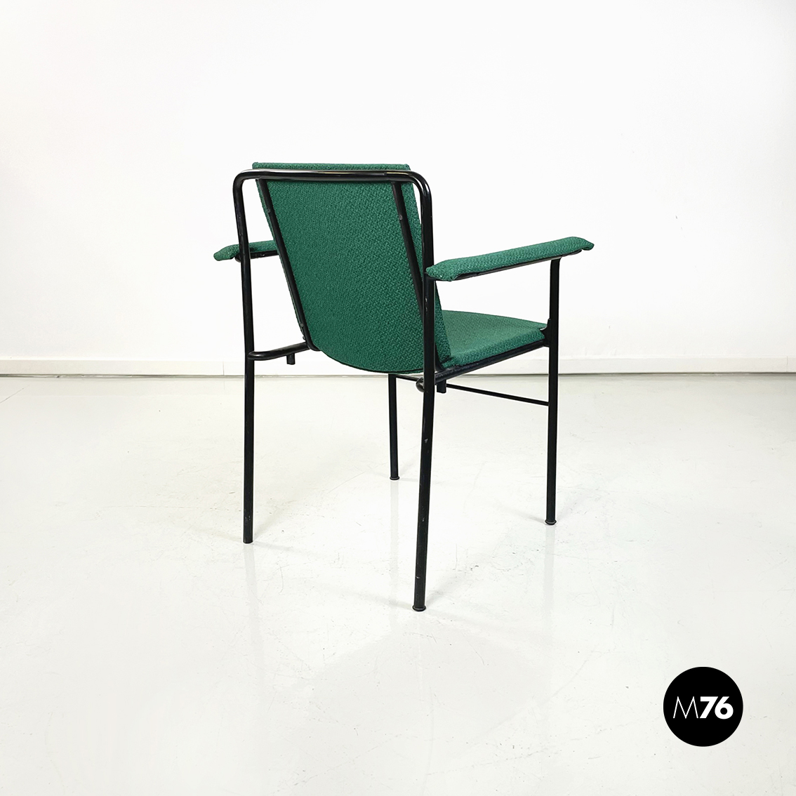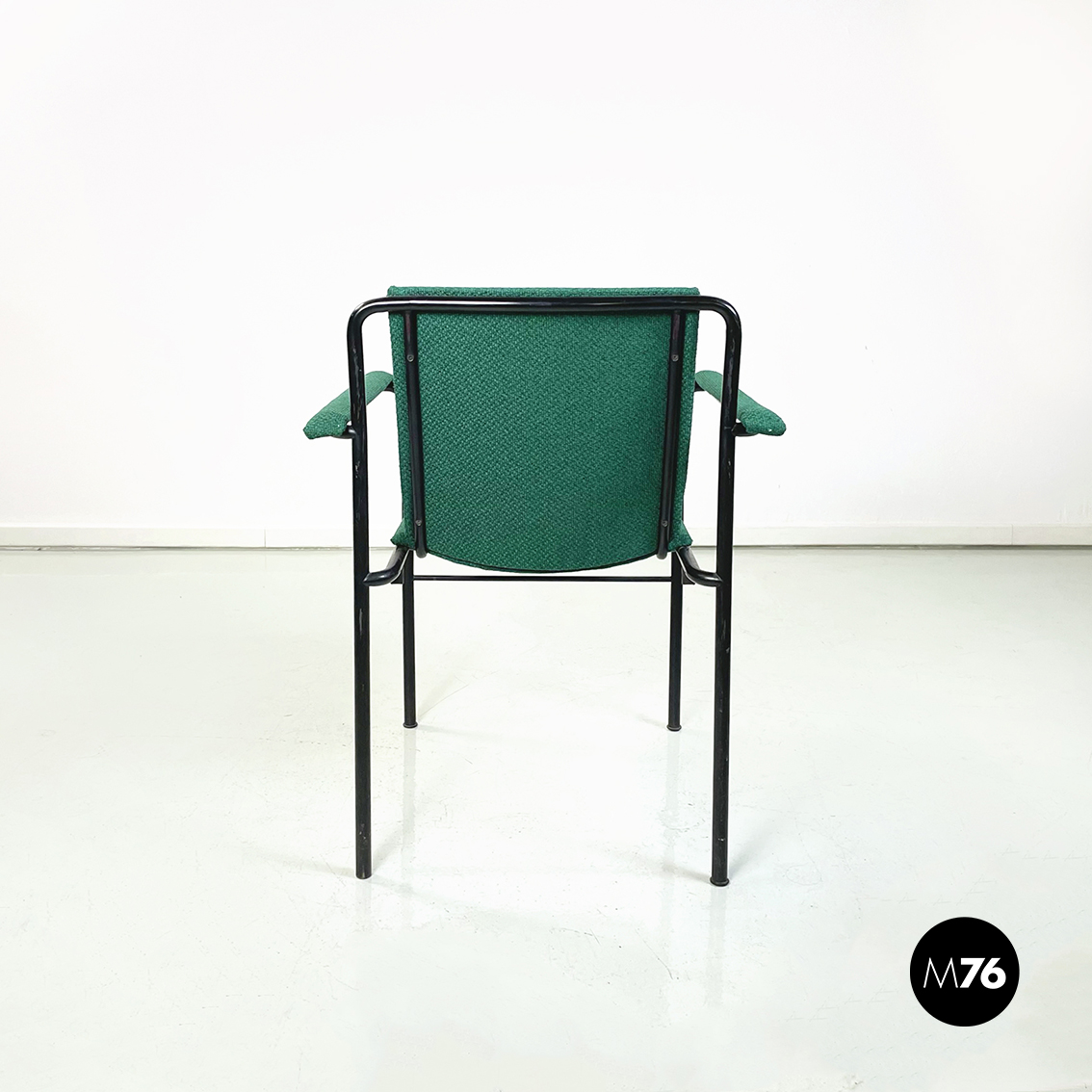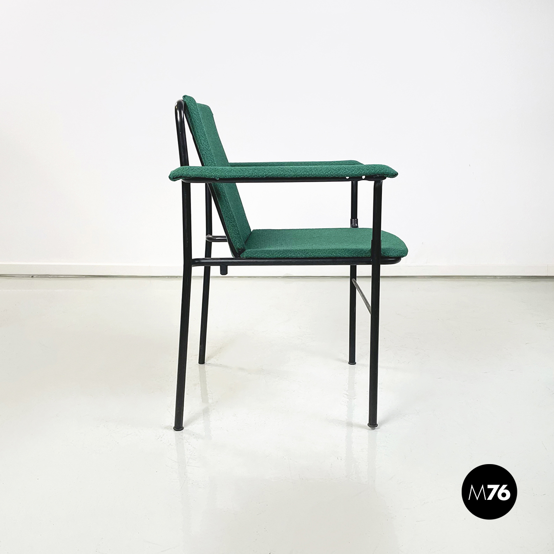 Set di sei poltrone modello Movie Chair con seduta braccioli e schienale rettangolari rivestiti in tessuto verde bosco. Lo schienale è leggermente inclinato per seguire la seduta. La struttura è in tubolare di metallo verniciato nero.