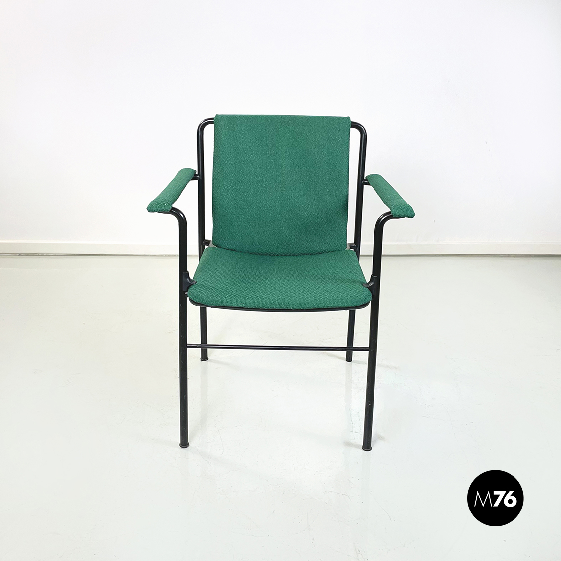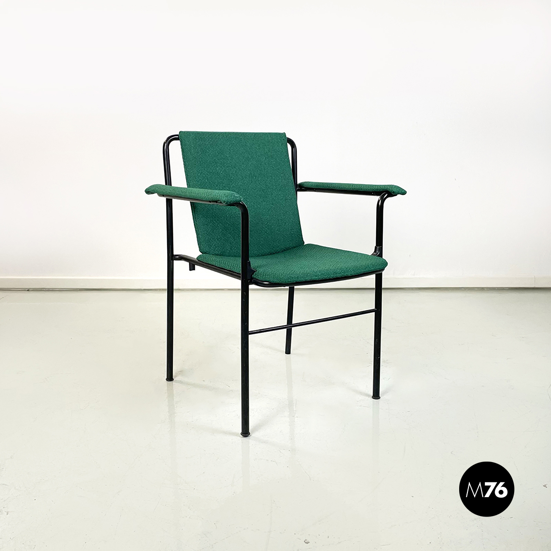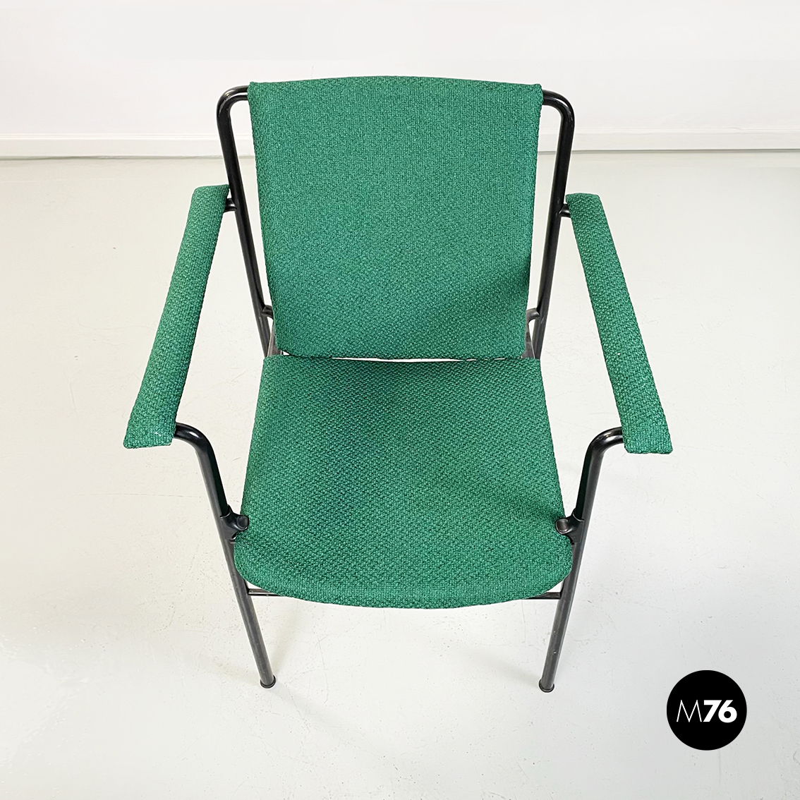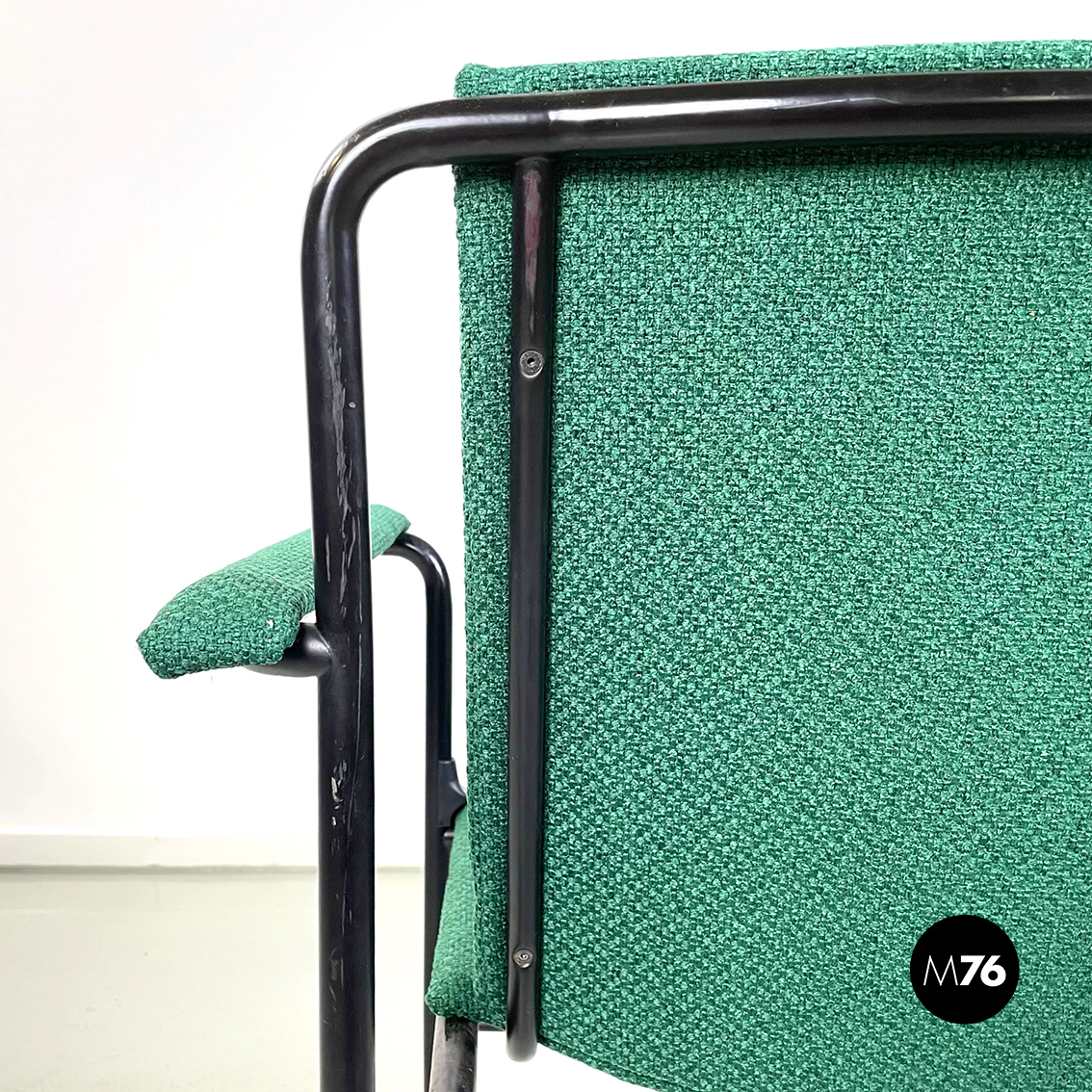 Set di sei poltrone modello Movie Chair con seduta braccioli e schienale rettangolari rivestiti in tessuto verde bosco. Lo schienale è leggermente inclinato per seguire la seduta. La struttura è in tubolare di metallo verniciato nero.