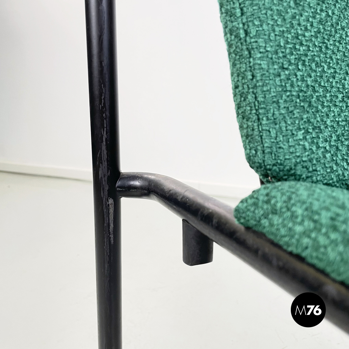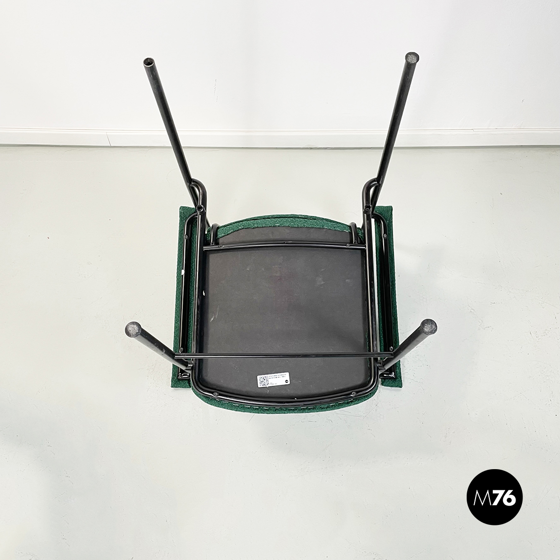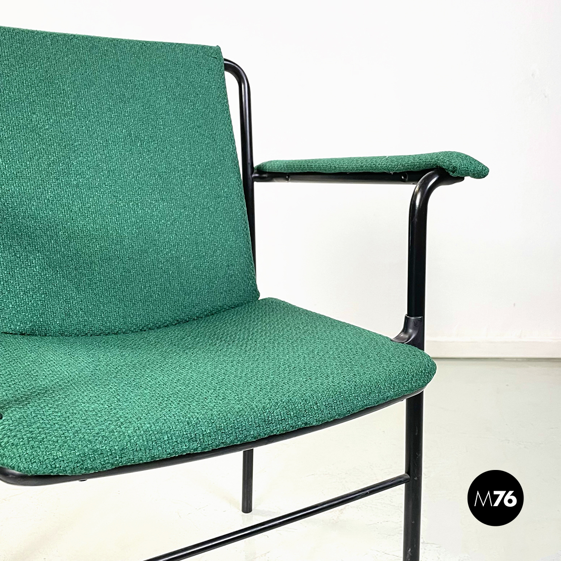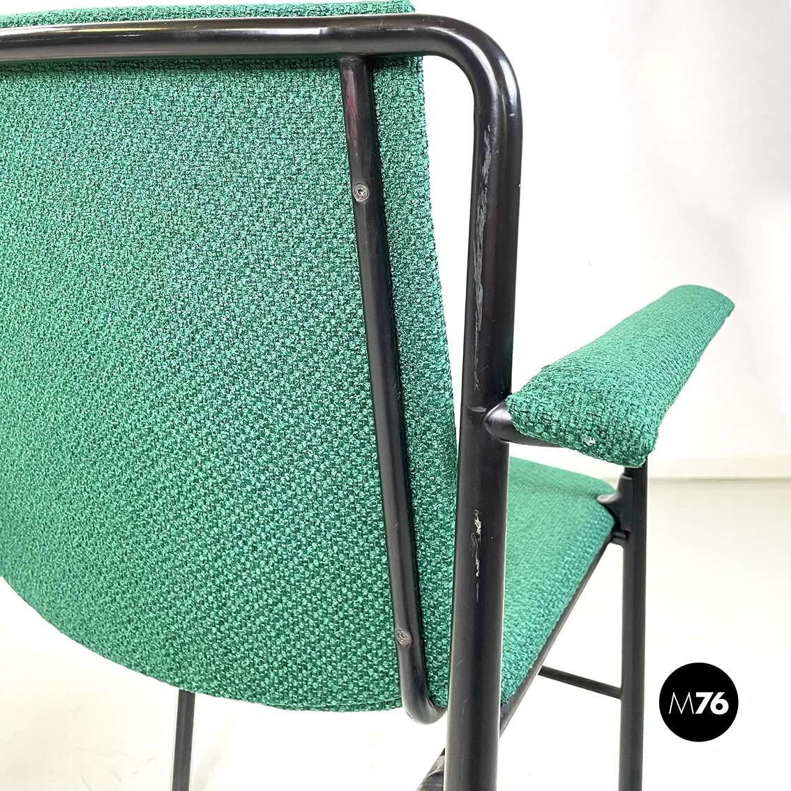 Set di sei poltrone modello Movie Chair con seduta braccioli e schienale rettangolari rivestiti in tessuto verde bosco. Lo schienale è leggermente inclinato per seguire la seduta. La struttura è in tubolare di metallo verniciato nero.