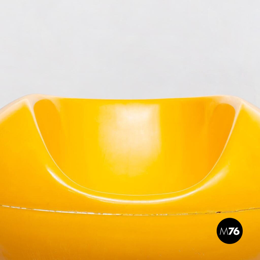 Coppia di poltrone modello Pastille in fibra di vetro gialla fuoco. La struttura di questa seduta è a forma di “caramella”che permette di essere utilizzata anche come sedia a dondolo. Utilizzabile anche in esterno come in giardino.