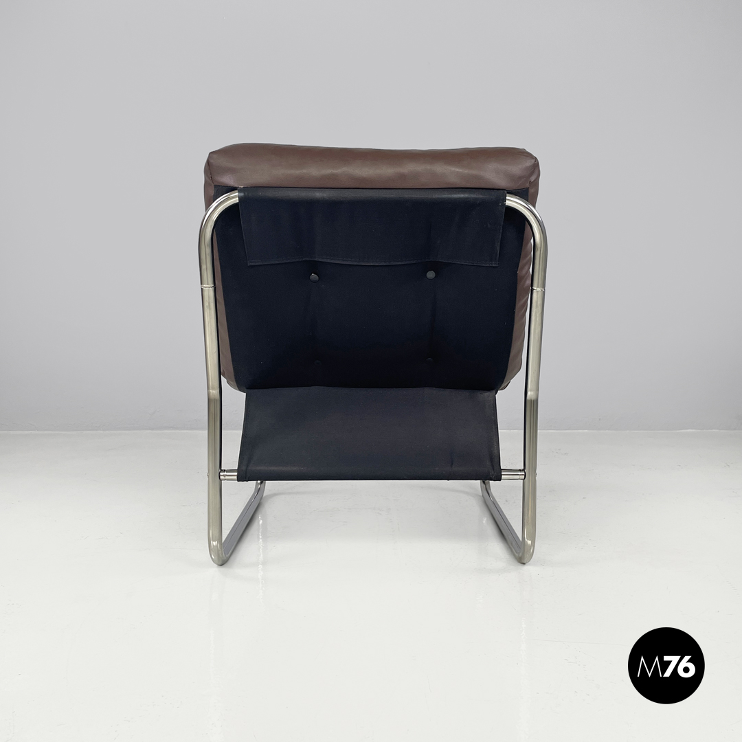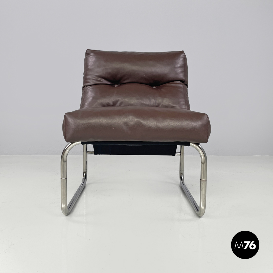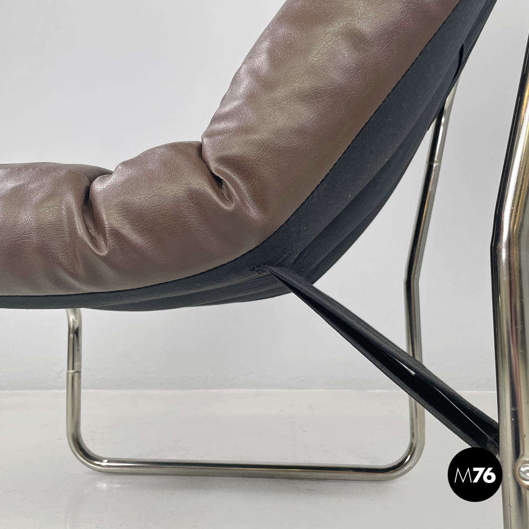 Coppia di poltrone modello Pixi in pelle sintetica marrone. Un unico cuscino imbottito e con otto bottoni compone la seduta e lo schienale il retro è in tessuto nero. La struttura è in tubolare di metallo cromato.