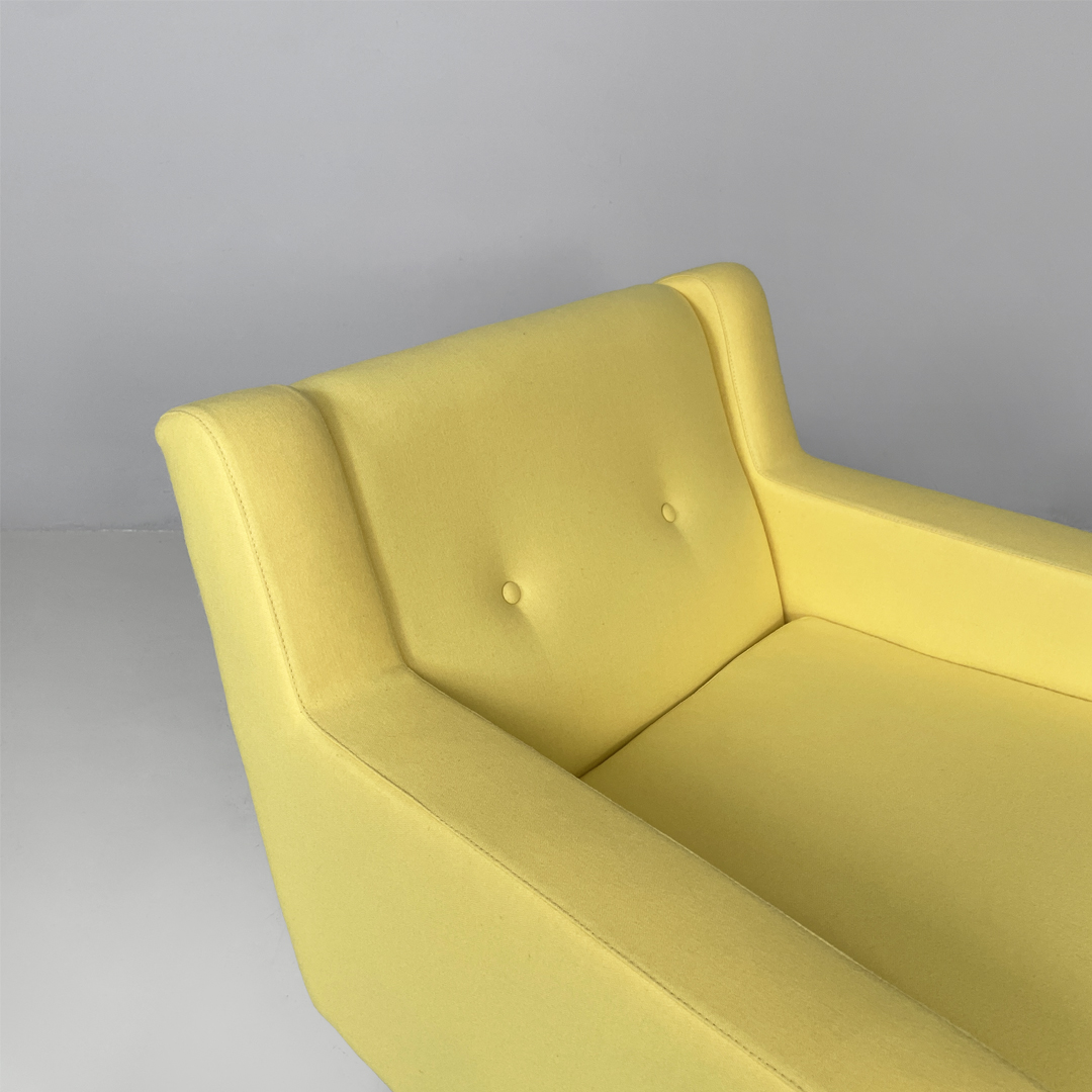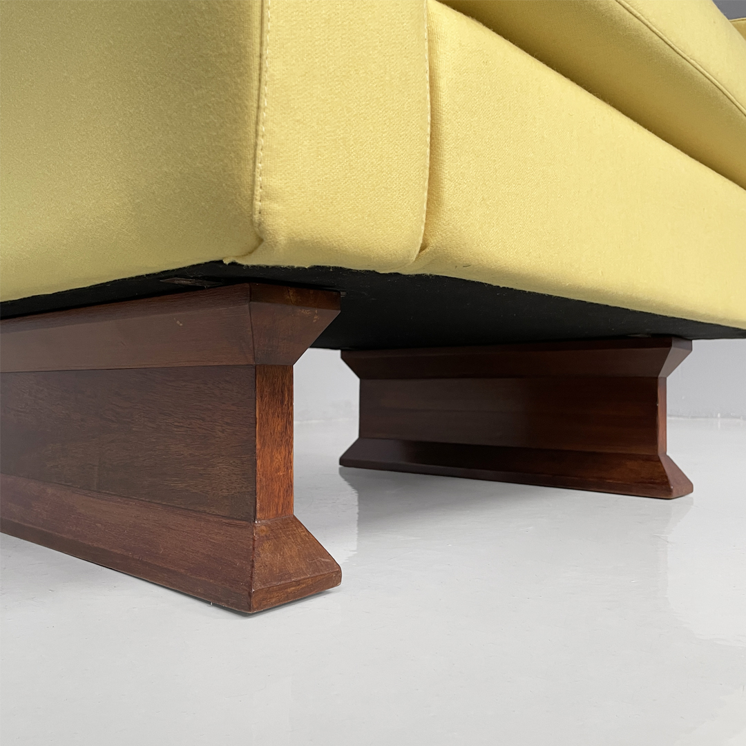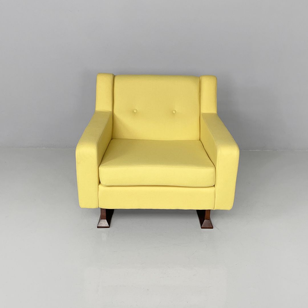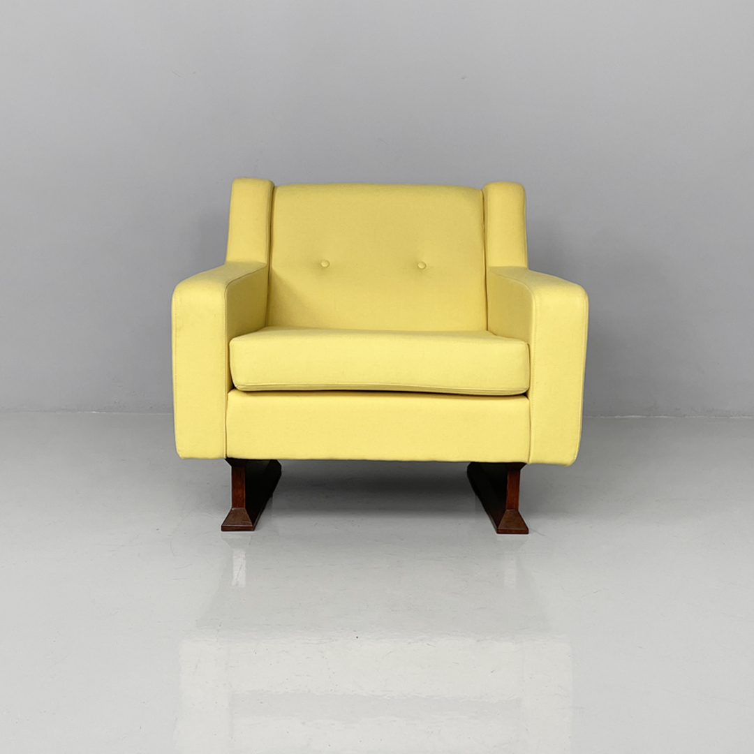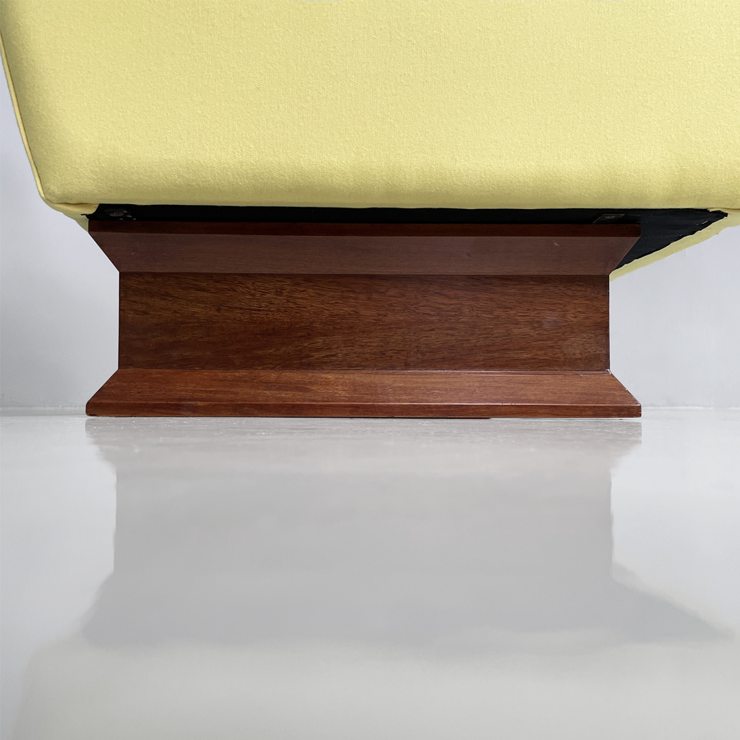 Coppia di poltrone modello PL34 con struttura in legno e rivestimento in tessuto. La seduta, schienale e braccioli sono imbottiti e rivestiti in tessuto giallo chiaro. La struttura e le due zampe sono in legno scuro.