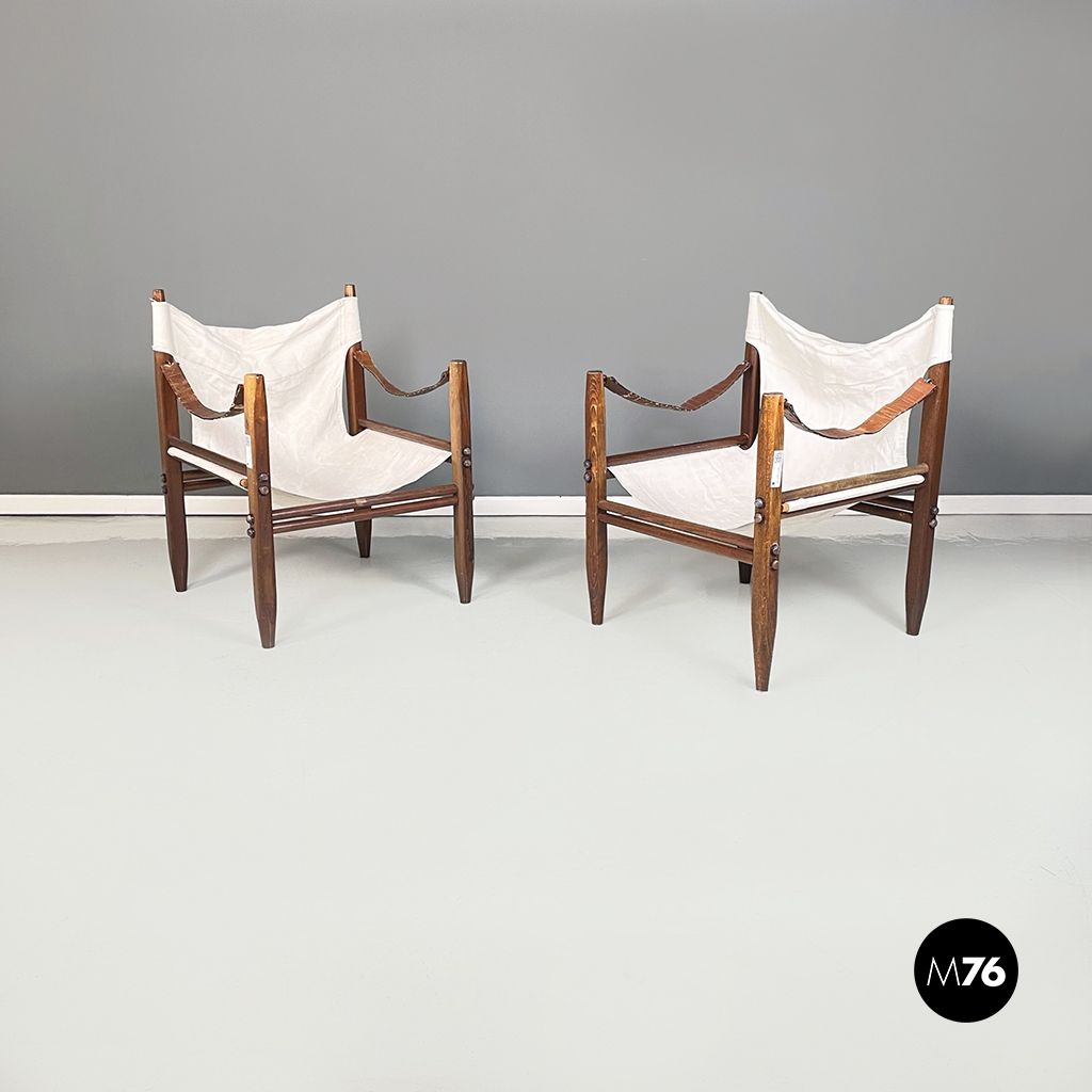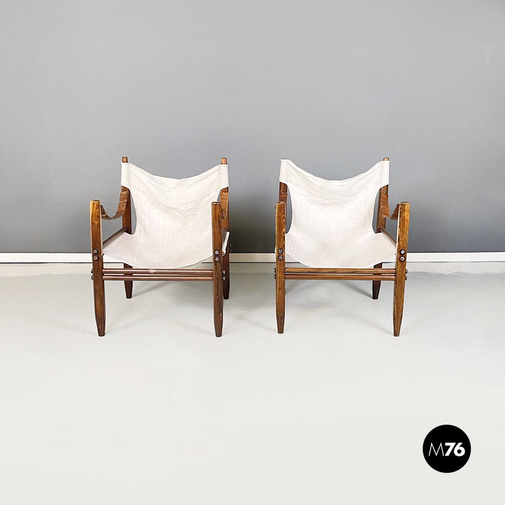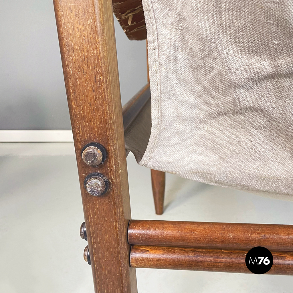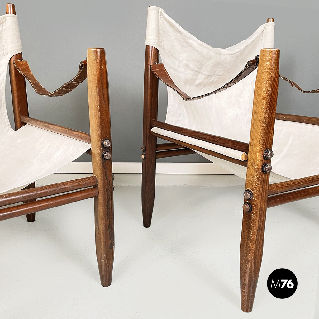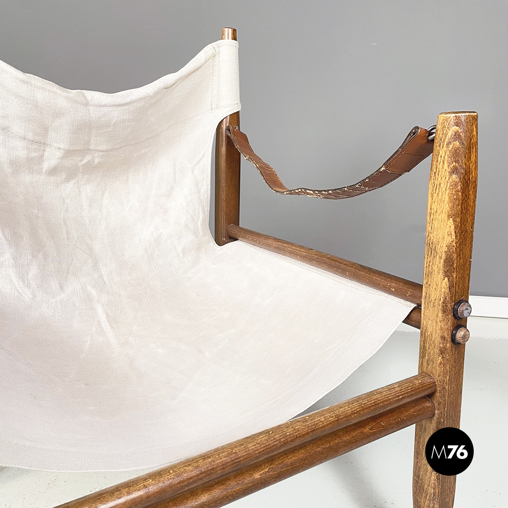 Coppia di poltrone modello Oasi 85 conosciute anche come Safari in tessuto beige e legno. La seduta e lo schienale sono composti da un unico tessuto fissata alla struttura. I braccioli sono realizzati con cinghie di cuoio marrone e piccole bielle in metallo. La struttura è in legno ed è completamente smontabile.