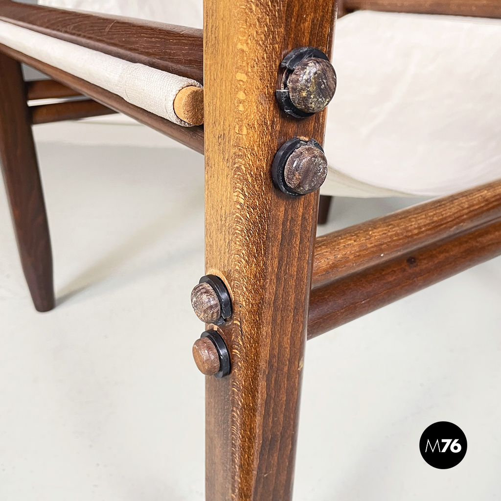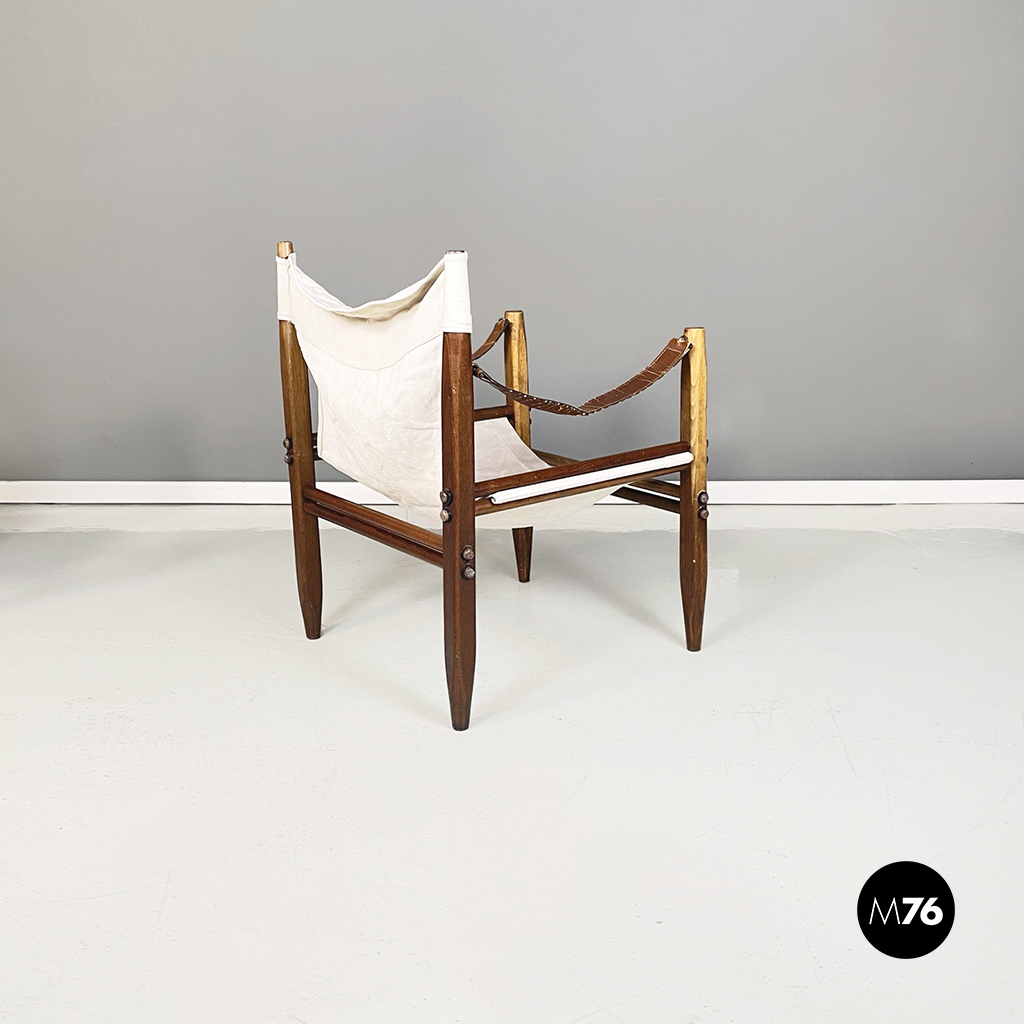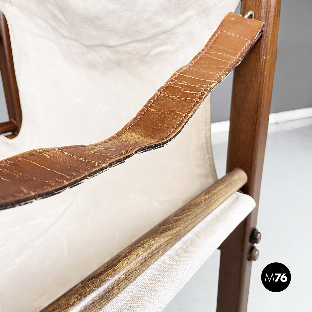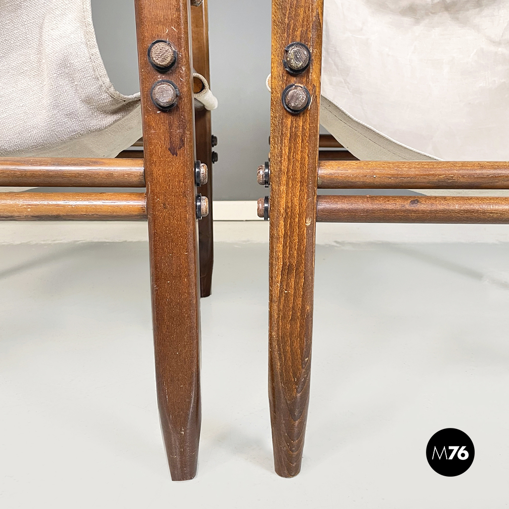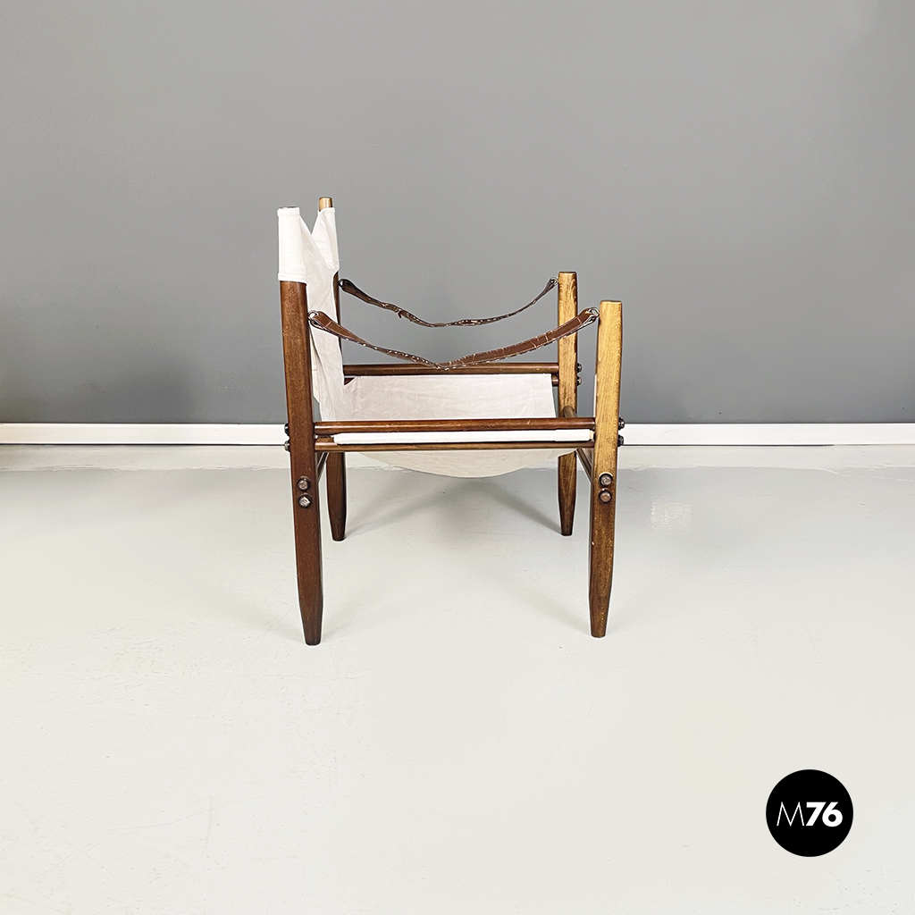 Coppia di poltrone modello Oasi 85 conosciute anche come Safari in tessuto beige e legno. La seduta e lo schienale sono composti da un unico tessuto fissata alla struttura. I braccioli sono realizzati con cinghie di cuoio marrone e piccole bielle in metallo. La struttura è in legno ed è completamente smontabile.