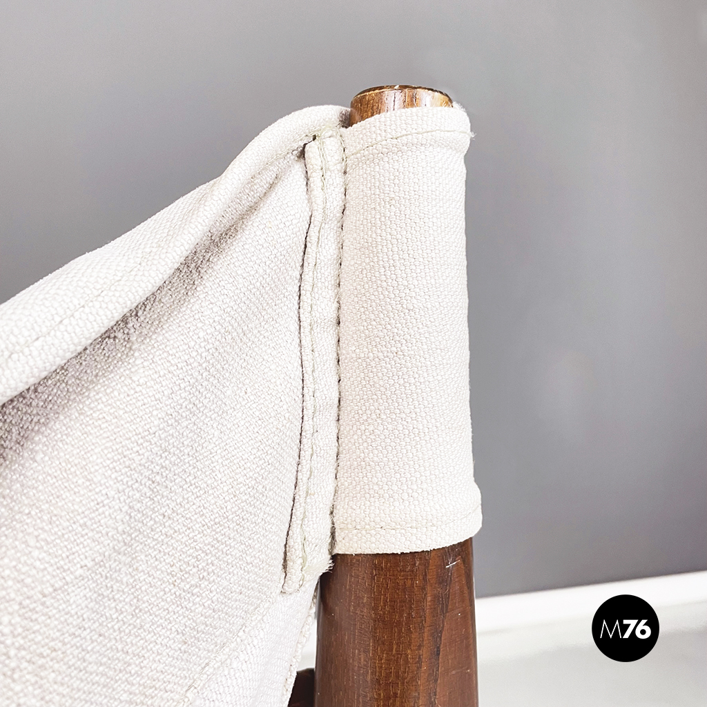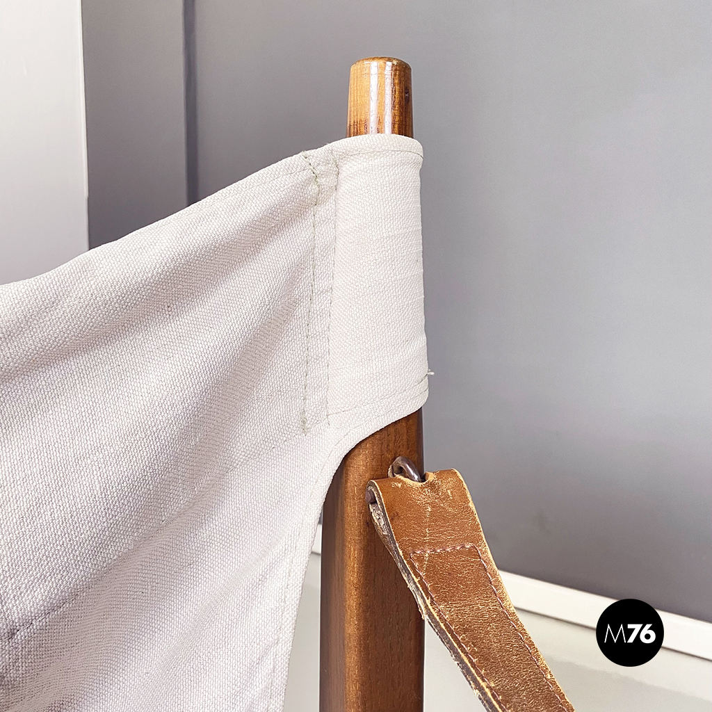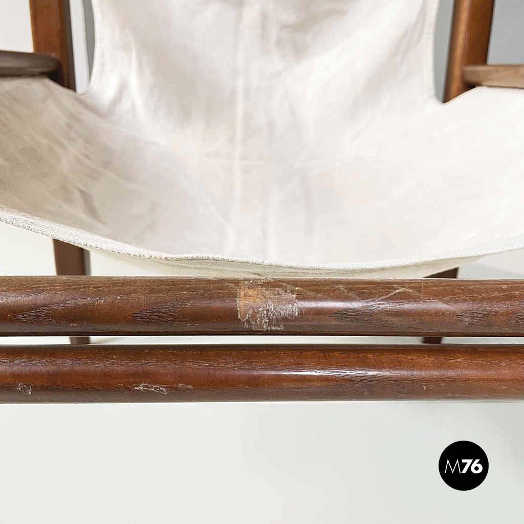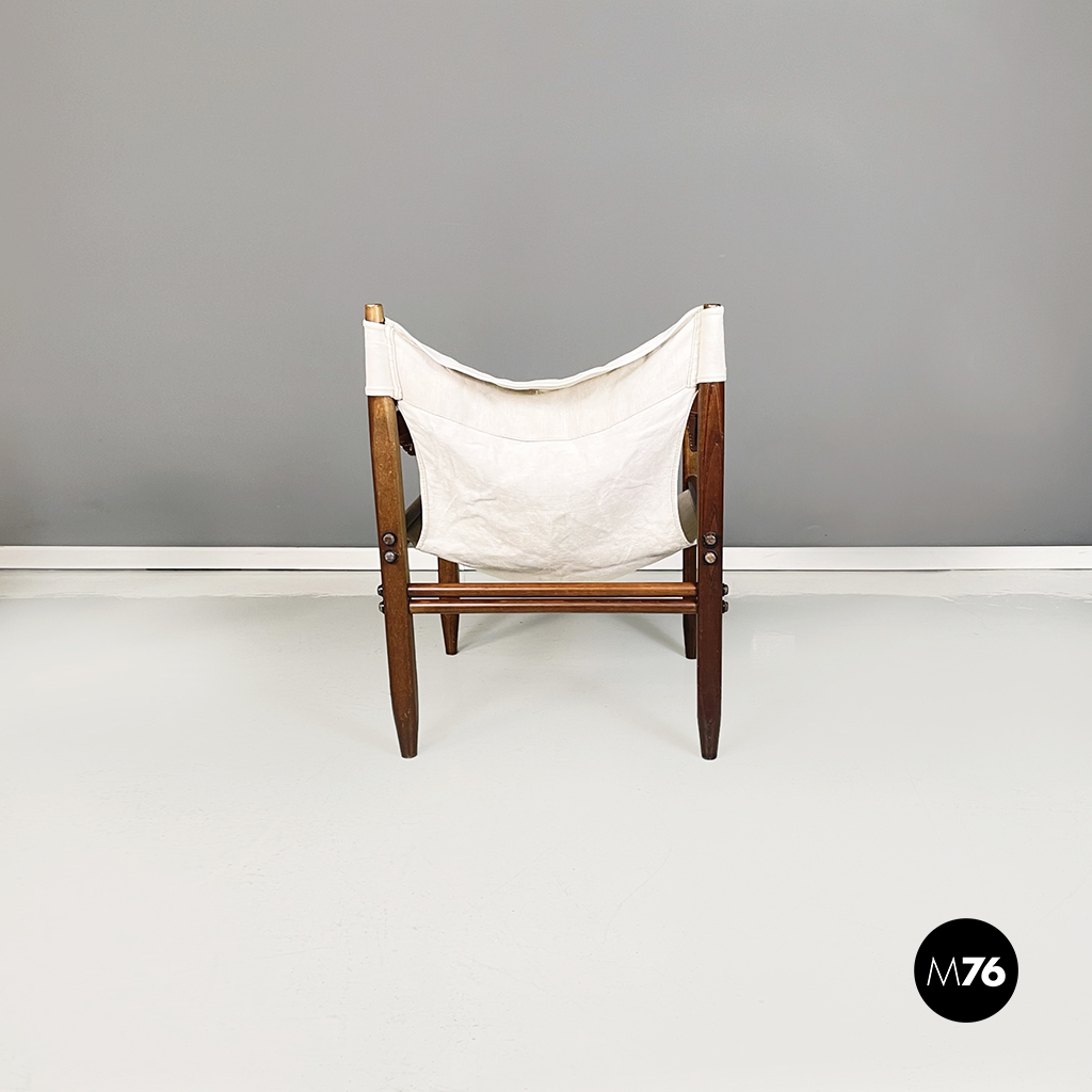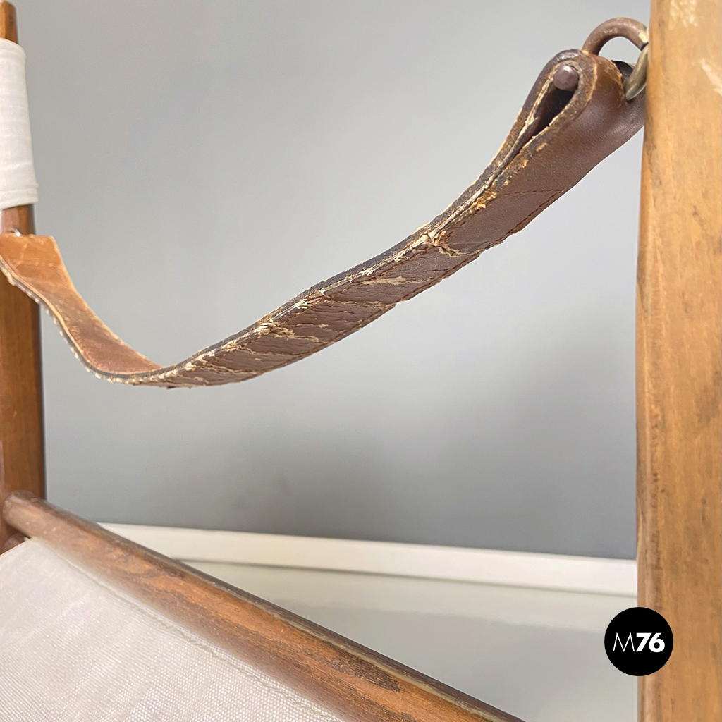 Coppia di poltrone modello Oasi 85 conosciute anche come Safari in tessuto beige e legno. La seduta e lo schienale sono composti da un unico tessuto fissata alla struttura. I braccioli sono realizzati con cinghie di cuoio marrone e piccole bielle in metallo. La struttura è in legno ed è completamente smontabile.