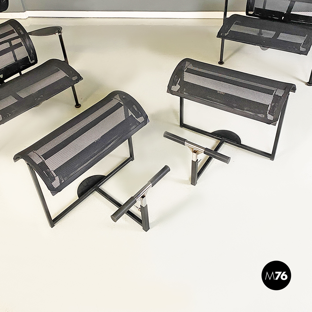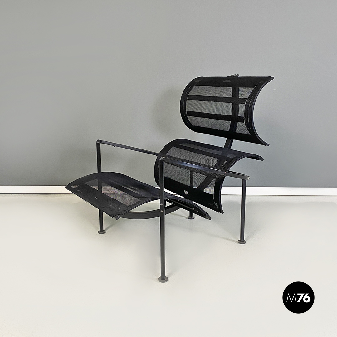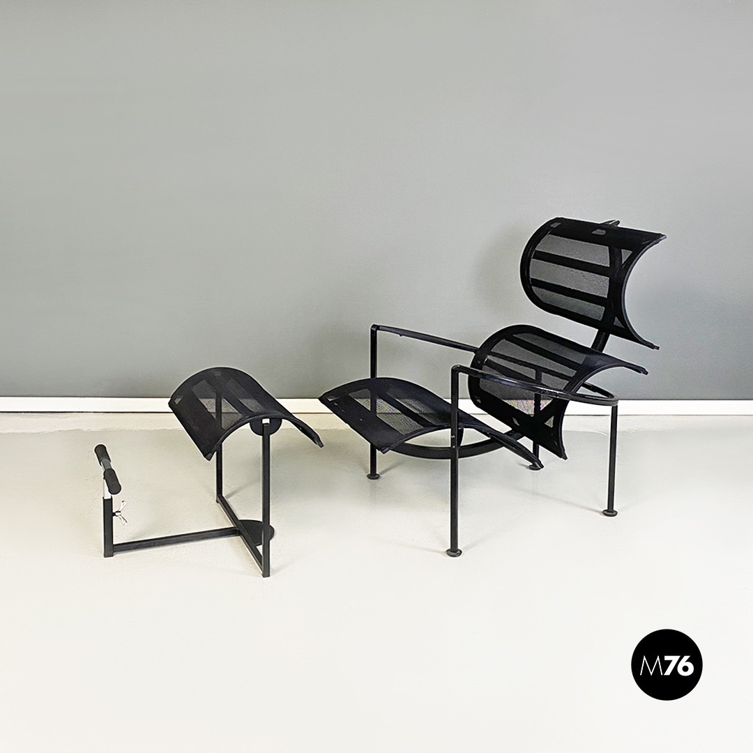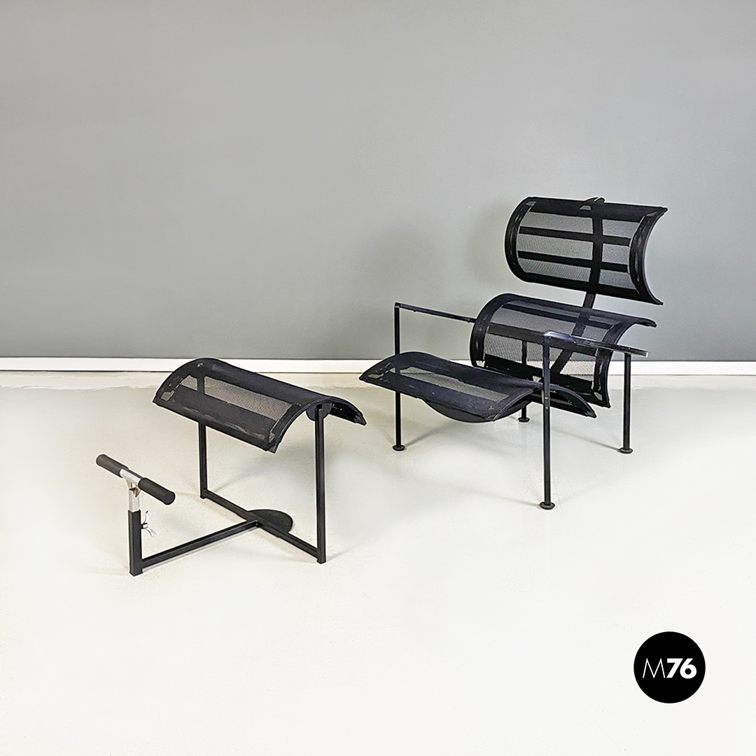 Poltrone con poggiapiedi modello Signorina Chan con struttura in metallo curvato verniciato nero e seduta composta da una rete in poliestere. Poggiapiedi con caratteristico supporto regolabile in altezza simile ad un manubrio.