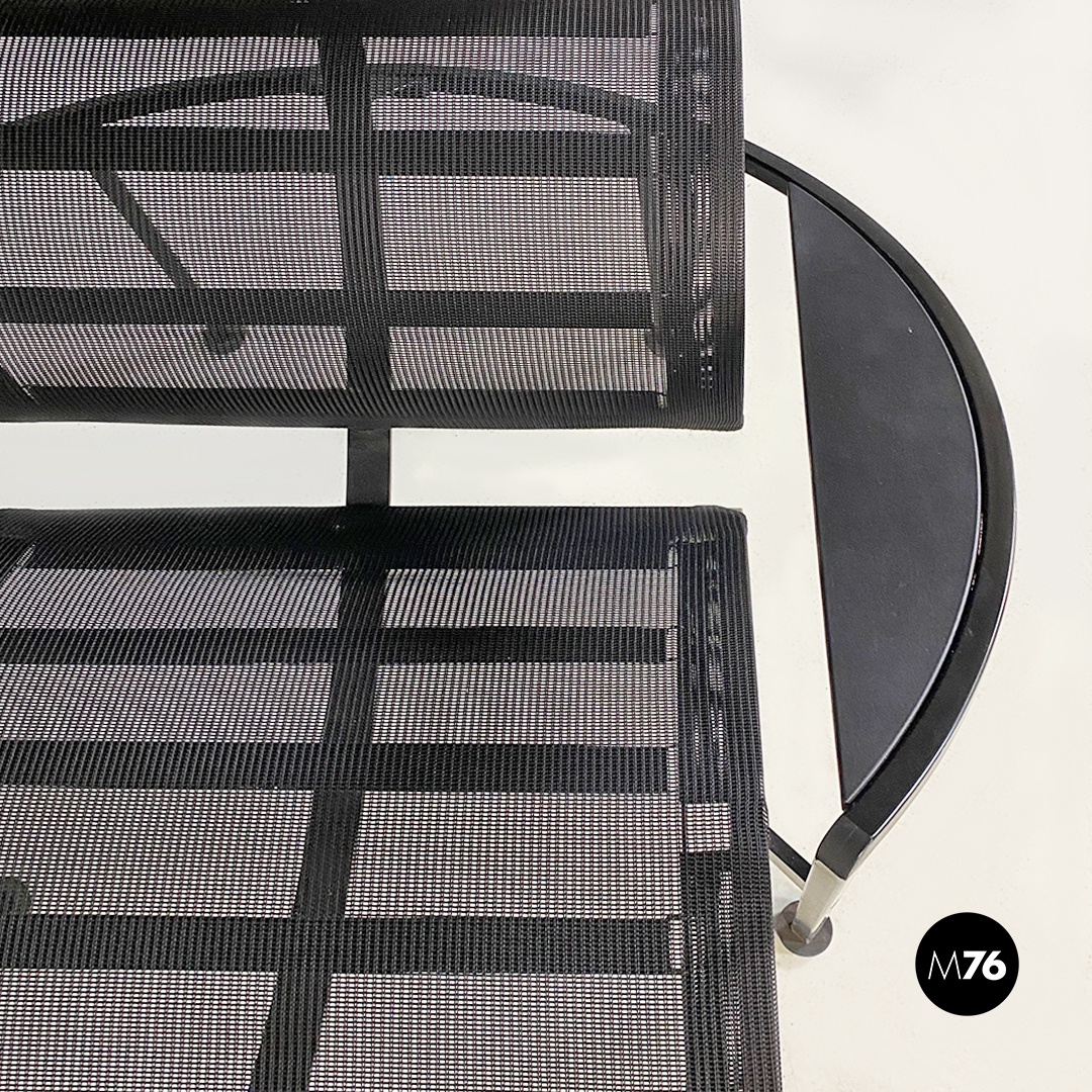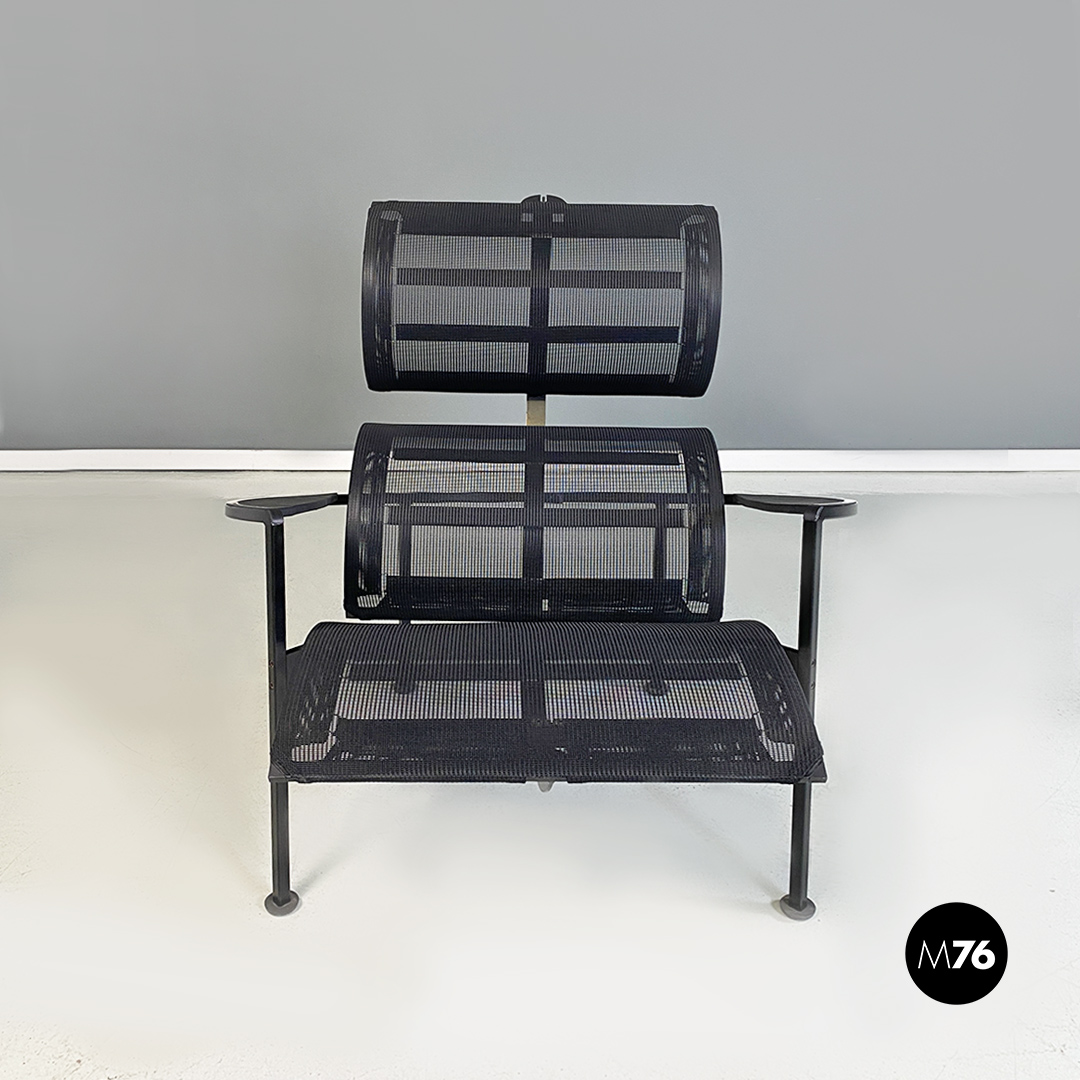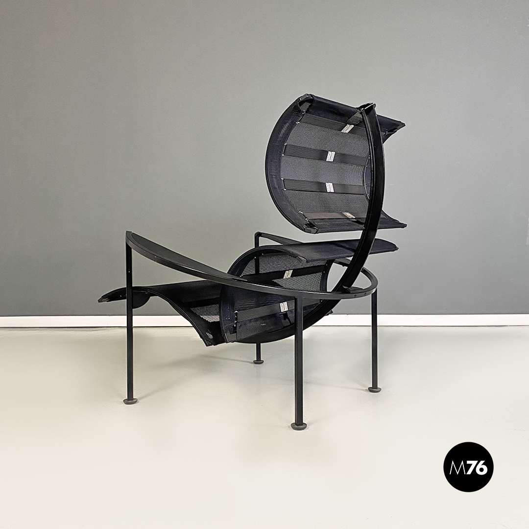 Poltrone con poggiapiedi modello Signorina Chan con struttura in metallo curvato verniciato nero e seduta composta da una rete in poliestere. Poggiapiedi con caratteristico supporto regolabile in altezza simile ad un manubrio.