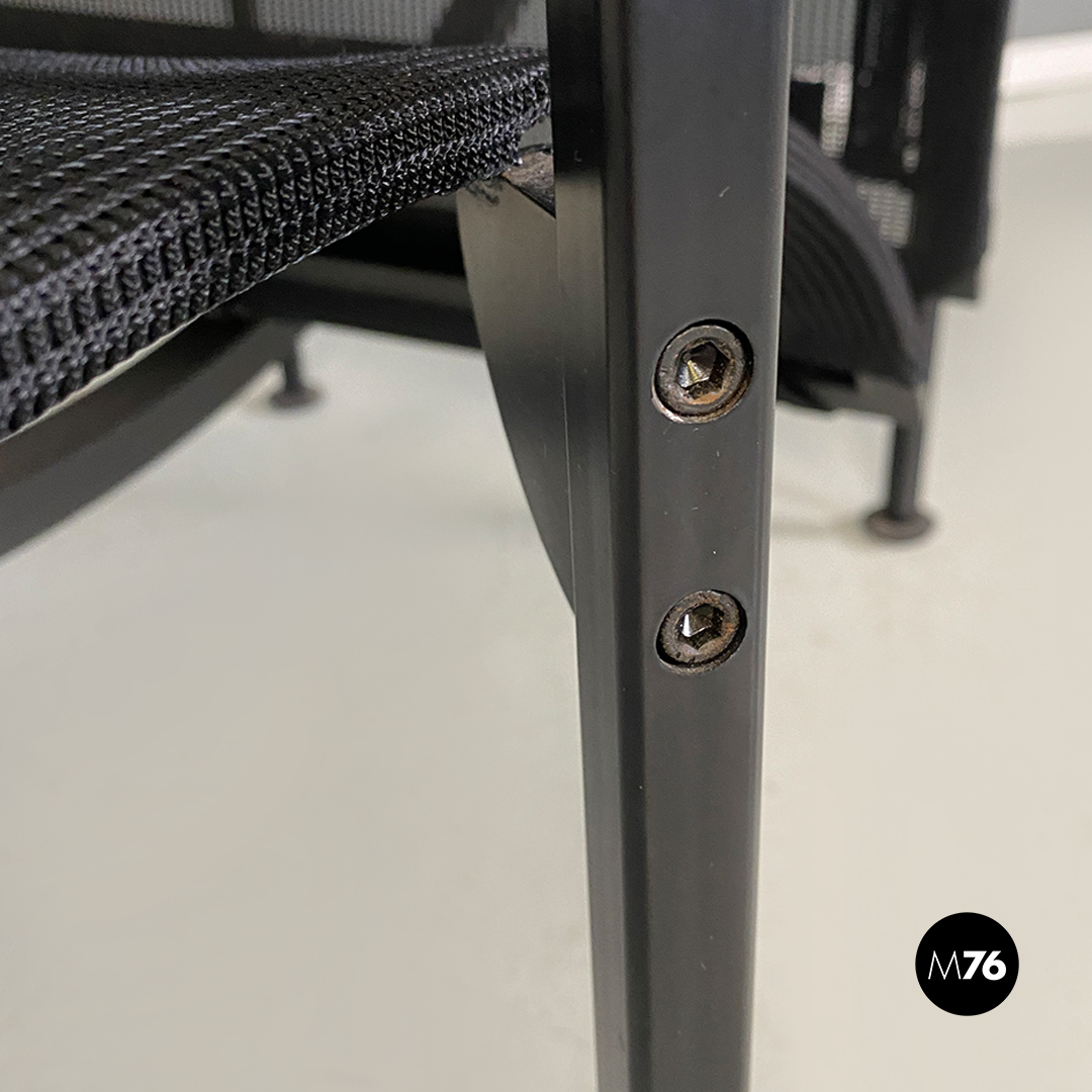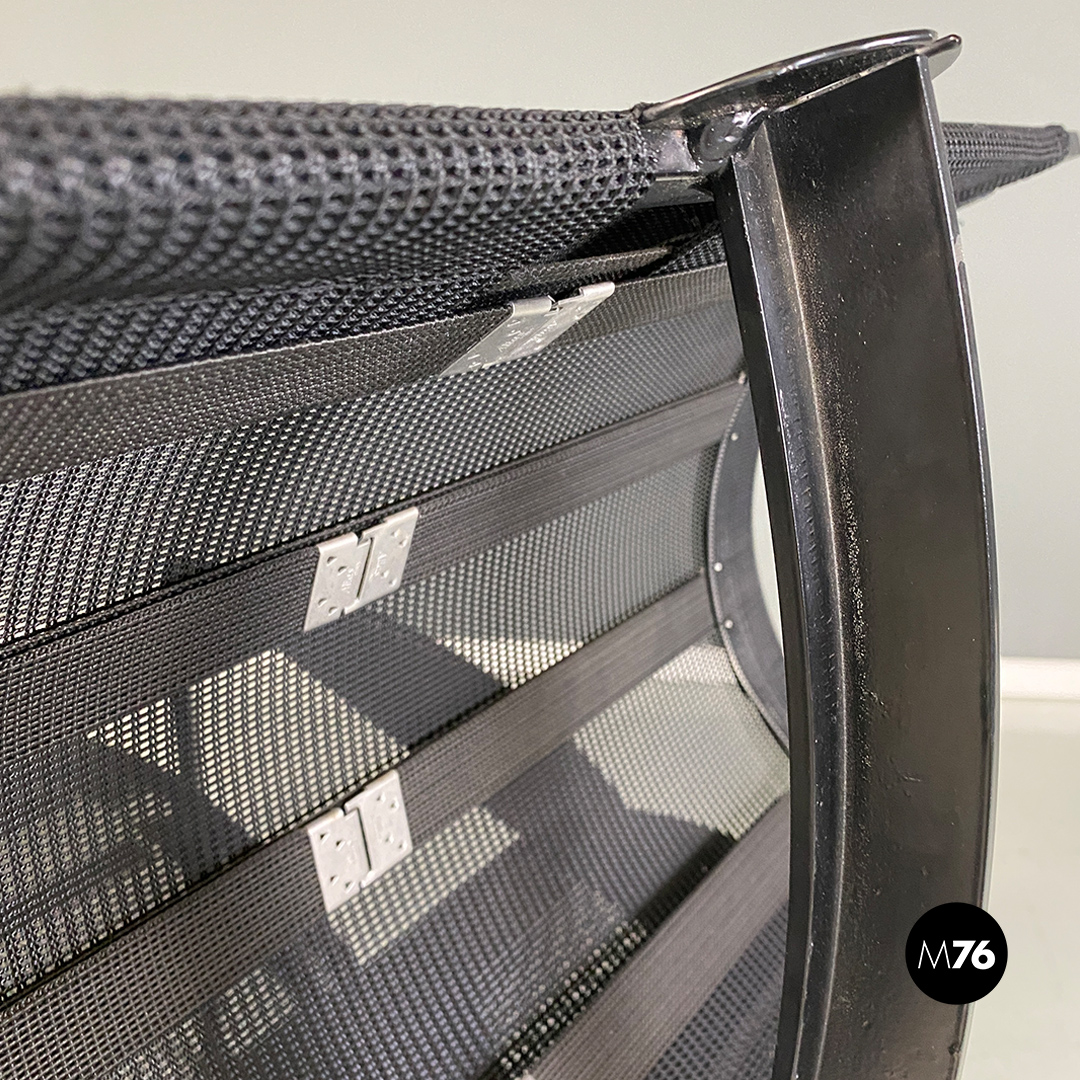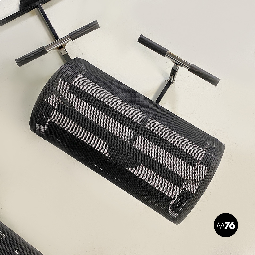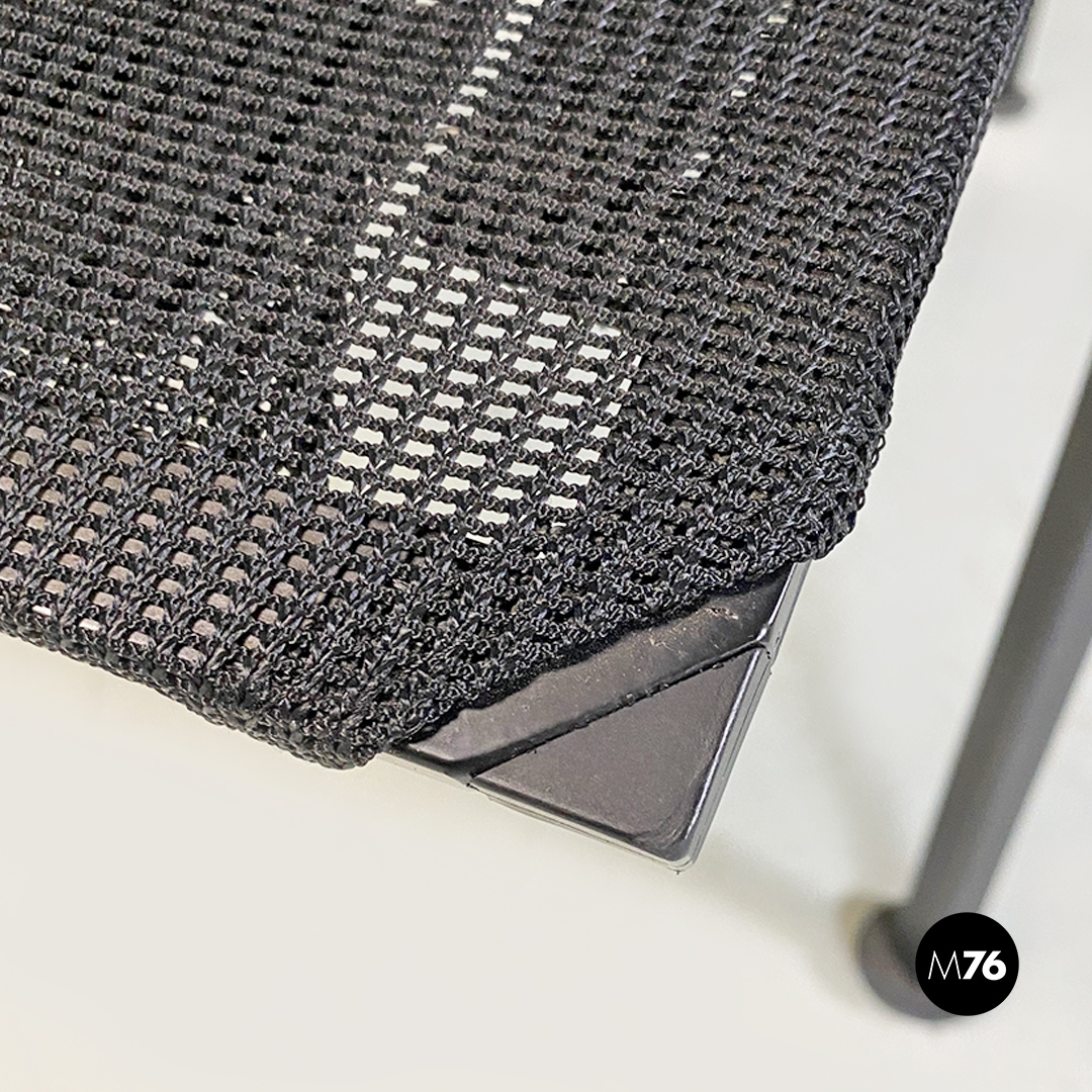 Poltrone con poggiapiedi modello Signorina Chan con struttura in metallo curvato verniciato nero e seduta composta da una rete in poliestere. Poggiapiedi con caratteristico supporto regolabile in altezza simile ad un manubrio.
