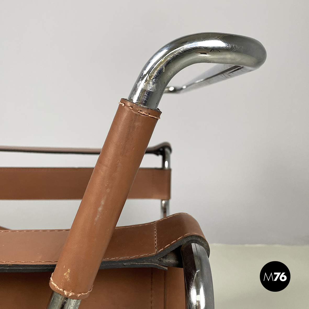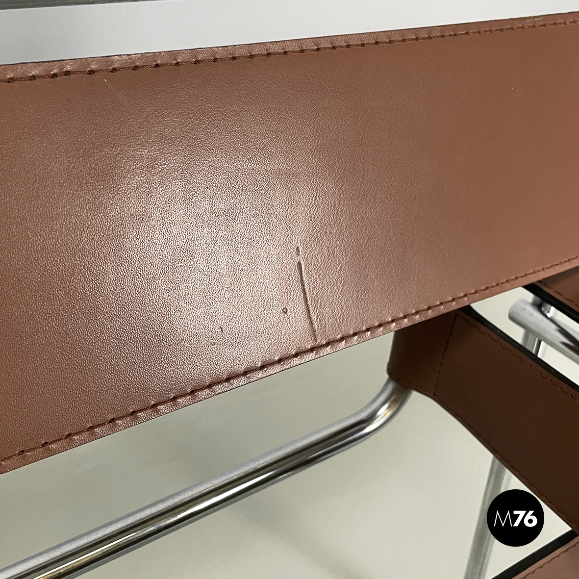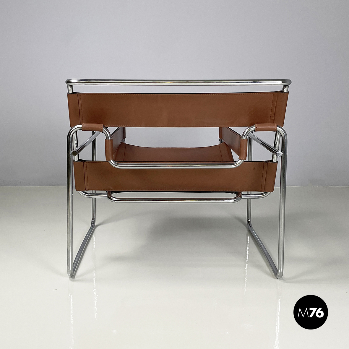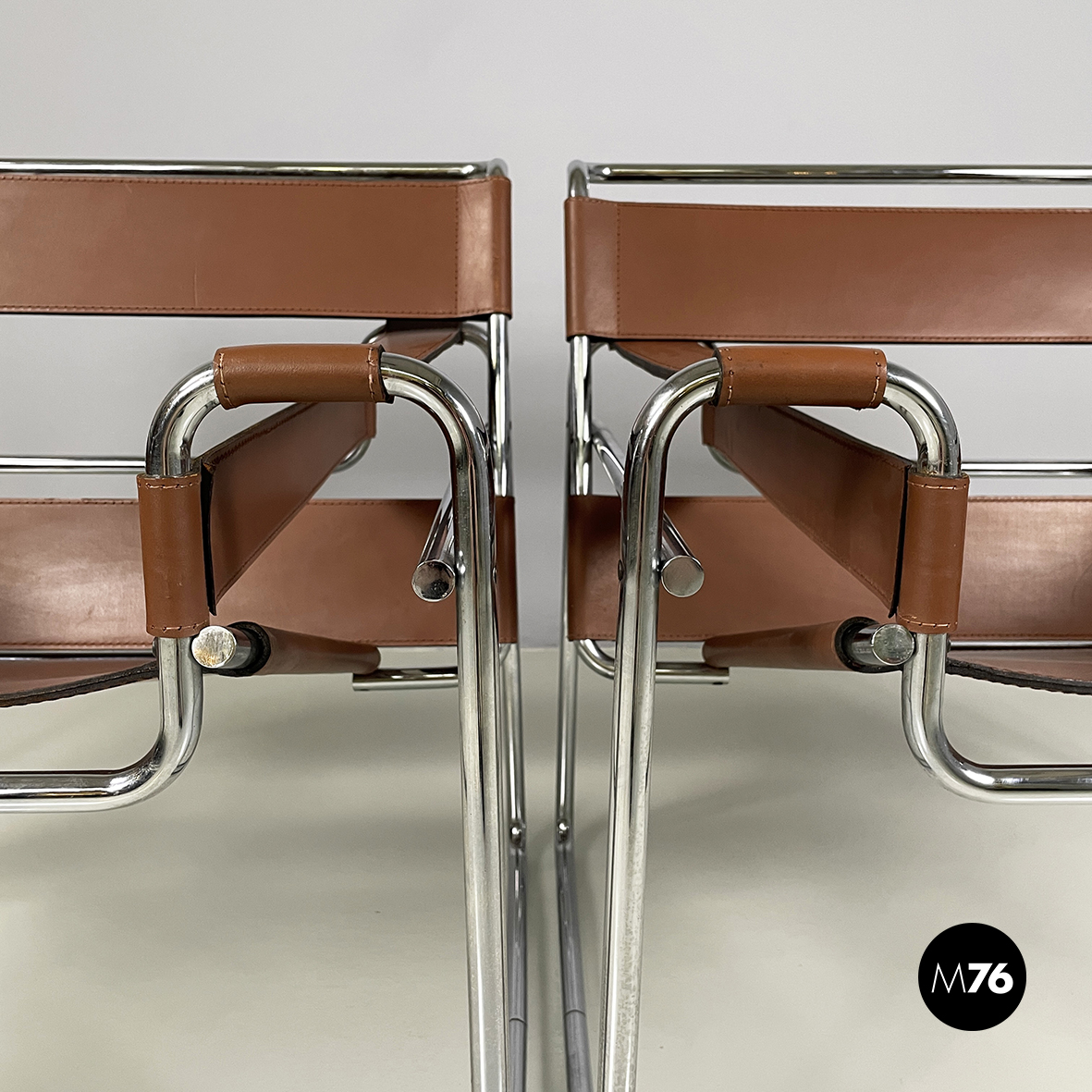 Coppia di poltrone modello Wassily o B3 in pelle marrone. Lo schienale i braccioli e la seduta sono a fasce interamente in cuoio con cuciture a vista. La struttura è in tubolare di acciaio cromato.