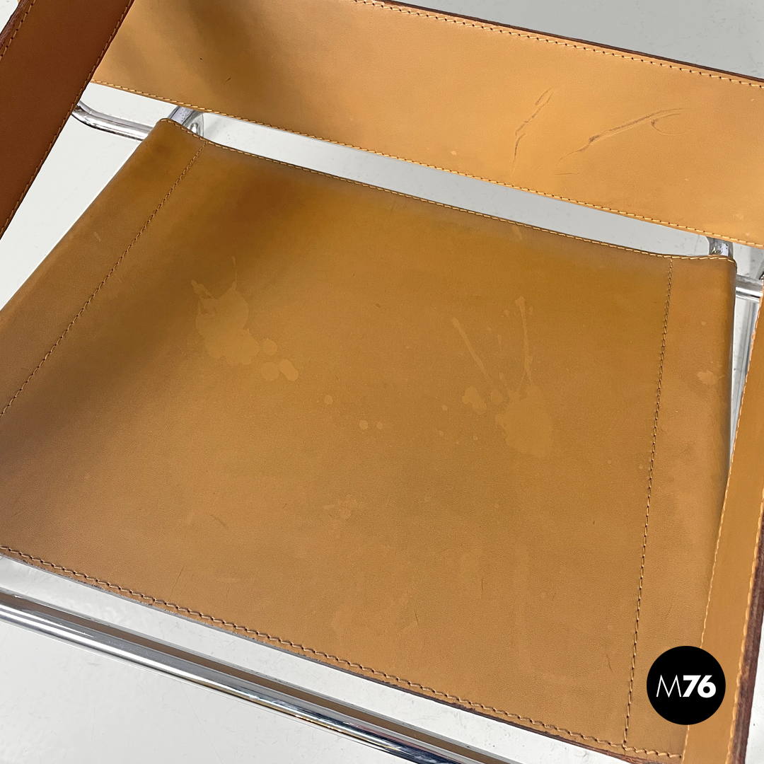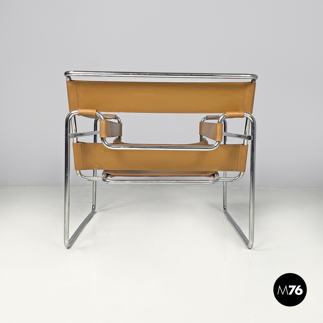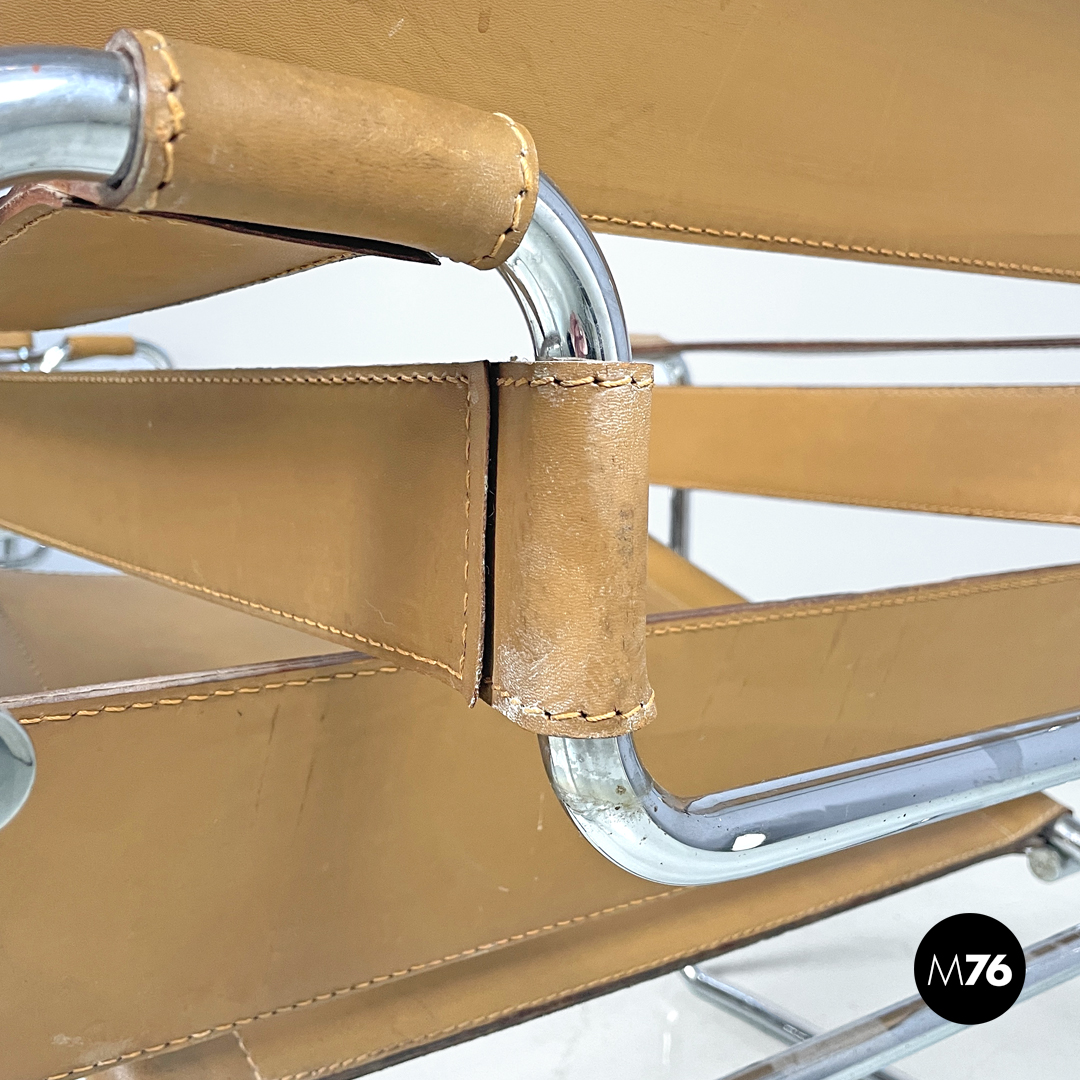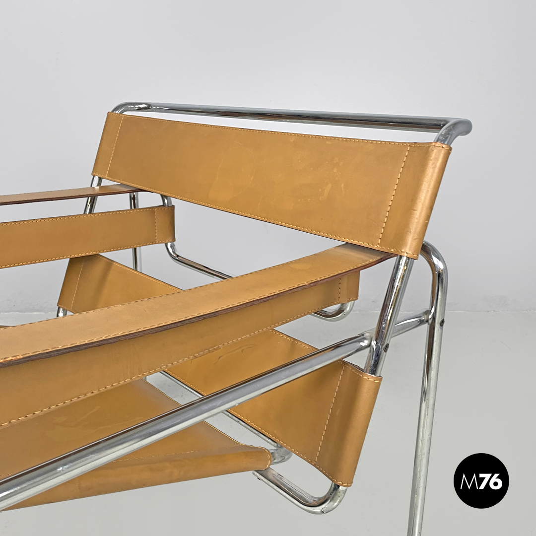 armchairs model Wassily or B3 in light brown leather. The backrest armrests and seat are made of bands entirely in leather with visible stitching. The structure is in chromed steel tubing.Produced by Gavina in 1970s and designed by Marcel Breuer. Signature engraved in the leather under the seat.