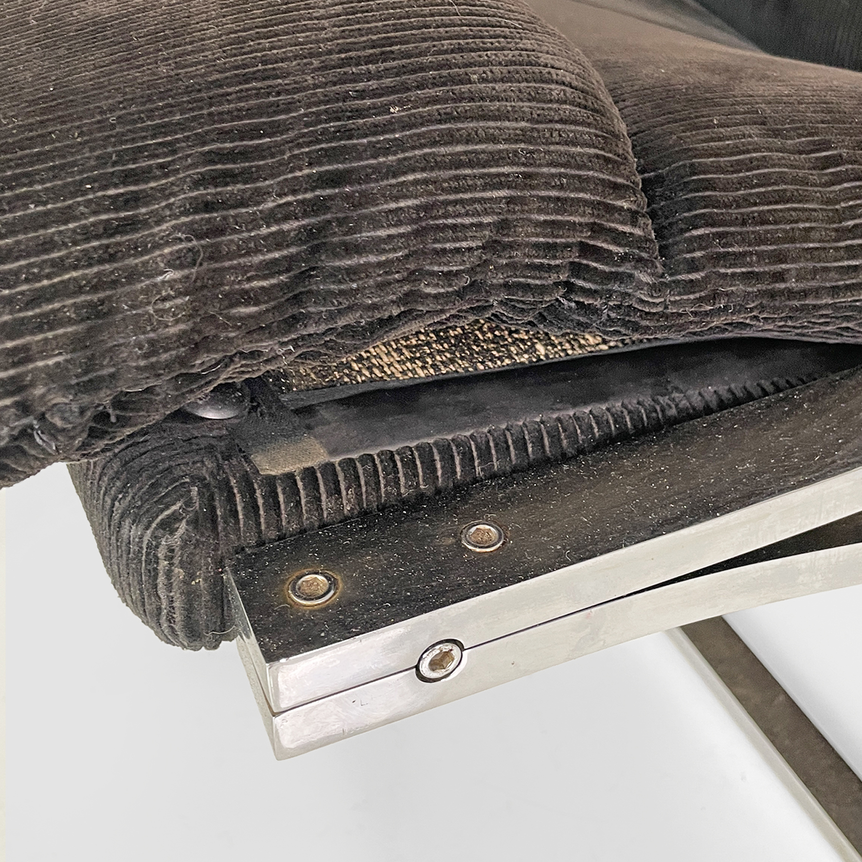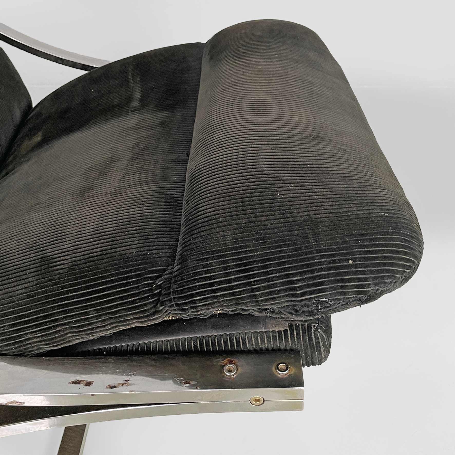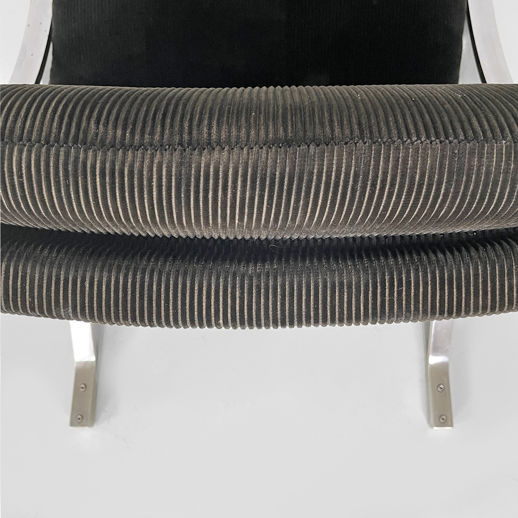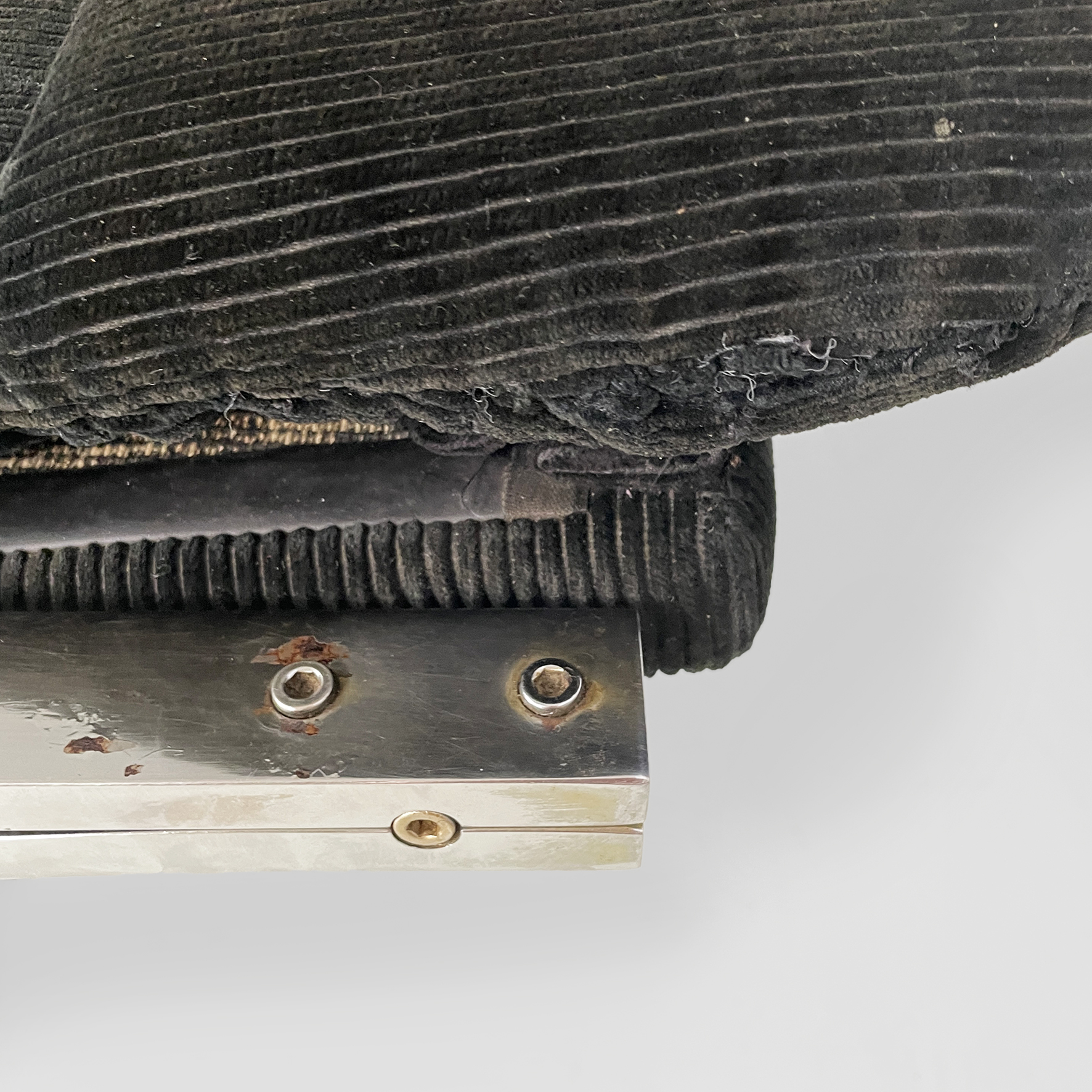 Coppia di poltrone Zeta in acciaio e rivestite in velluto a coste originale dell’epoca di colore marrone scuro, quasi nero. Struttura in metallo curvato e cromato, di gran peso e spessore. Seduta e schienale imbottiti e rivestiti nel loro originale tessuto di velluto a coste, a coprire la nuova imbottitura interna.