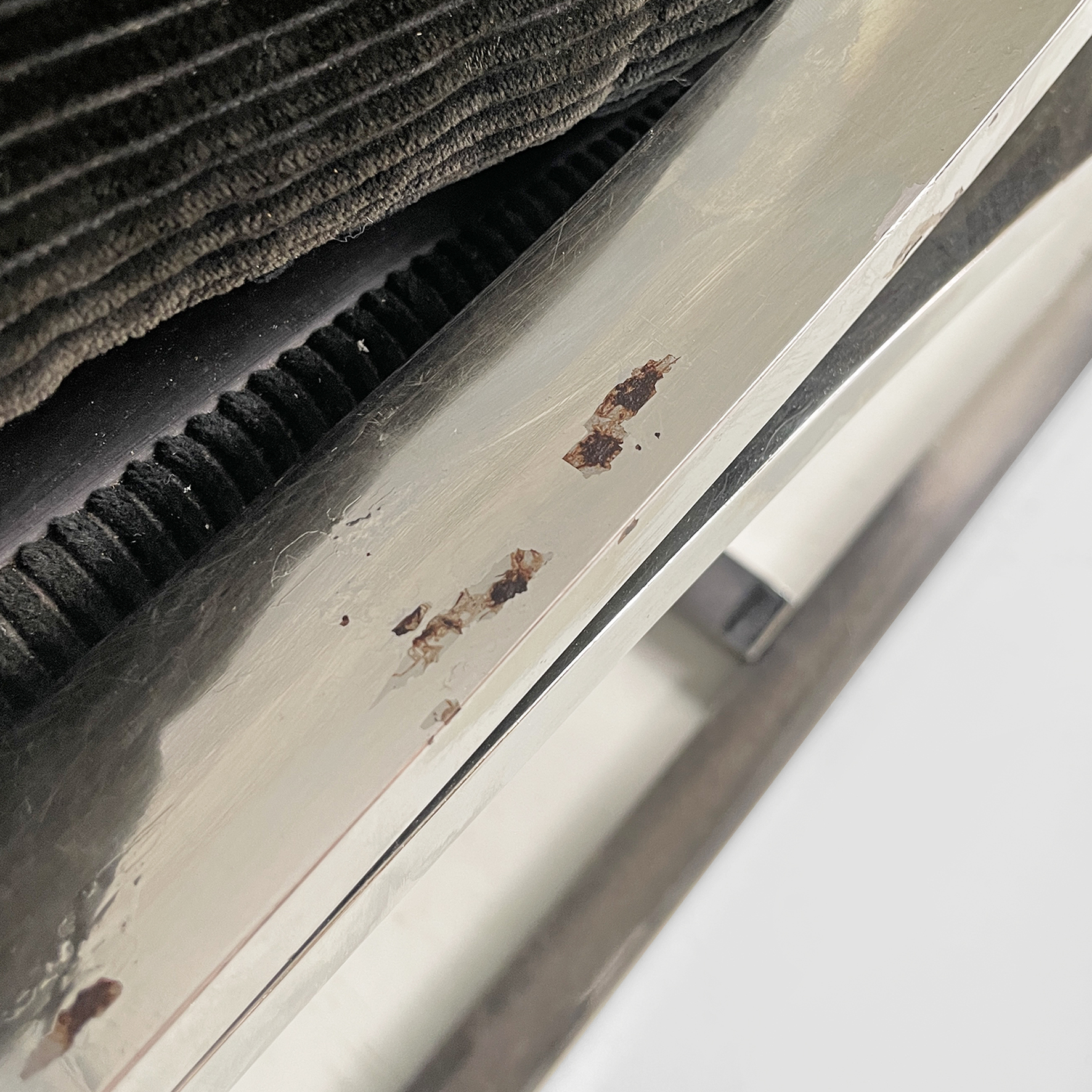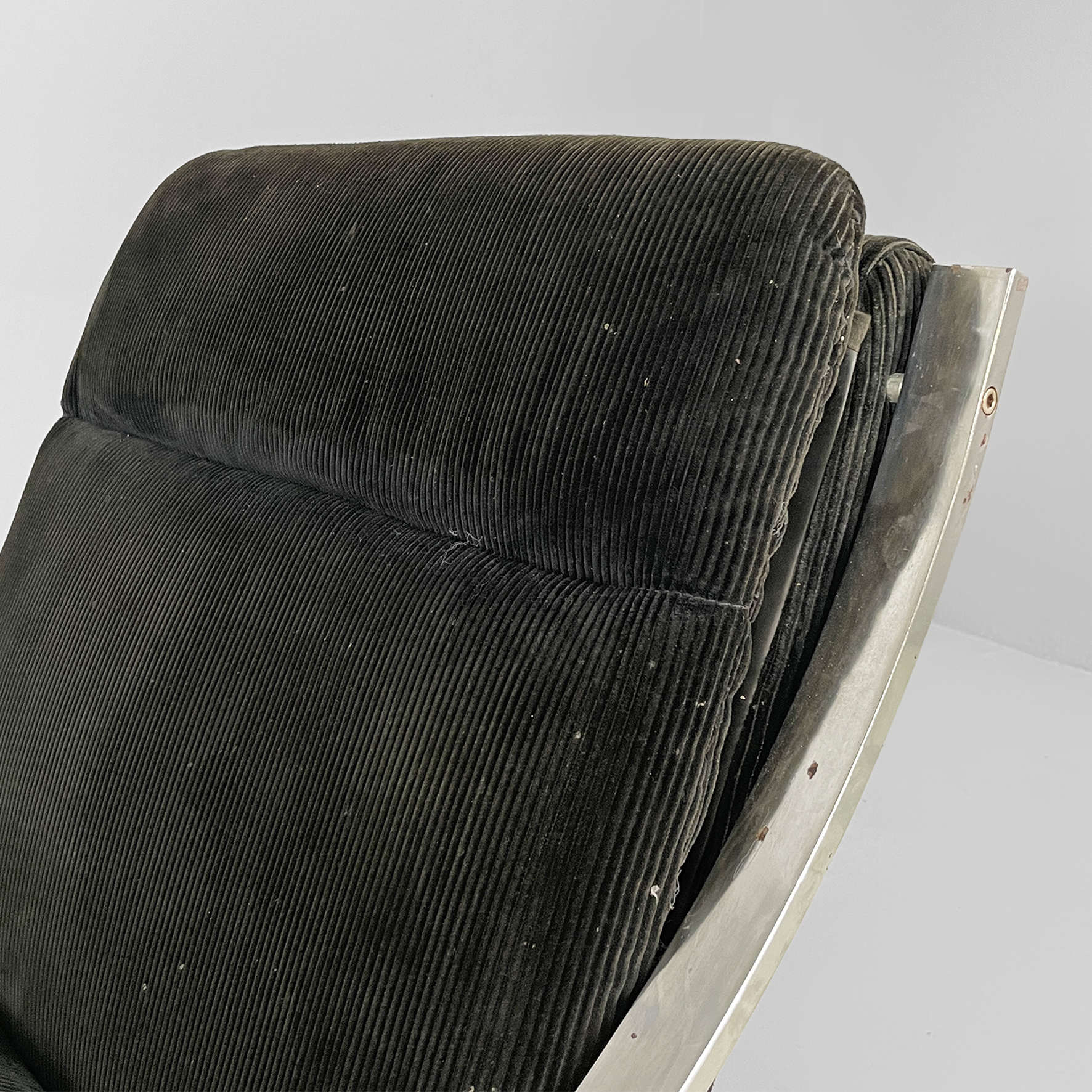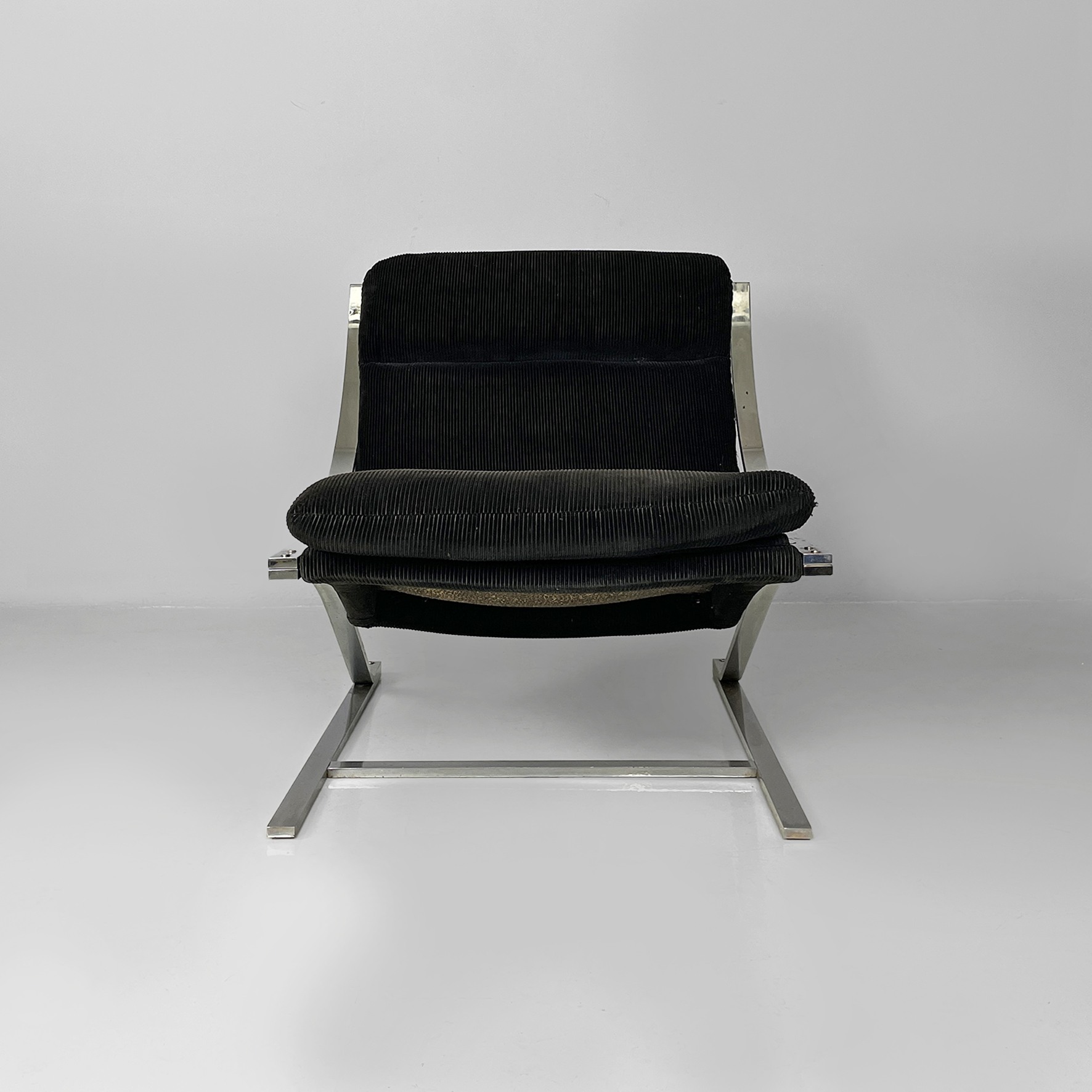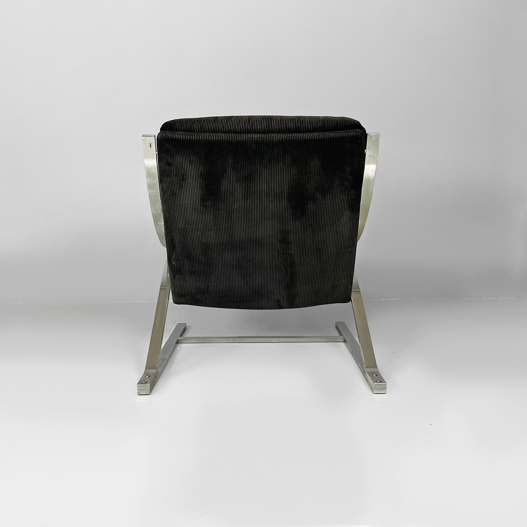 Coppia di poltrone Zeta in acciaio e rivestite in velluto a coste originale dell’epoca di colore marrone scuro, quasi nero. Struttura in metallo curvato e cromato, di gran peso e spessore. Seduta e schienale imbottiti e rivestiti nel loro originale tessuto di velluto a coste, a coprire la nuova imbottitura interna.