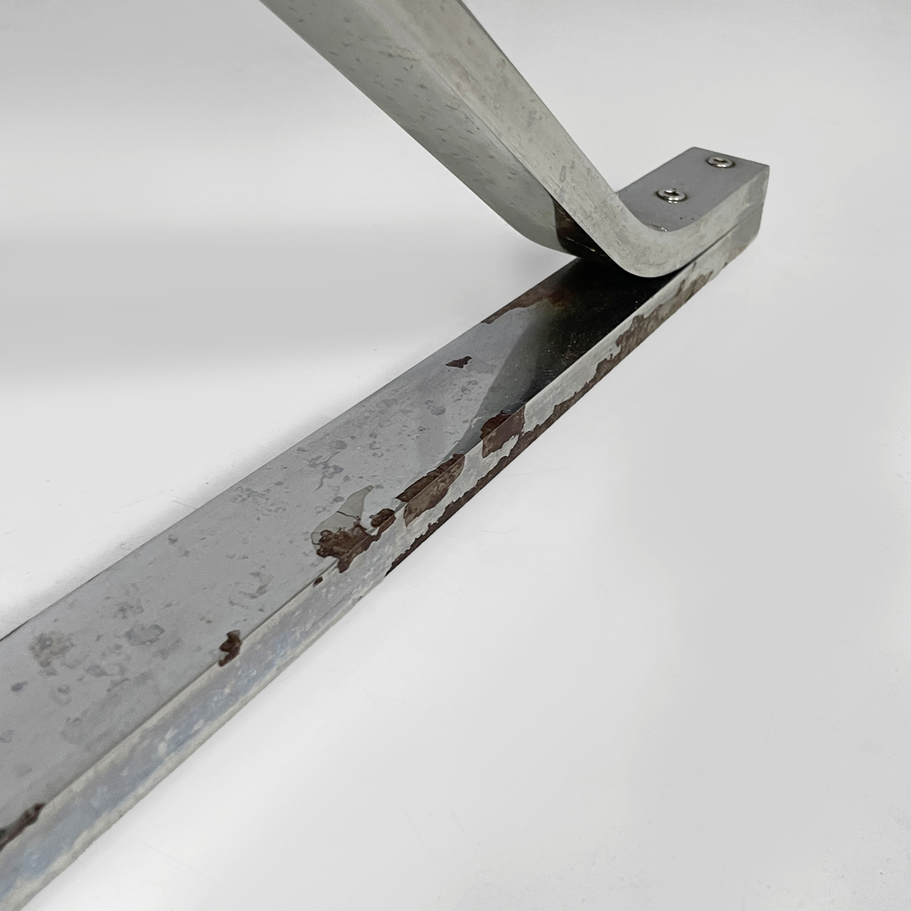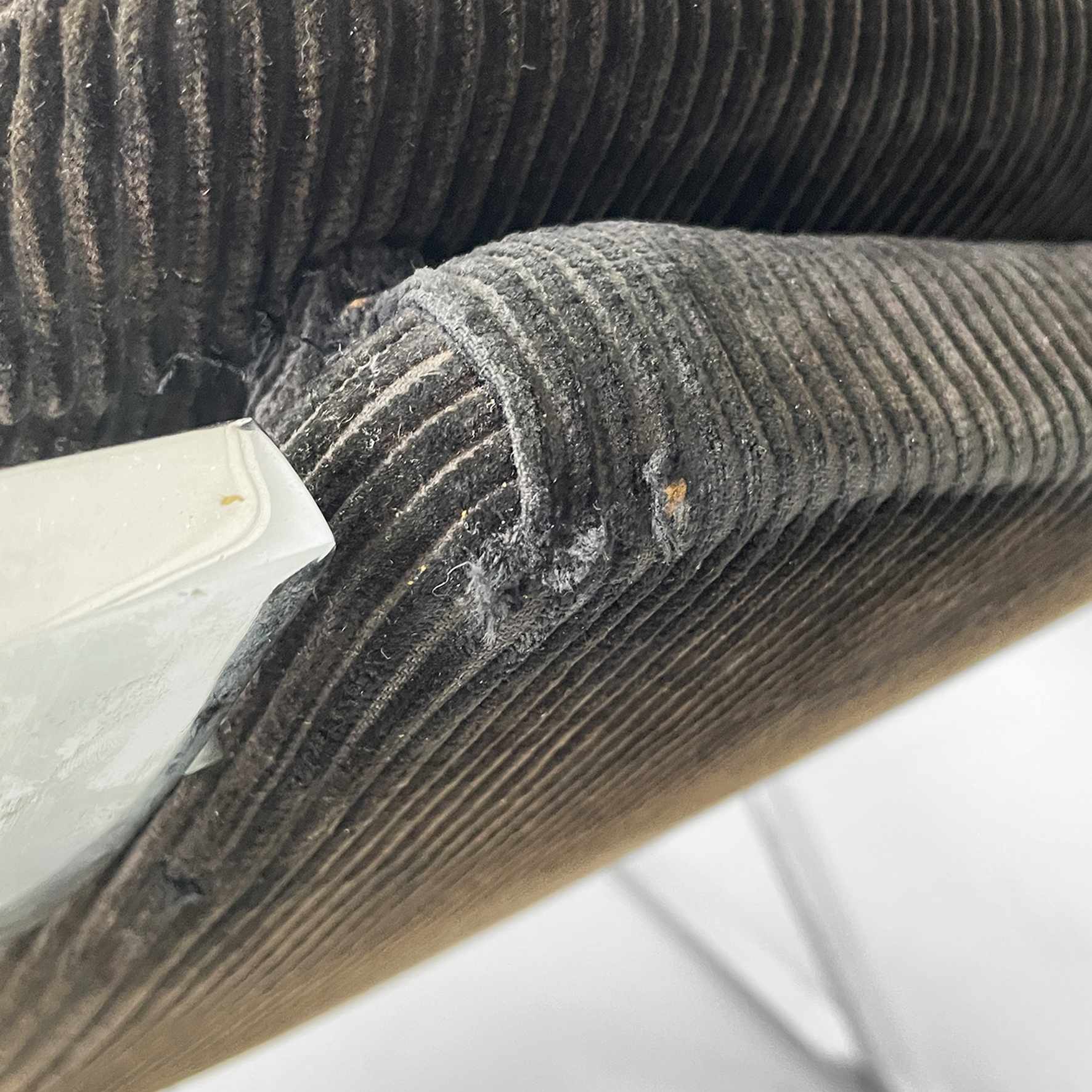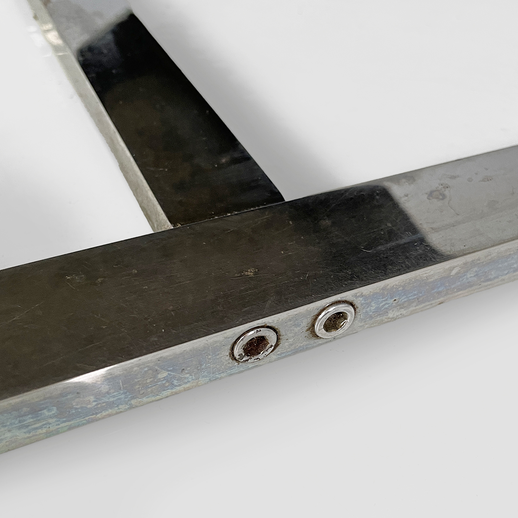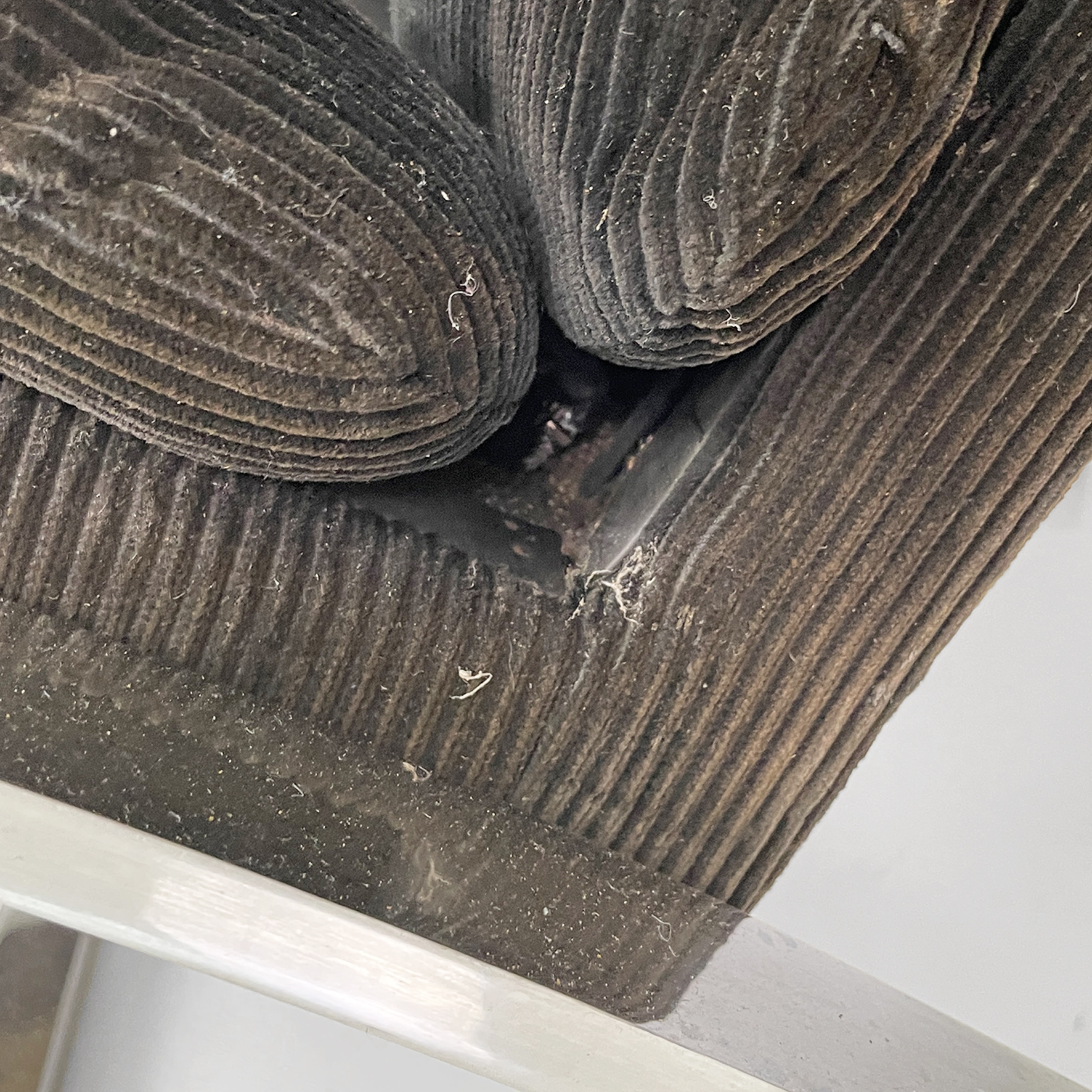 Coppia di poltrone Zeta in acciaio e rivestite in velluto a coste originale dell’epoca di colore marrone scuro, quasi nero. Struttura in metallo curvato e cromato, di gran peso e spessore. Seduta e schienale imbottiti e rivestiti nel loro originale tessuto di velluto a coste, a coprire la nuova imbottitura interna.