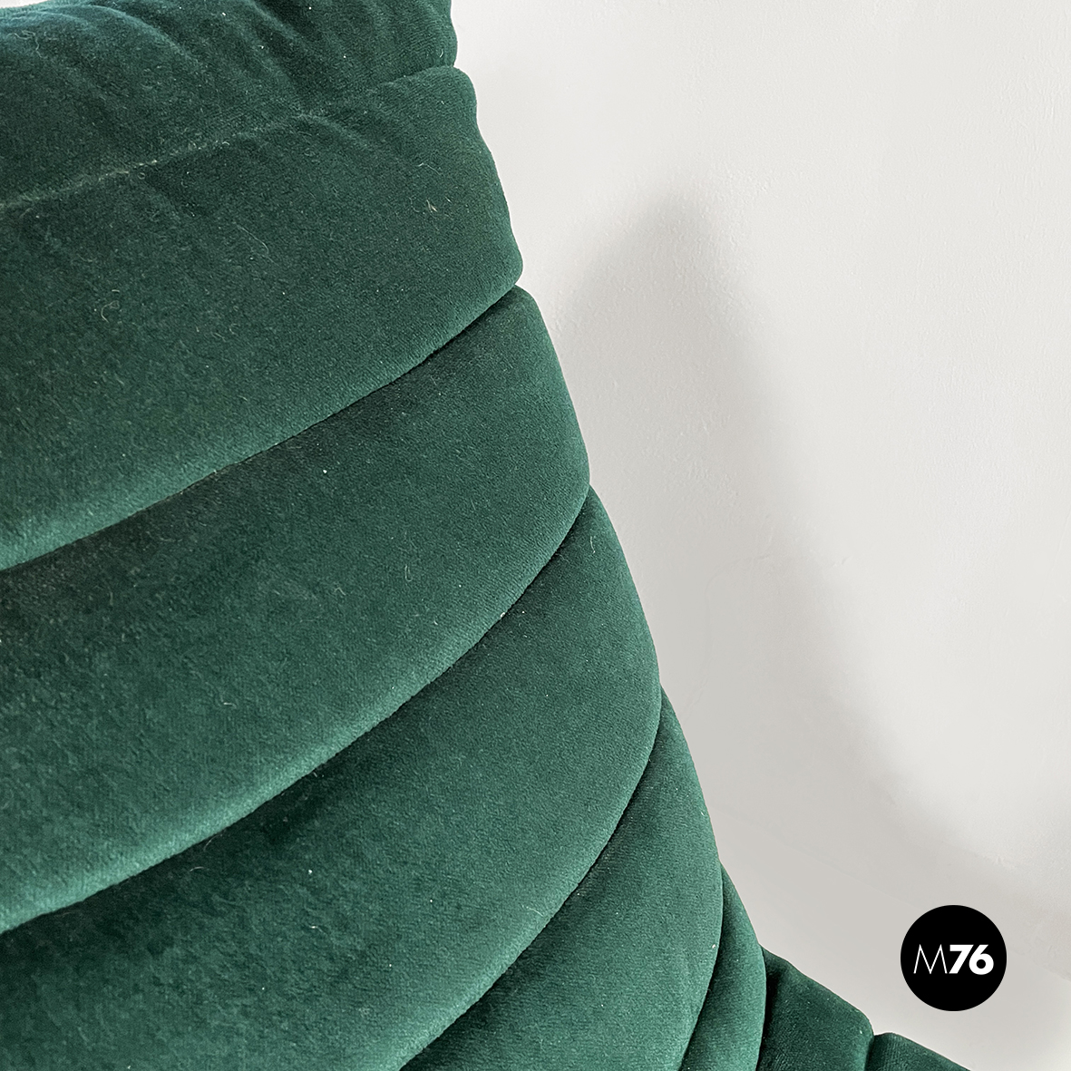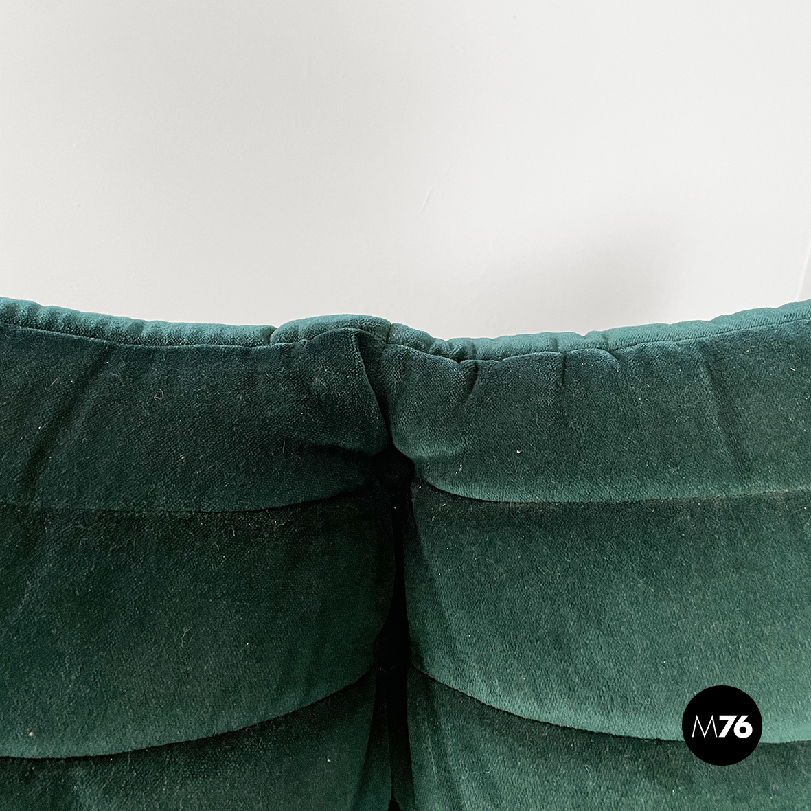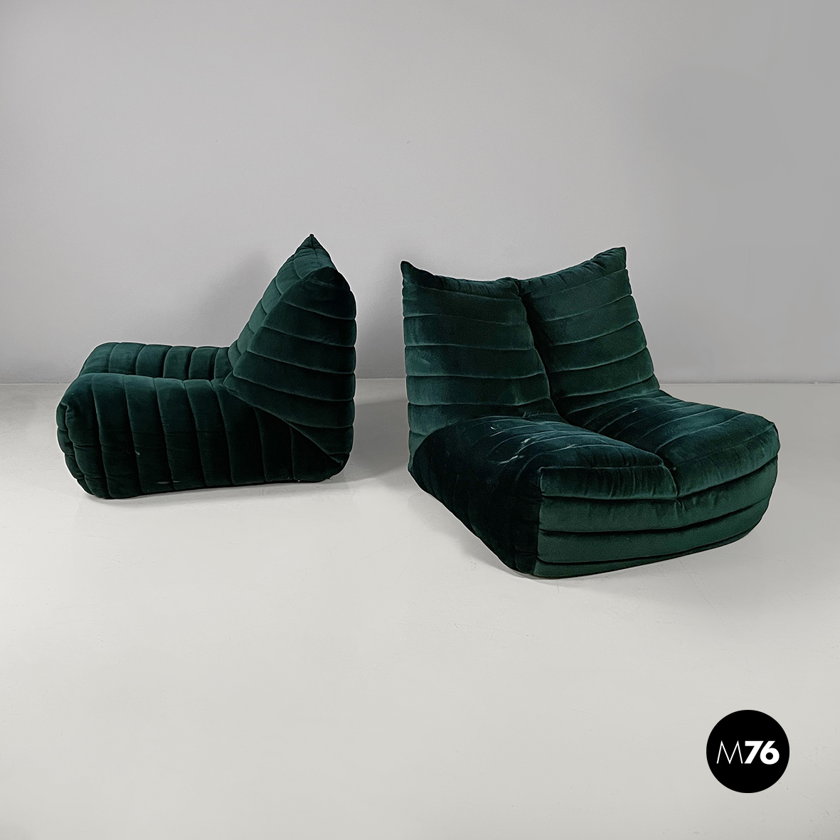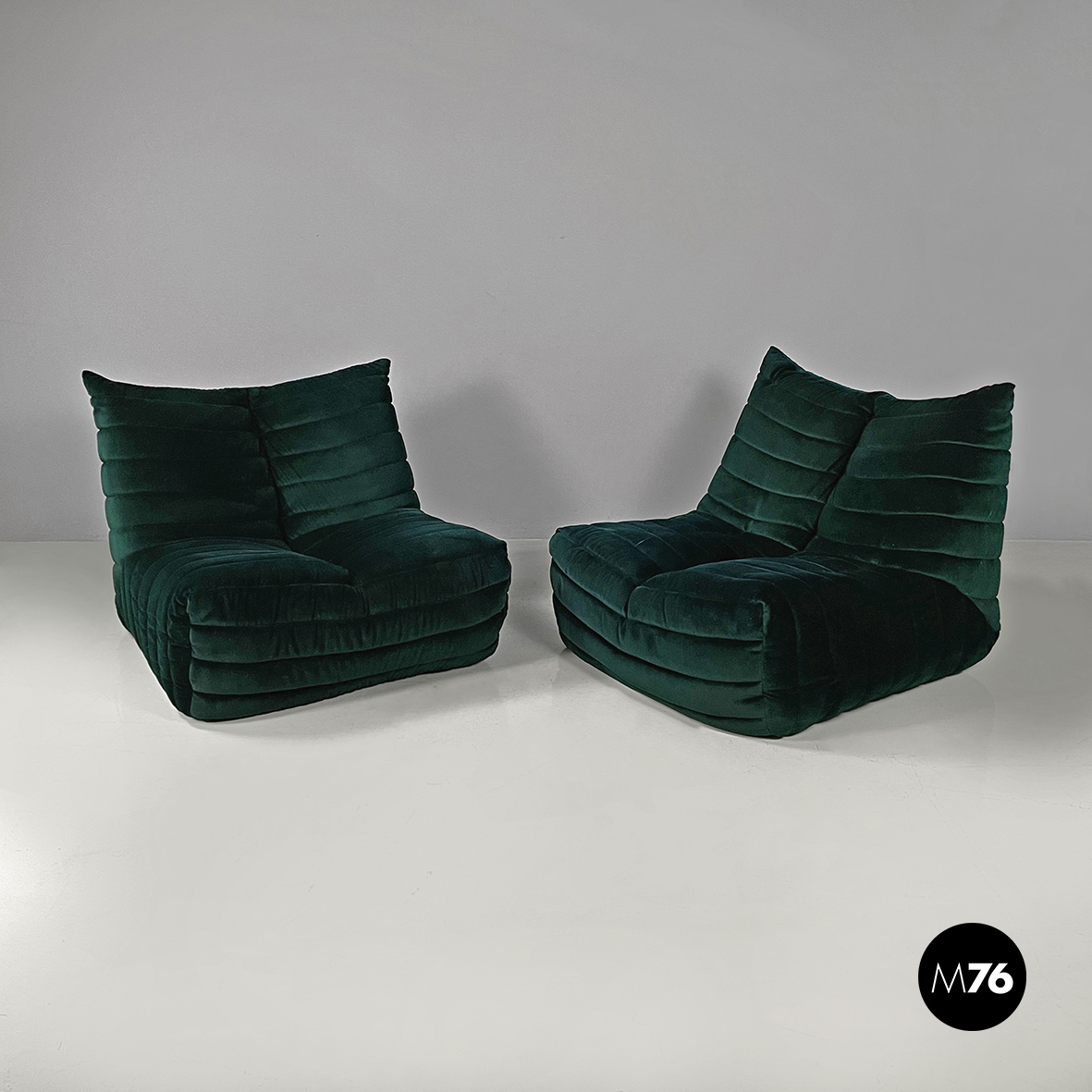 Coppia di poltrone modello Zozo interamente imbottite e rivestite in velluto verde bosco. La seduta e lo schienale presentano una forma morbida e arrotondata con le caratteristiche arricciatura di questo design.
