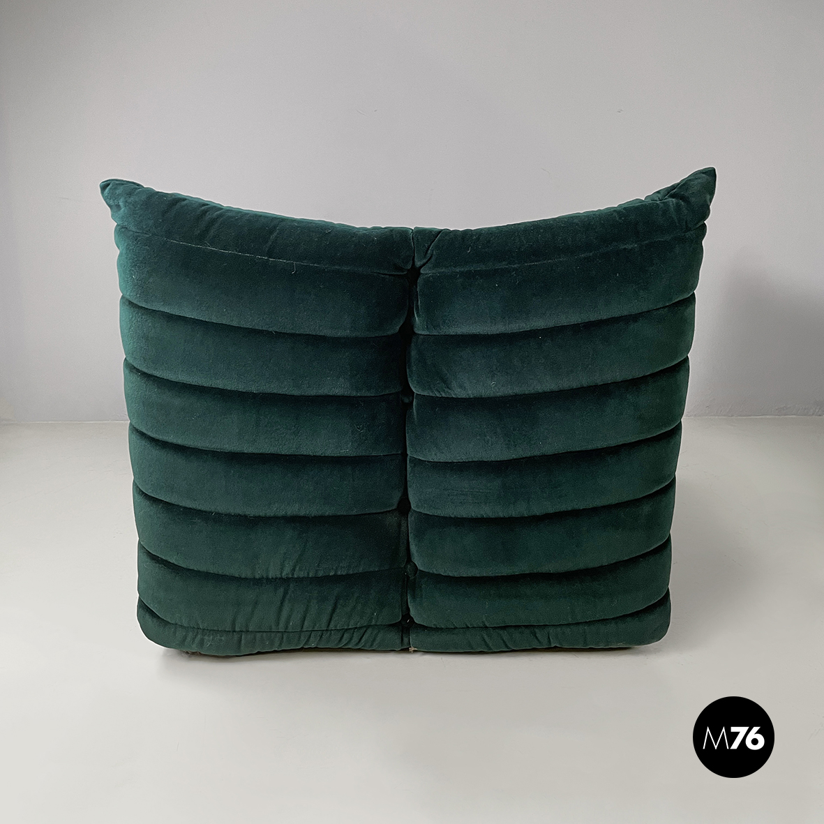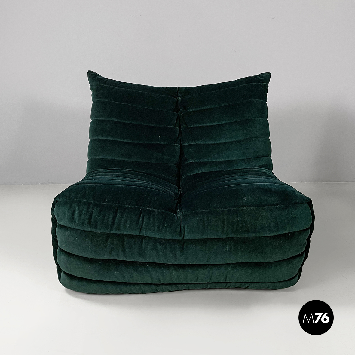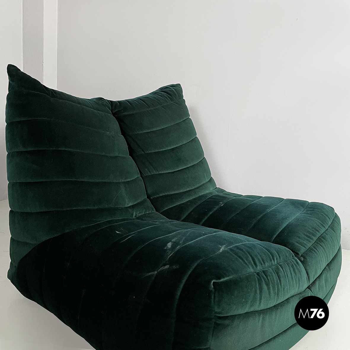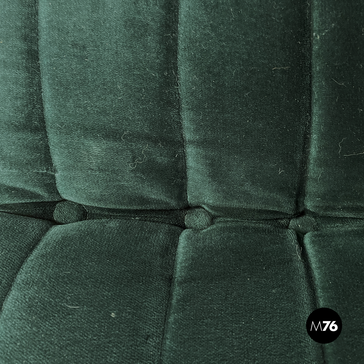 Coppia di poltrone modello Zozo interamente imbottite e rivestite in velluto verde bosco. La seduta e lo schienale presentano una forma morbida e arrotondata con le caratteristiche arricciatura di questo design.