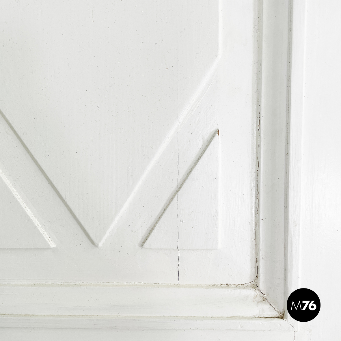 Porta a doppia anta a battente interamente in legno verniciato bianco. Le due ante decorate con pattern geometrici presentano una coppia di maniglie finemente lavorate in ottone e serratura tonda anche essa in ottone. Infissi lavorati in legno verniciato bianco.