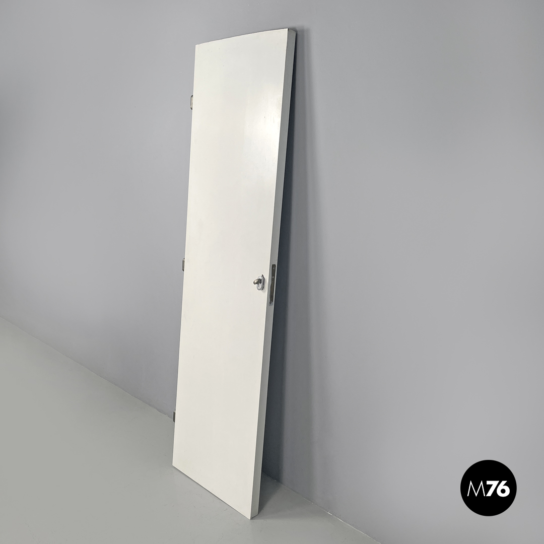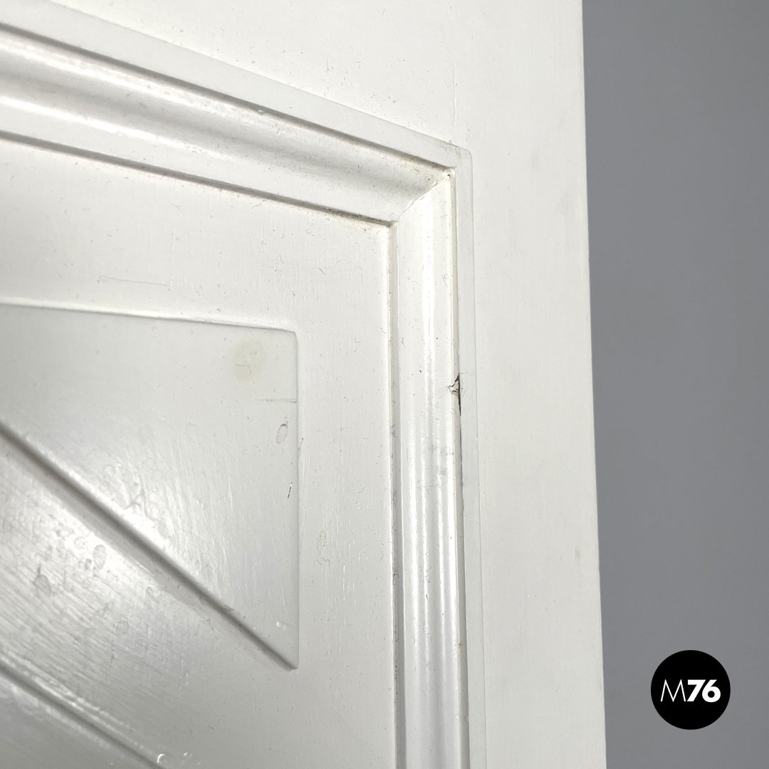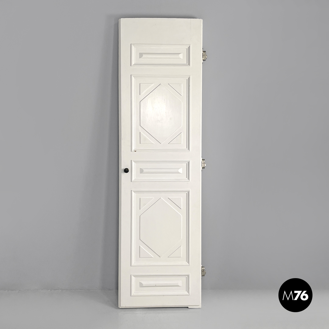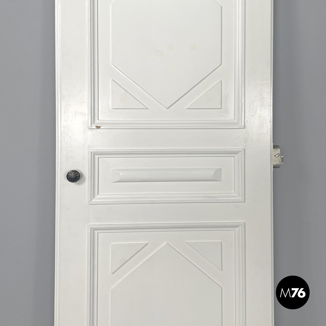 Single swing door entirely in white painted wood. One “face” of the door is decorated with geometric patterns with a small round brass handle with floral decorations; the other is smooth with a silver metal handle. The door has metal hinges.