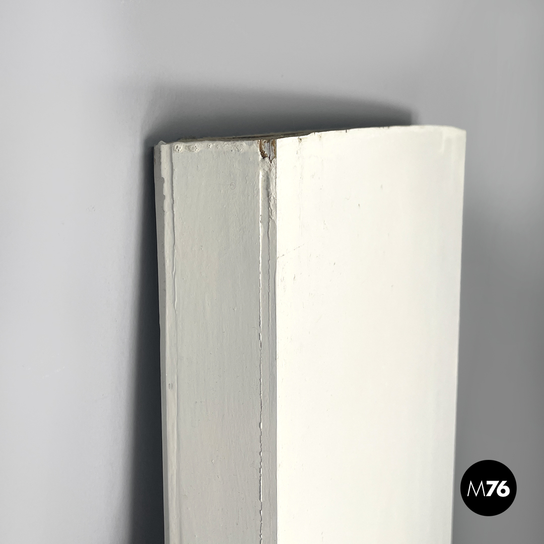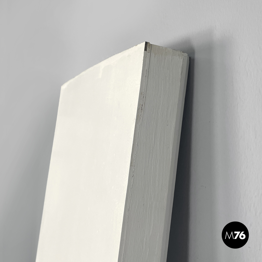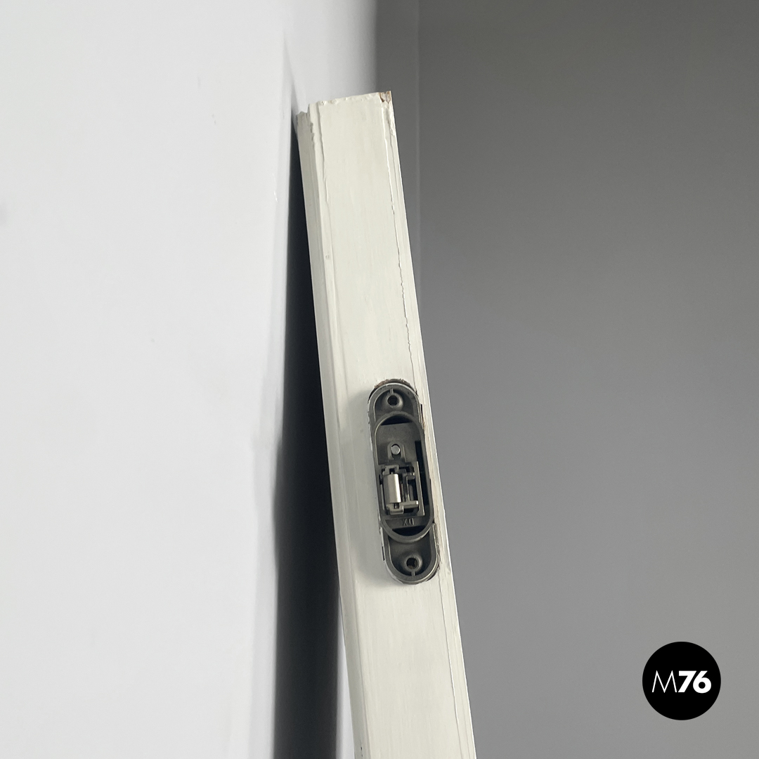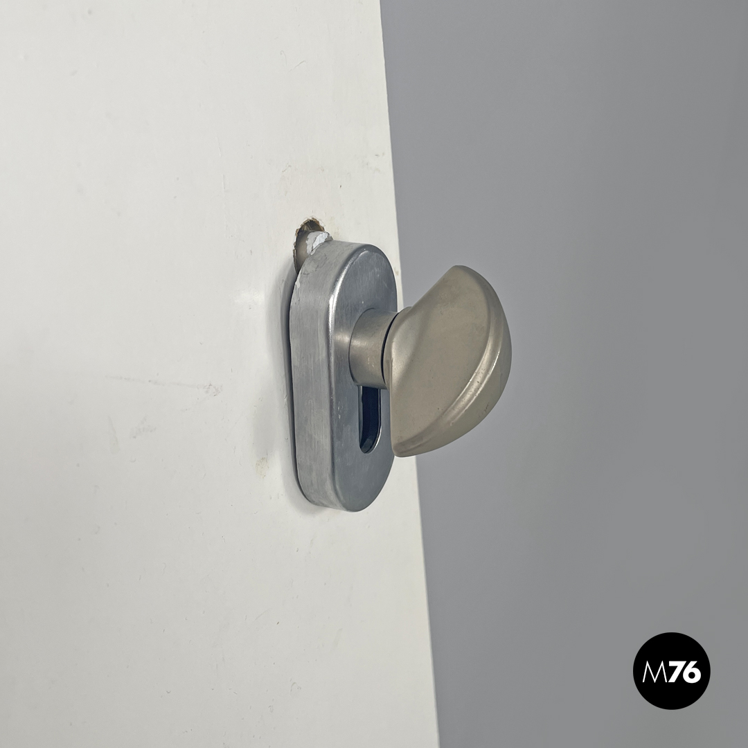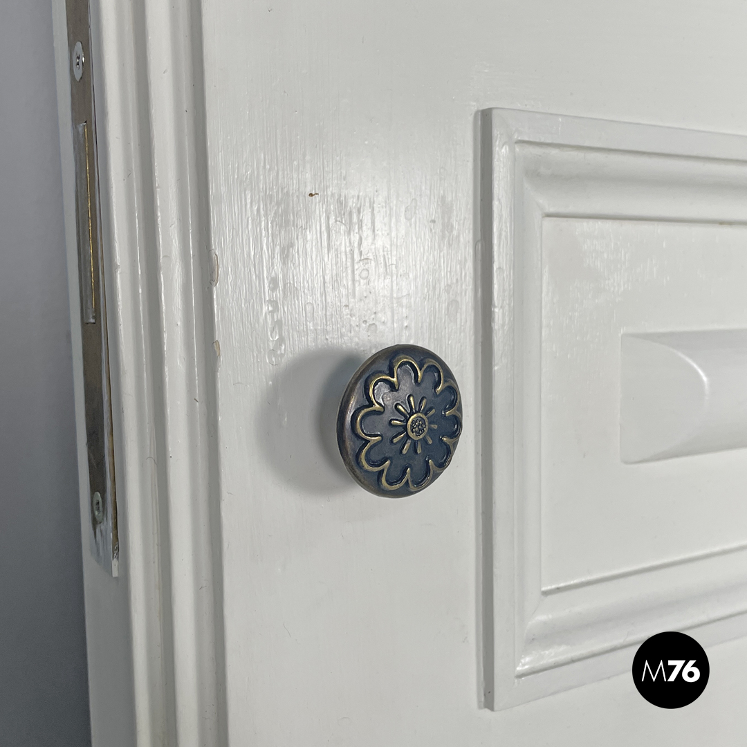 Single swing door entirely in white painted wood. One “face” of the door is decorated with geometric patterns with a small round brass handle with floral decorations; the other is smooth with a silver metal handle. The door has metal hinges.