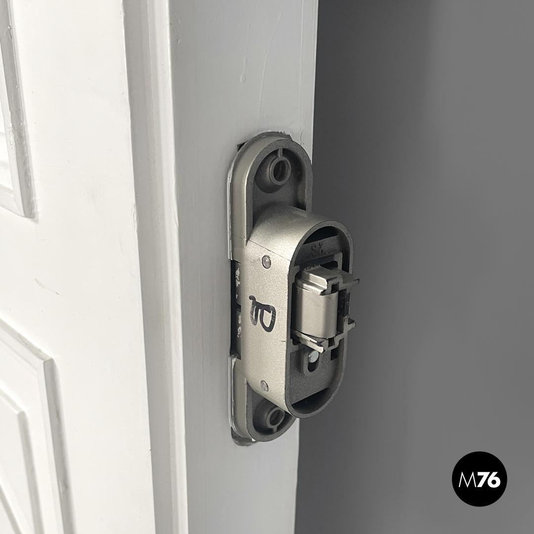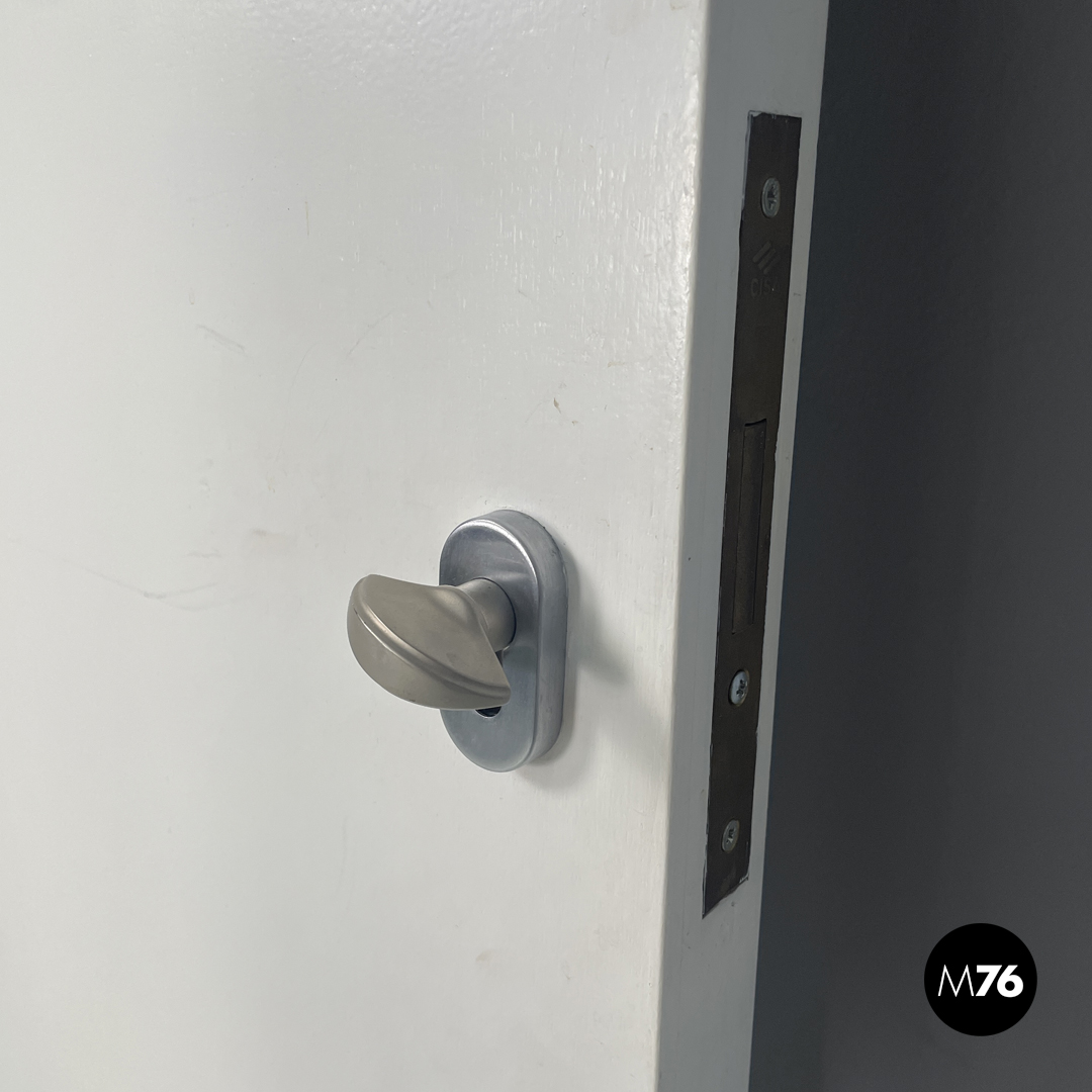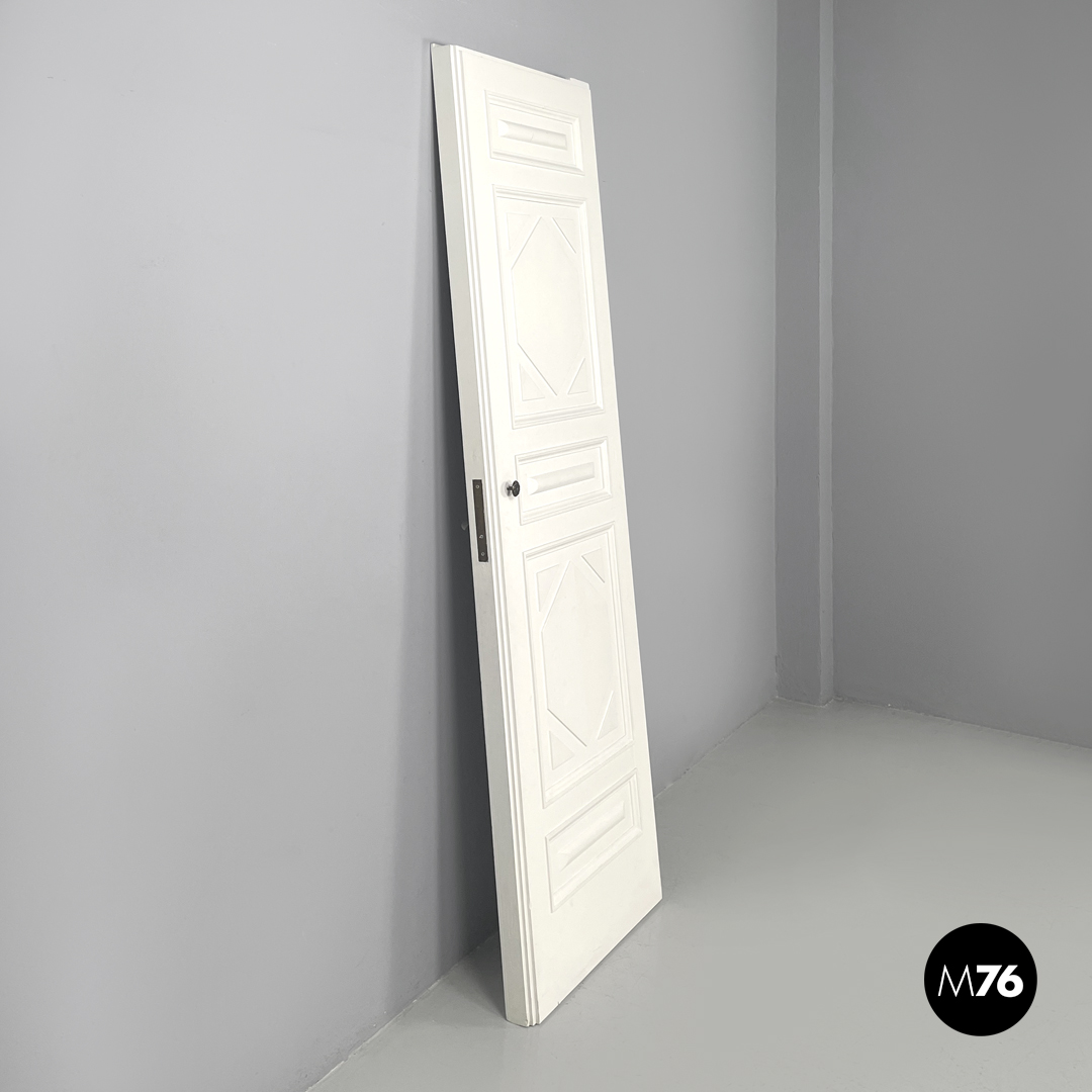 Single swing door entirely in white painted wood. One “face” of the door is decorated with geometric patterns with a small round brass handle with floral decorations; the other is smooth with a silver metal handle. The door has metal hinges.
