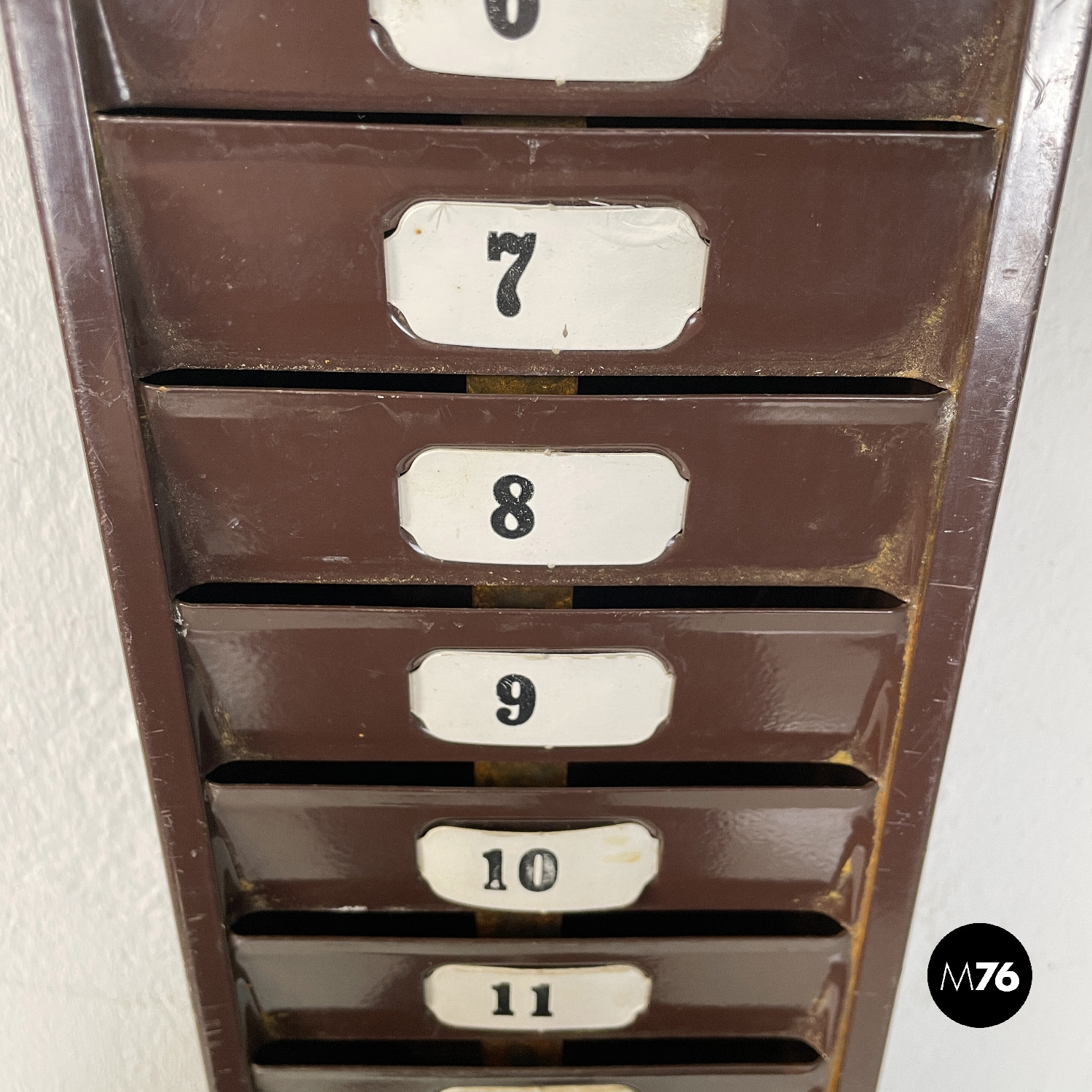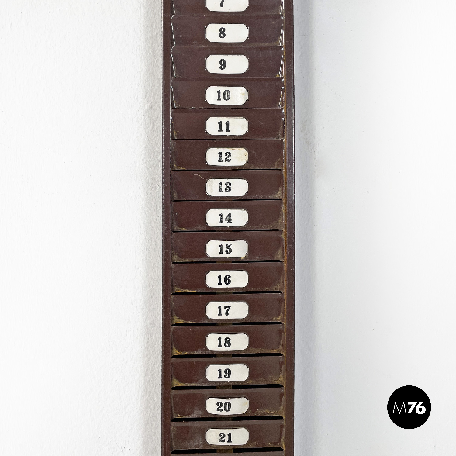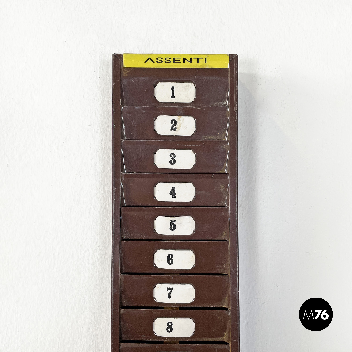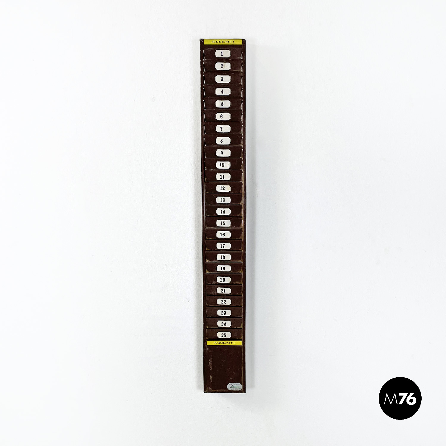 Portacarte o casellario industriale da parete rettangolare verniciato marrone con finitura lucida. Presenta venticinque posti numerati in cui è possibile inserire tessere o cartellini. Ha due adesivi in giallo riportanti la scritta “assenti”.