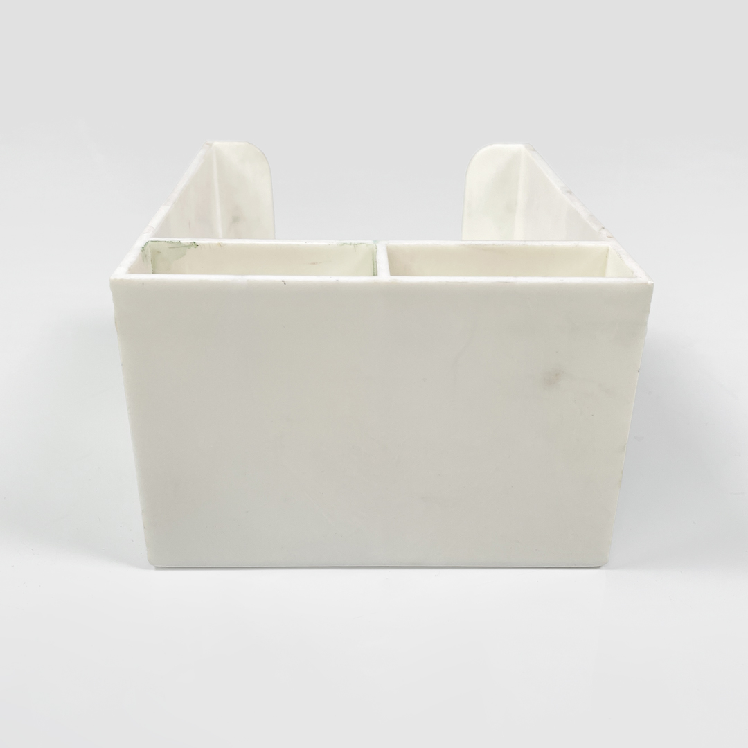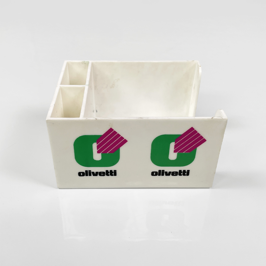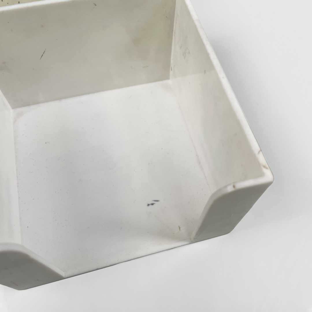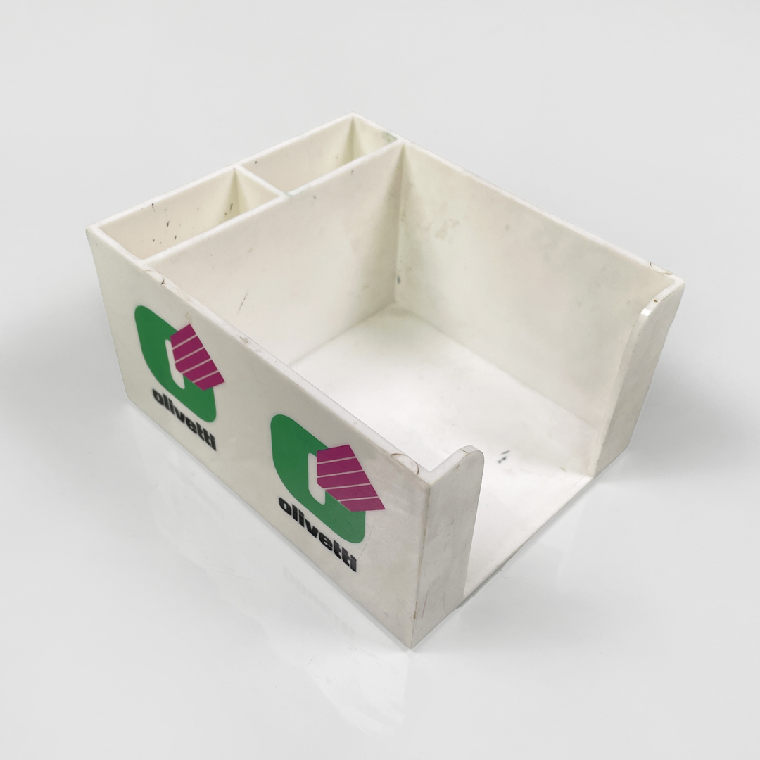Portaoggetti in plastica bianca. Presenta tre vani, due di uguale dimensione e uno più largo. Su due lati è stampato il logo.