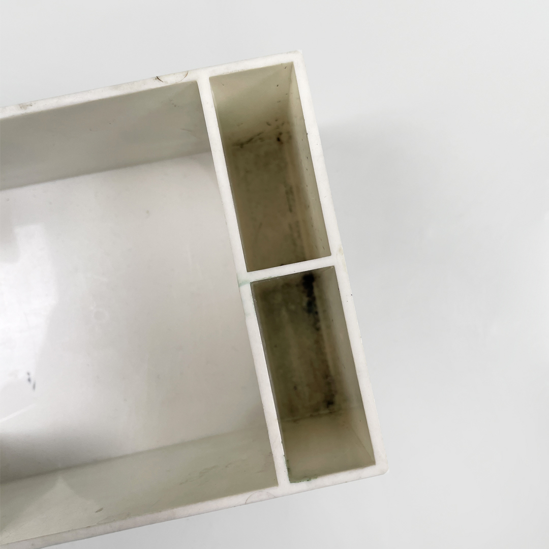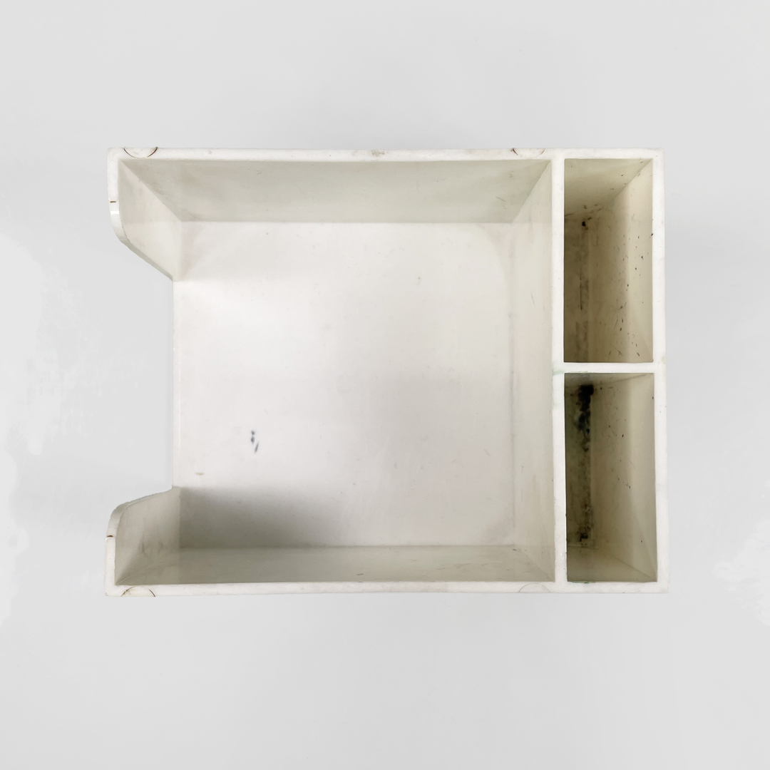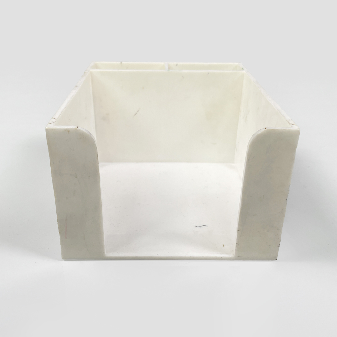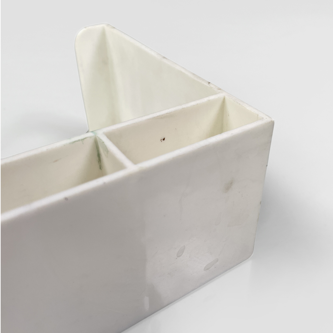 Portaoggetti in plastica bianca. Presenta tre vani, due di uguale dimensione e uno più largo. Su due lati è stampato il logo.