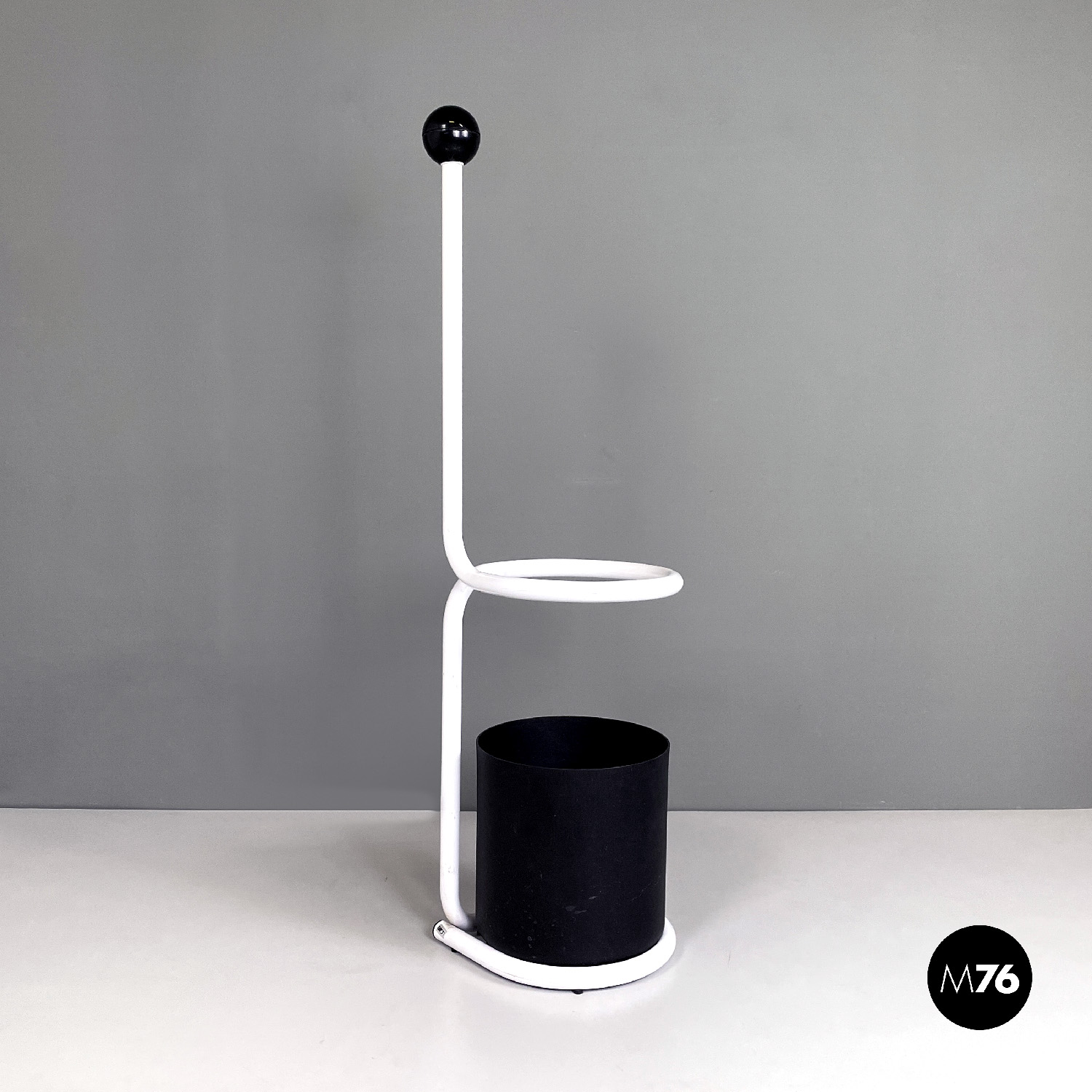 Portaombrelli a base tonda in metallo. La struttura tubolare in metallo verniciato grigio forma la base e lo stelo laterale, dove al suo interno si trova un cilindro in metallo verniciato nero dove è possibile inserire gli ombrelli. La struttura poi si piega curvandosi nella parte centrale a formare un cerchio; nella parte finale del tubolare è presente una sfera decorativa in plastica nera.
