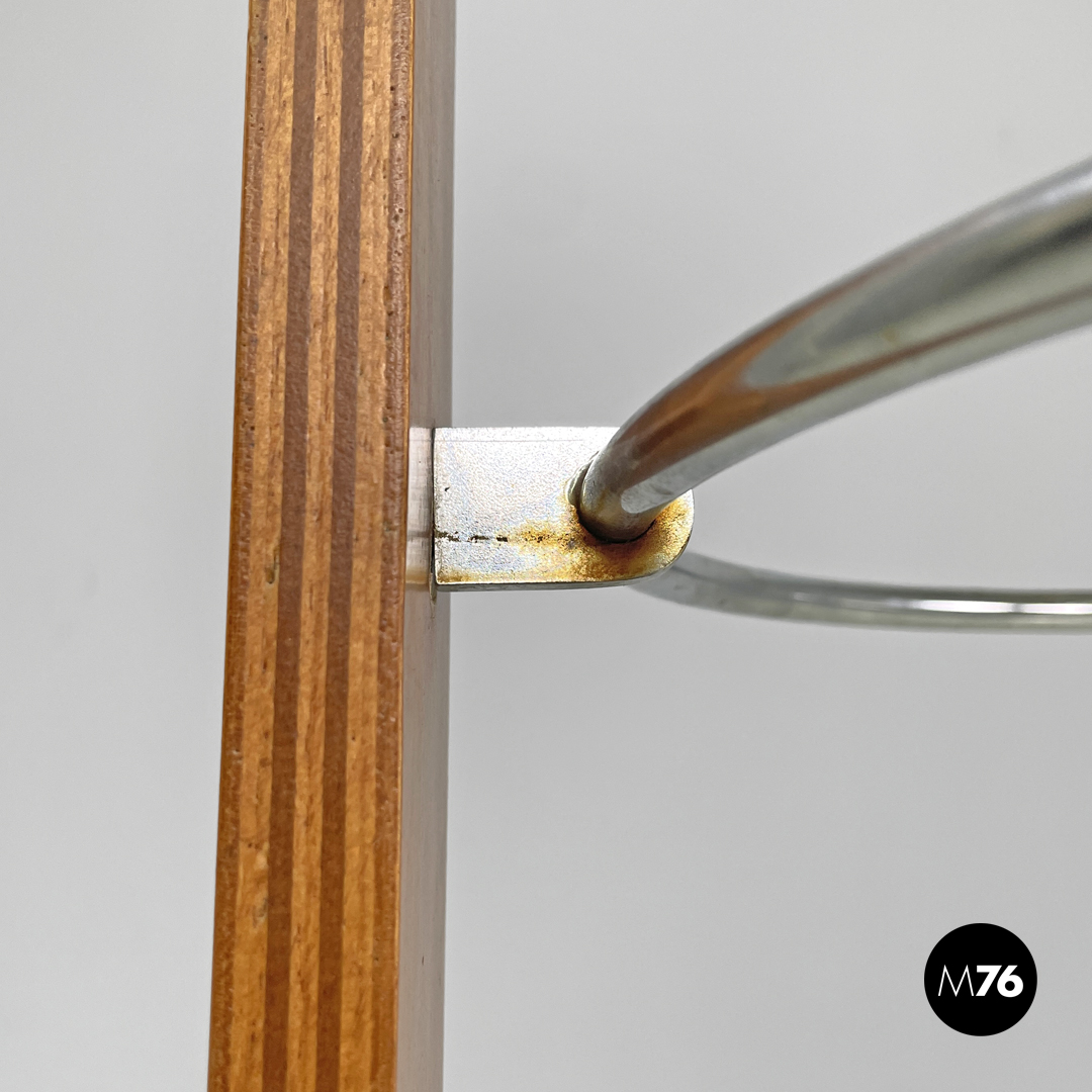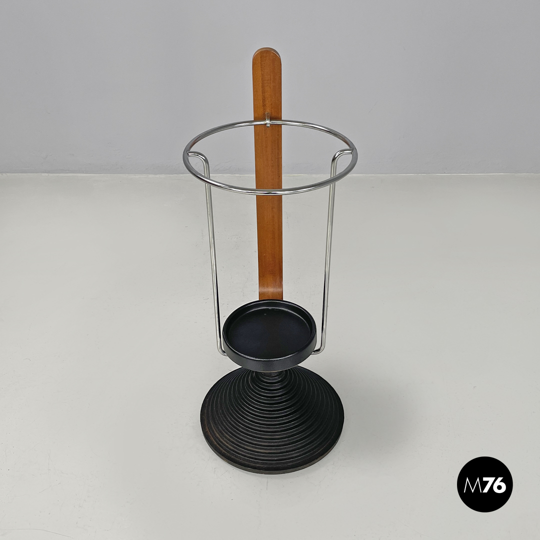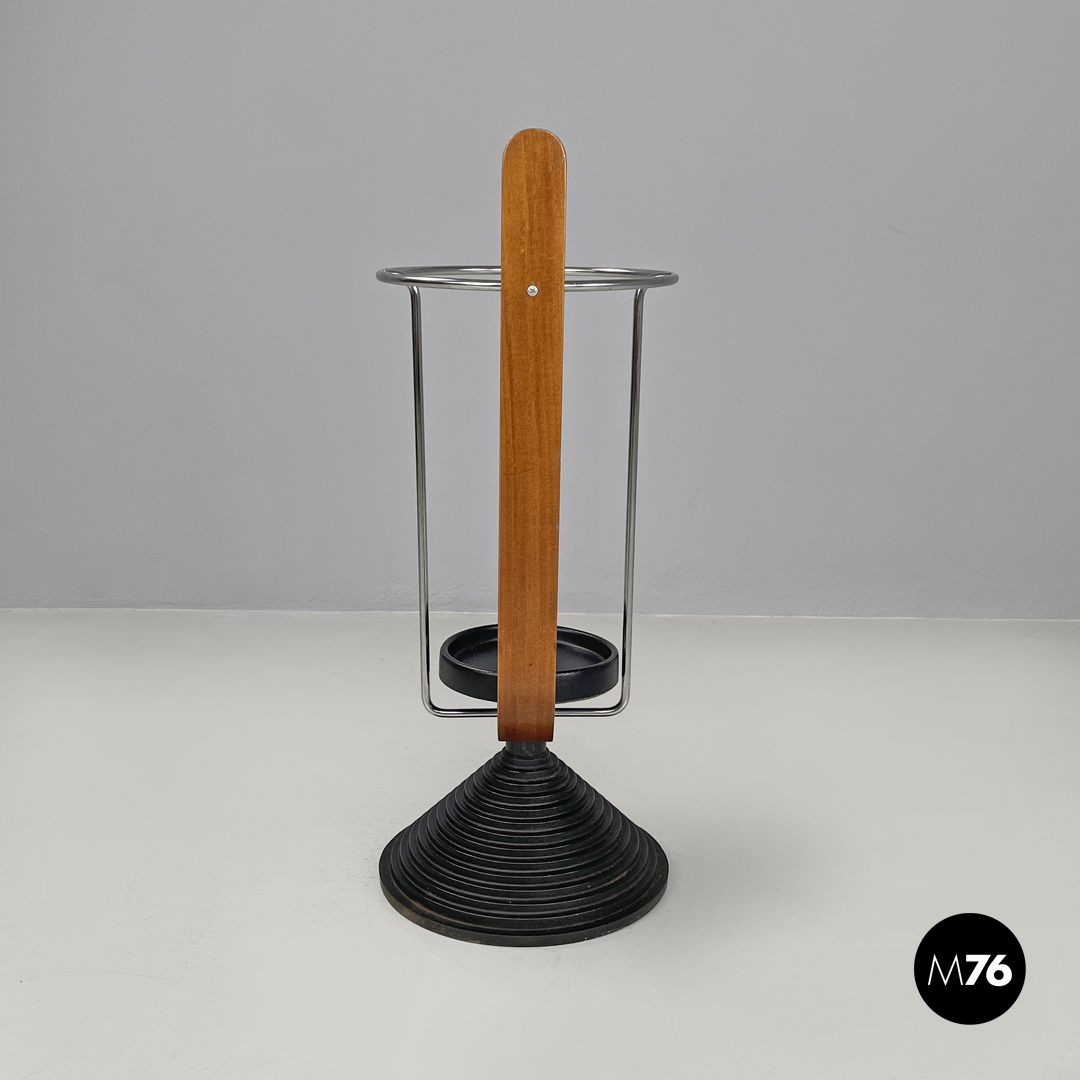 Portaombrelli tondo con struttura in tondino di metallo cromato tonda ed un listello di legno stondato. Il piatto alla base della struttura è in materiale sintetico nero. La base è in ghisa ed è conica con scalanature decorative.