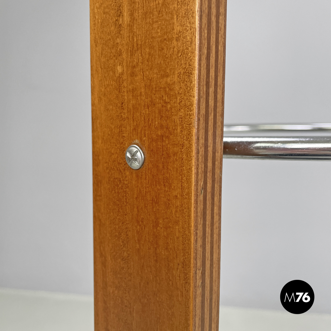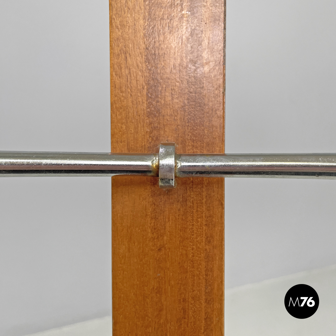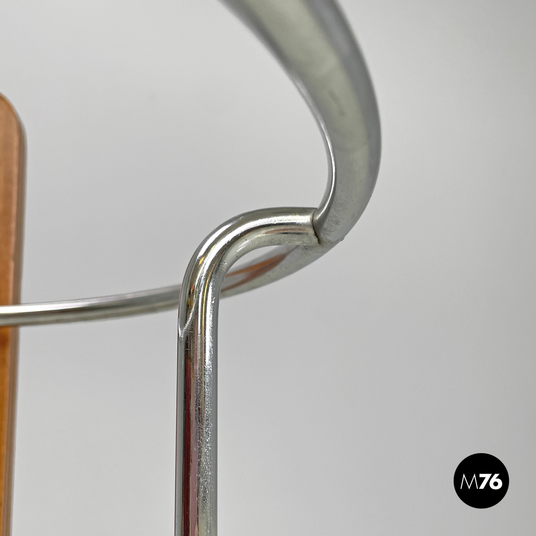 Portaombrelli tondo con struttura in tondino di metallo cromato tonda ed un listello di legno stondato. Il piatto alla base della struttura è in materiale sintetico nero. La base è in ghisa ed è conica con scalanature decorative.