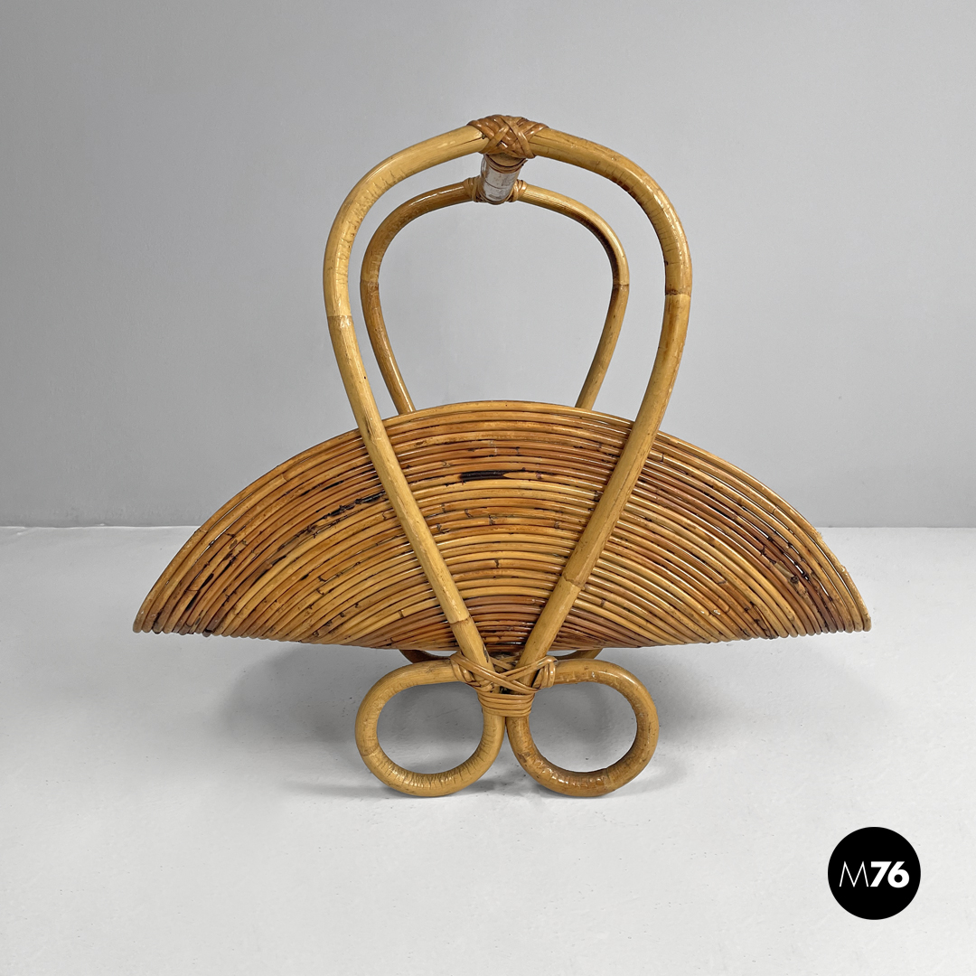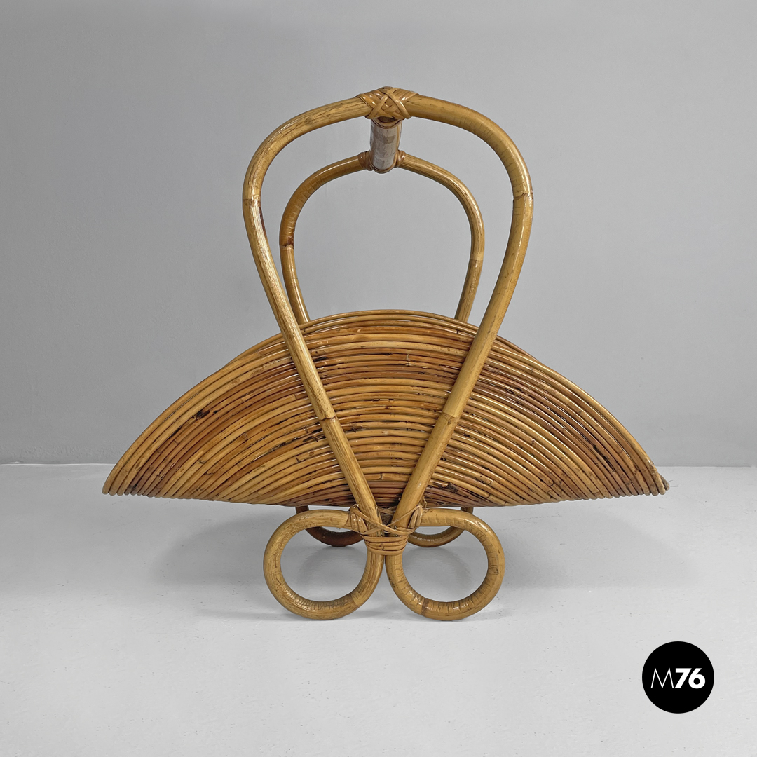 Portariviste dalle forme curve in rattan. Il piano di appoggio è curvo e modellato a formare una “U” ed è composta da un motivo a spirale. La struttura portante è a sezione tonda ed è anch’essa curva e morbida modellandosi a formare il manico nella parte superiore e le due parti laterali che all’appoggio a terra formano quattro piedini dalla forma tonda.