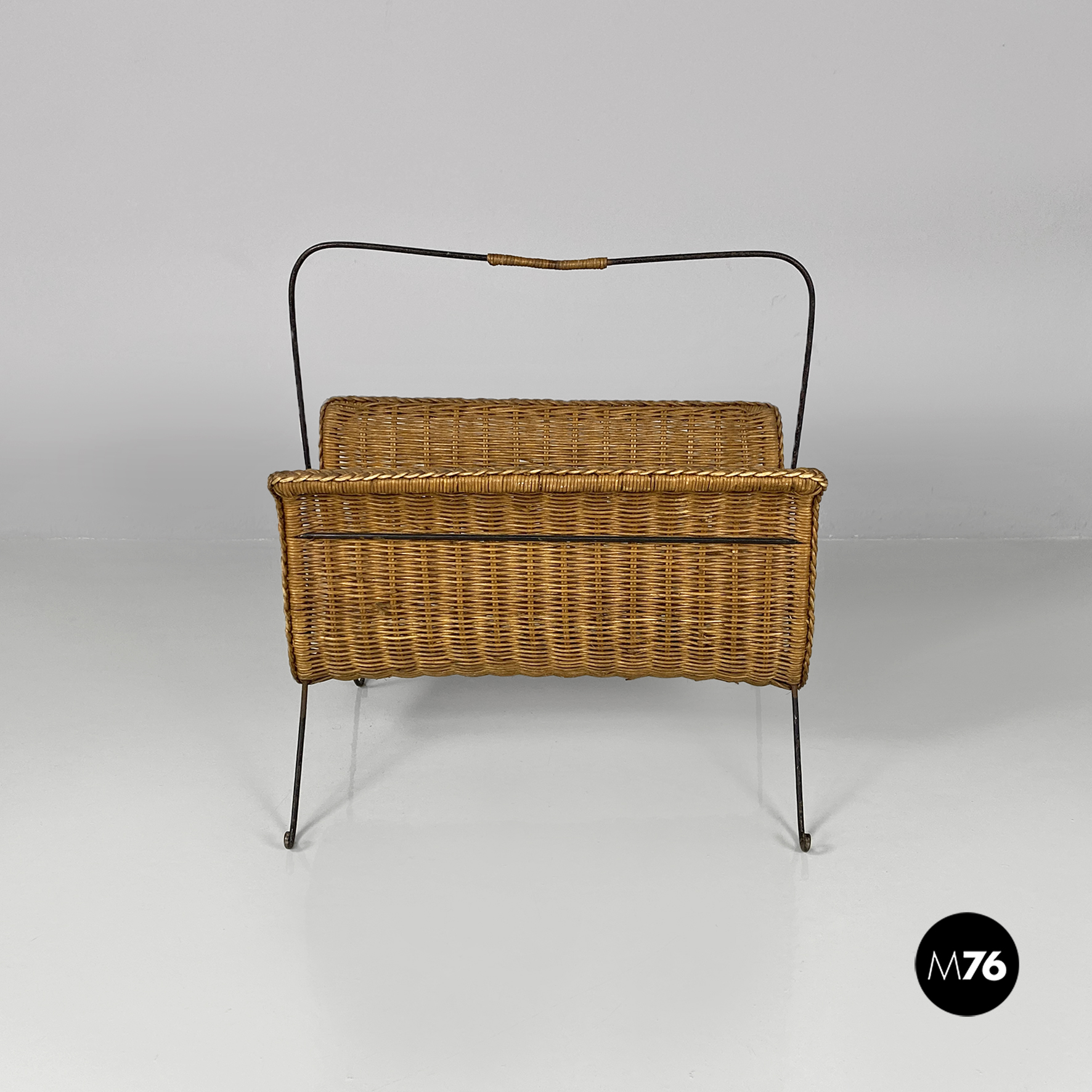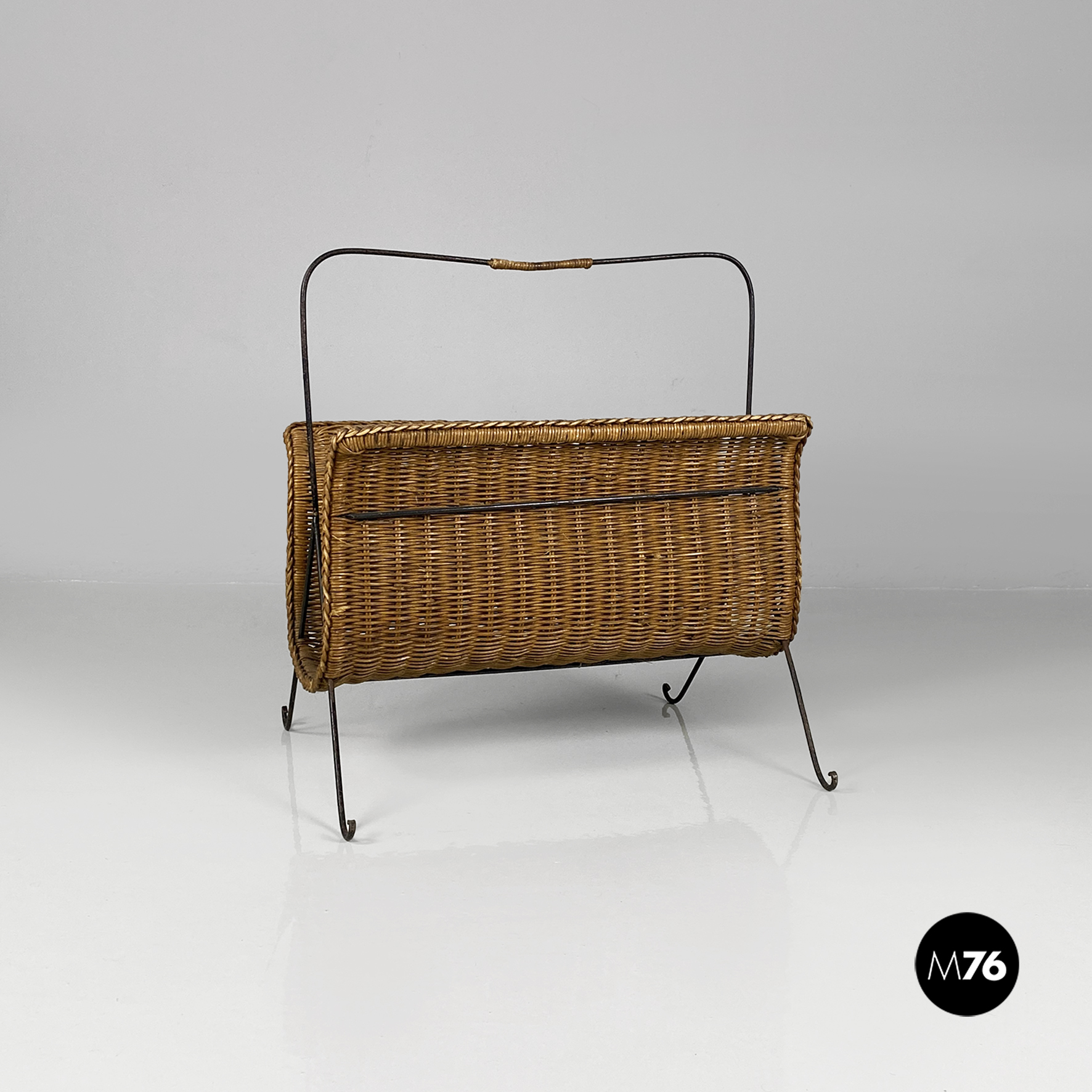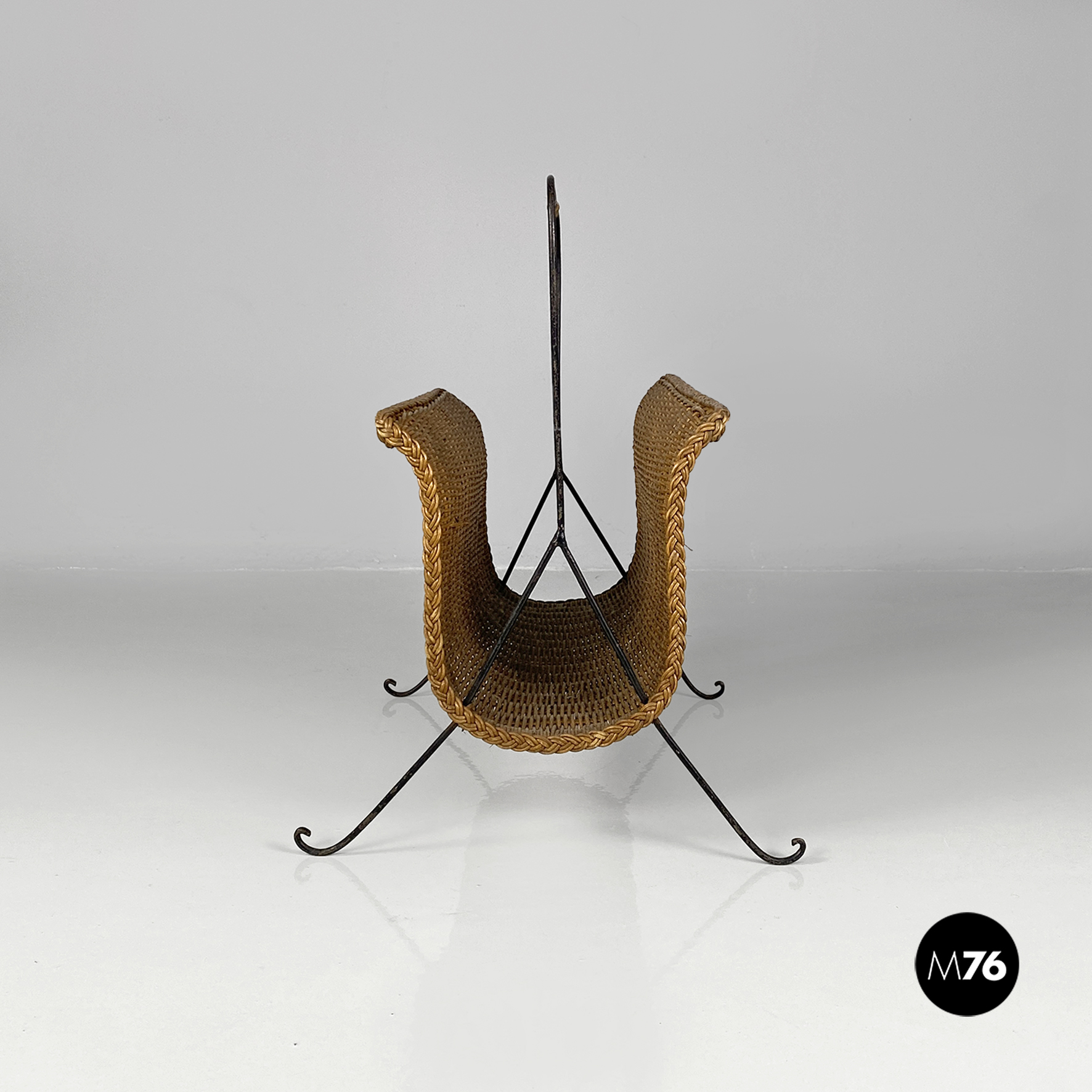 Portariviste con struttura zampe e manico in ferro nero e parte contenitiva in rafia.