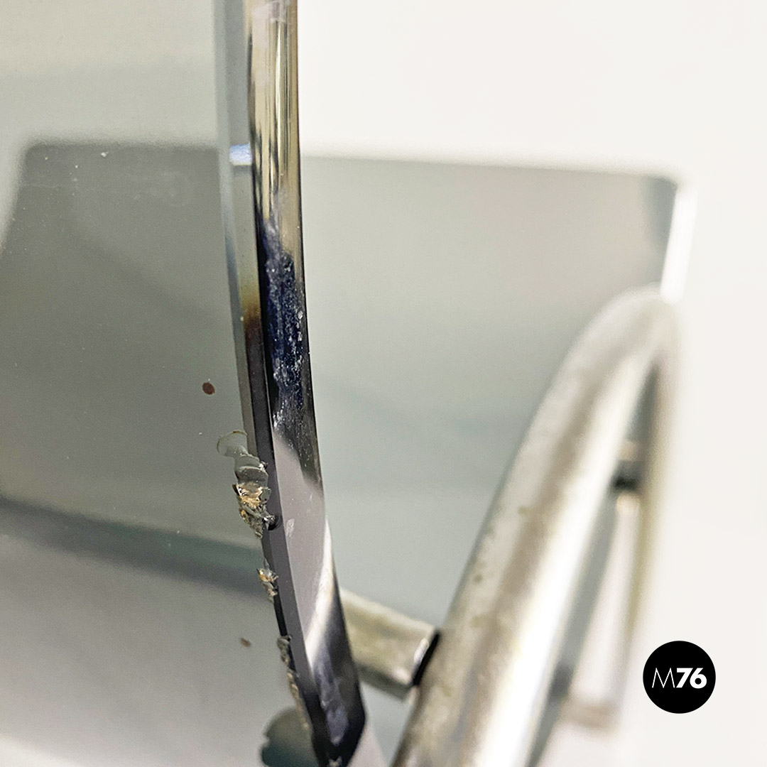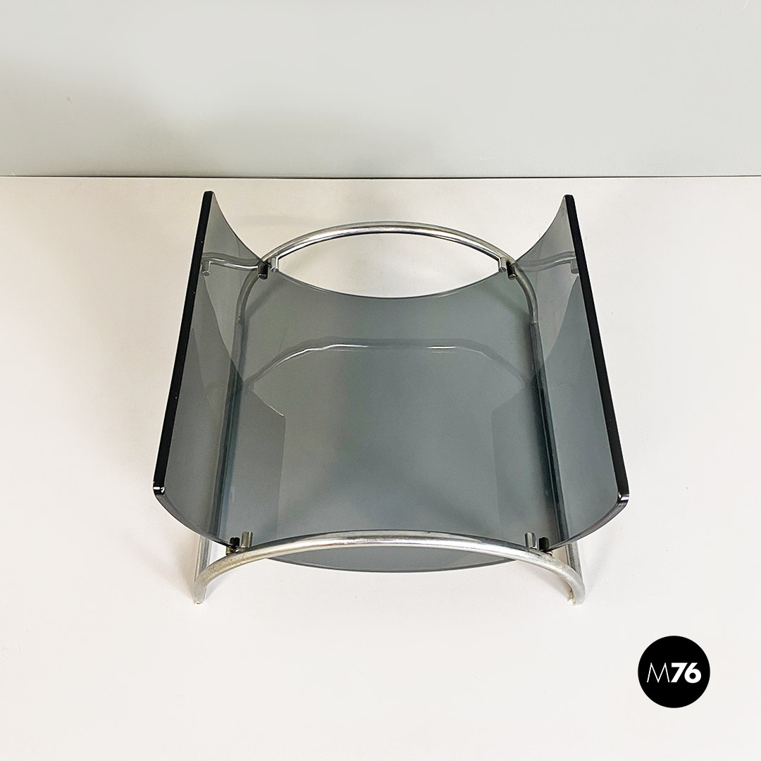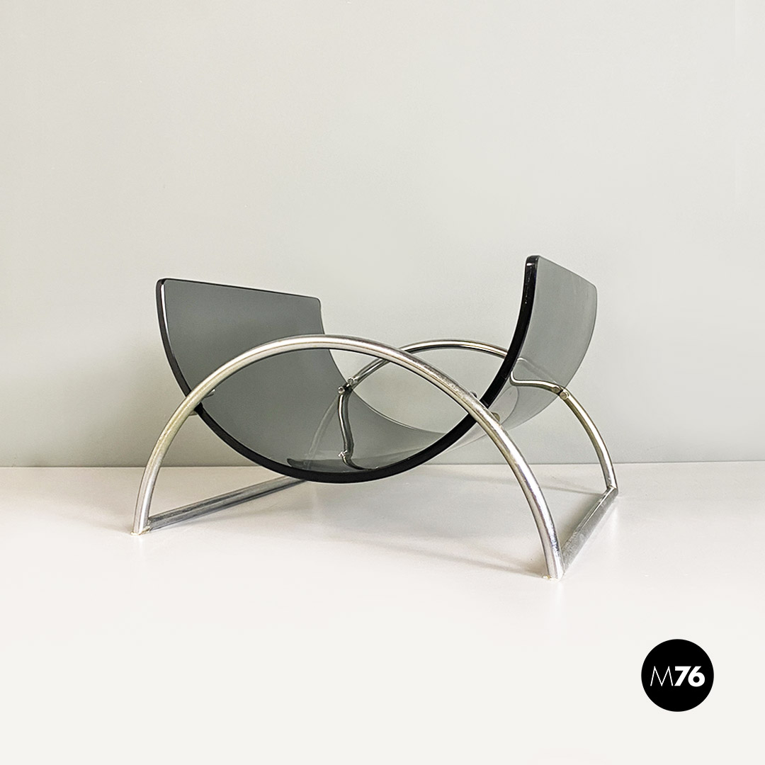 Portariviste modello Lira con struttura curva in tondino d’acciaio e piano d’appoggio in vetro fumè curvato infilato fra quattro bulloni che lo tengono fermo anche grazie al suo stesso peso e forma e la cui parte convessa più estrema centrale punta verso il basso.
