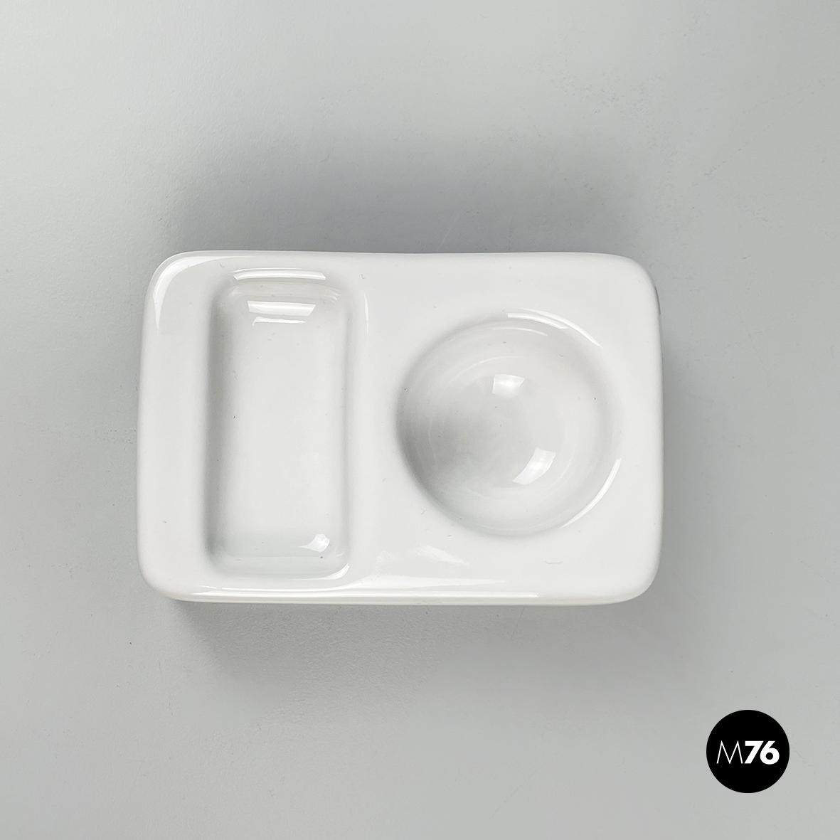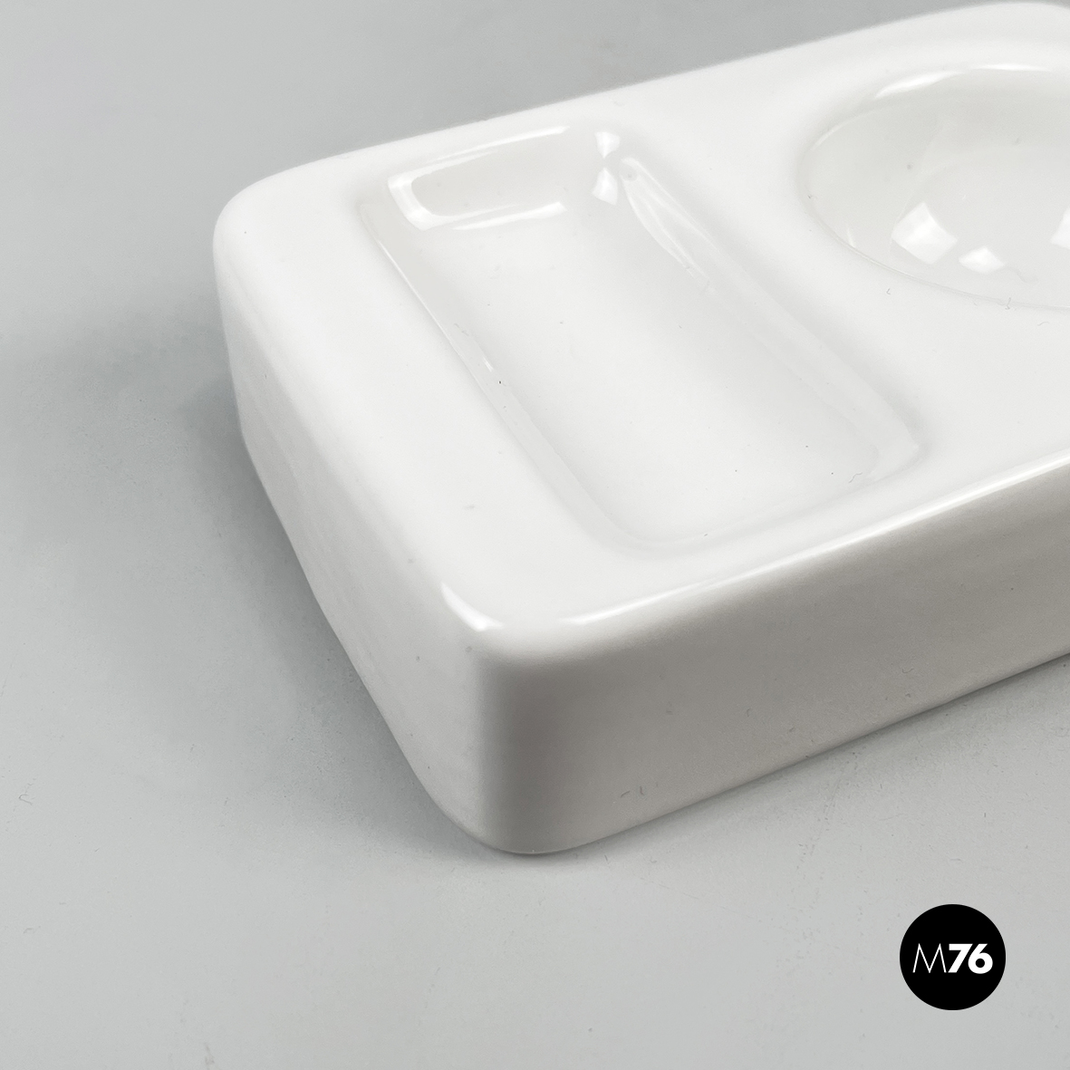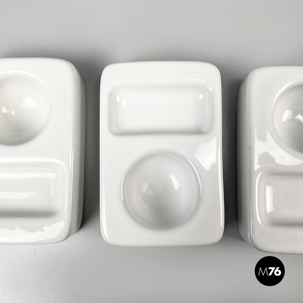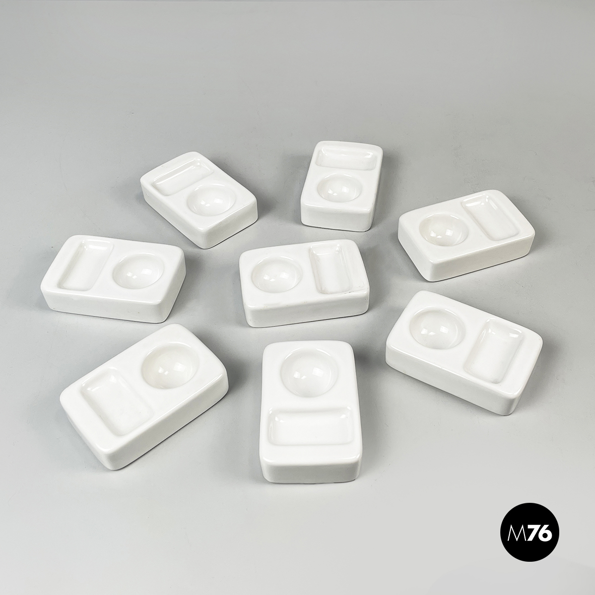 Set di otto portauovo da tavola a base rettangolare con angoli arrotondati in ceramica bianca. Il portauova presenta due rientranze: una tonda per l’uovo e una rettangolare per poggiare il cucchiaino.