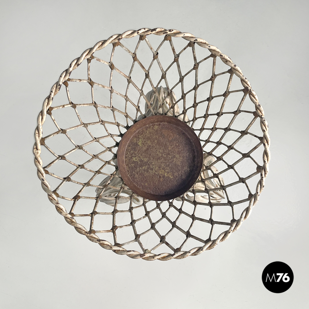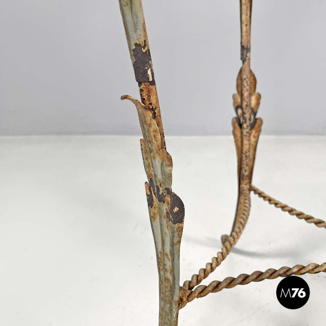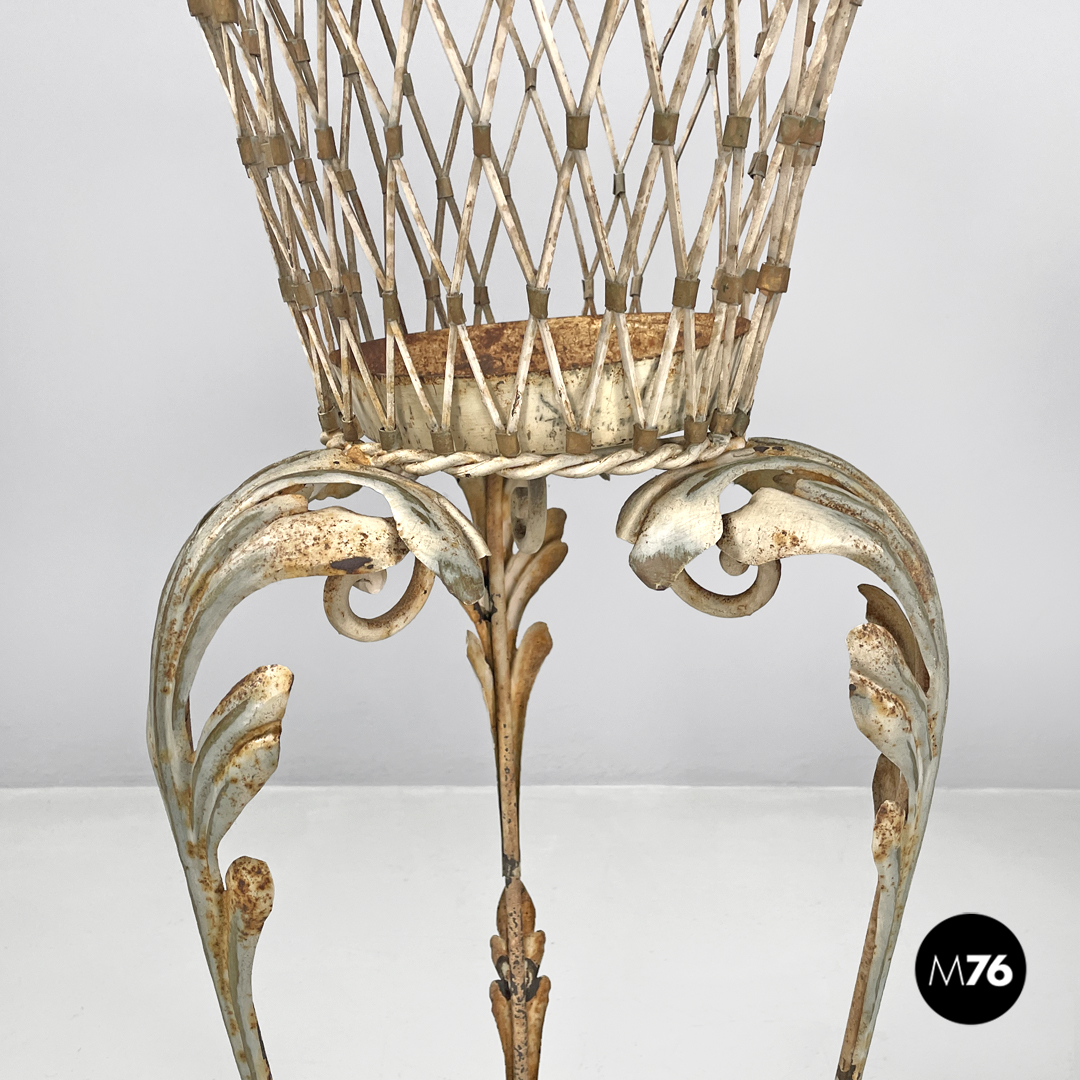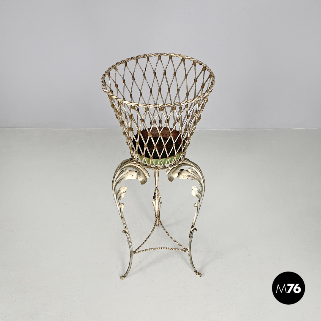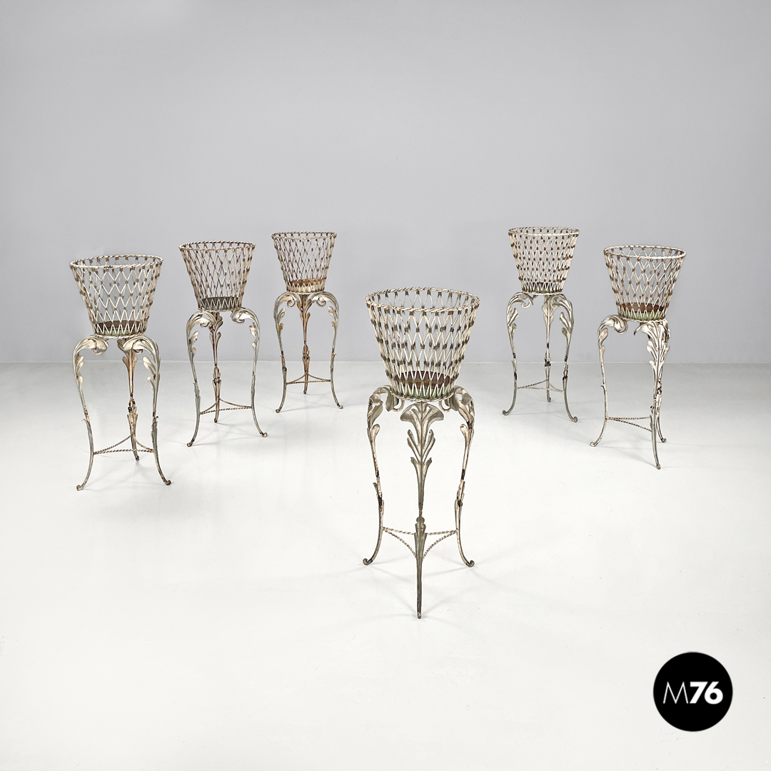 Set di sei portavasi in ferro battuto dipinti di bianco con dettagli dorati. Il portavasi tondo è composto da un telaio a rete con dettagli cilindrici dorati, questa parte è saldata alle tre gambe che sono a forma di foglia decorativa nella parte superiore e che terminano a sezione circolare all’appoggio a terra. Con tre barre a torciglione nella parte bassa che fungono da struttura per le gambe. I portavasi presentano nella base interna un piattino per l’appoggio del vaso.