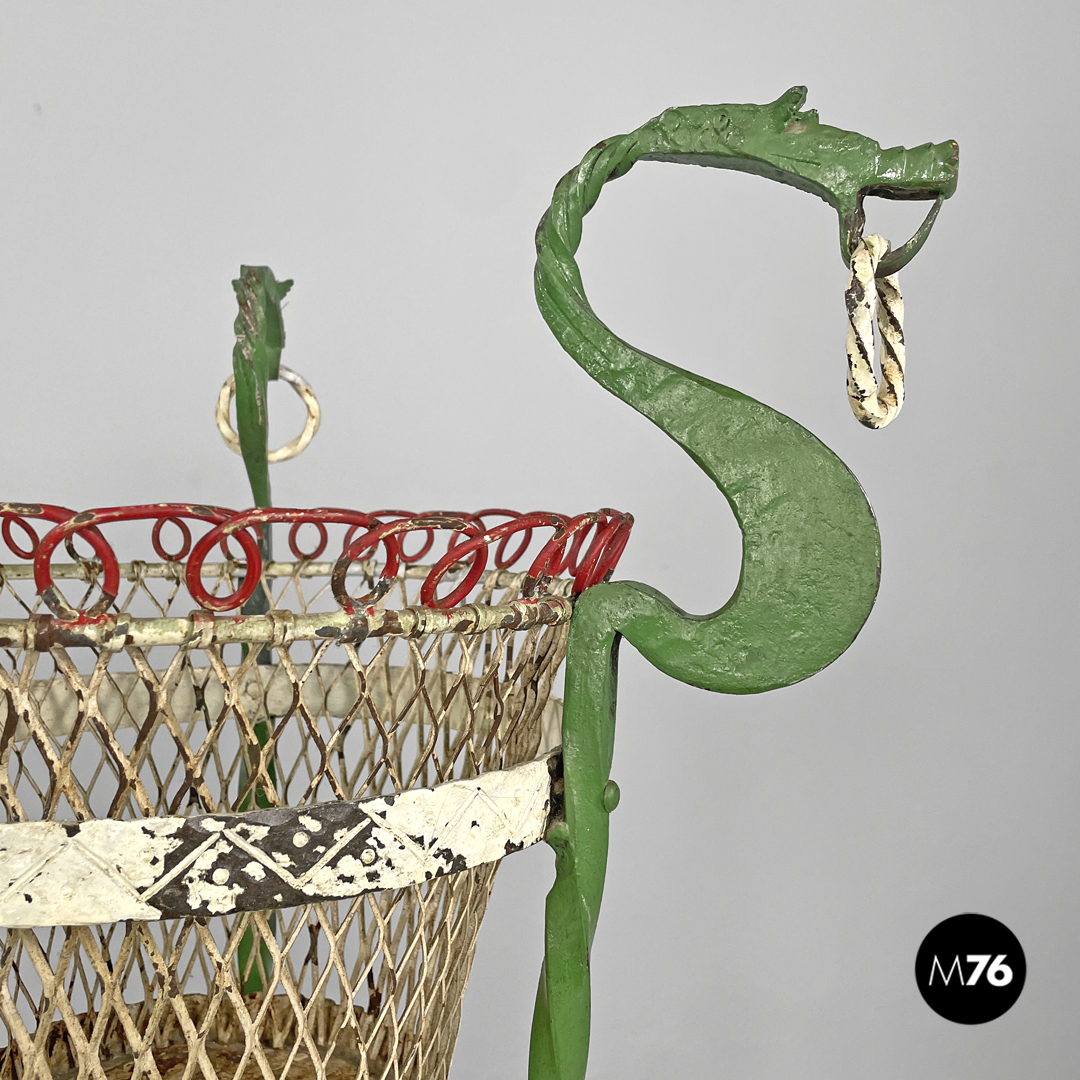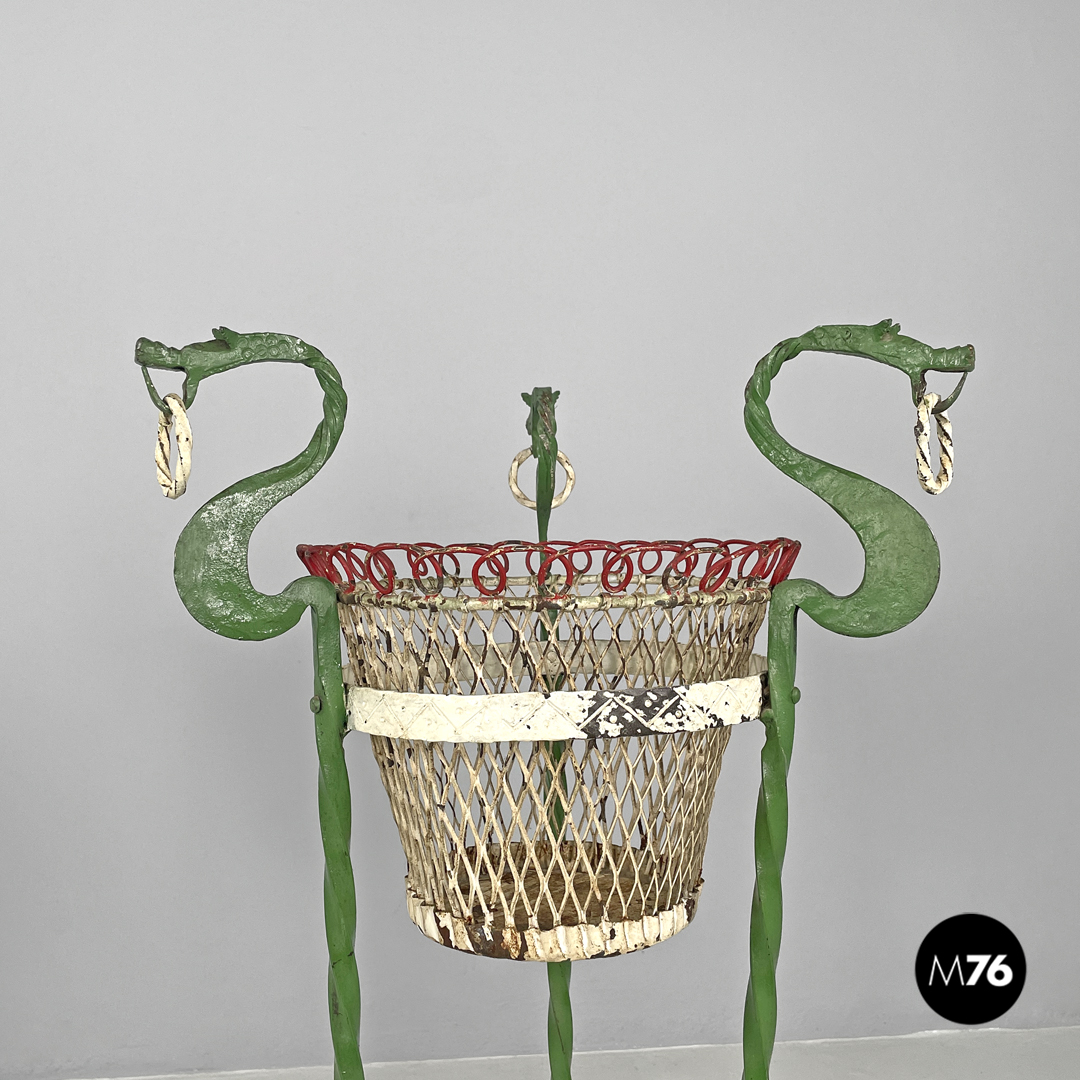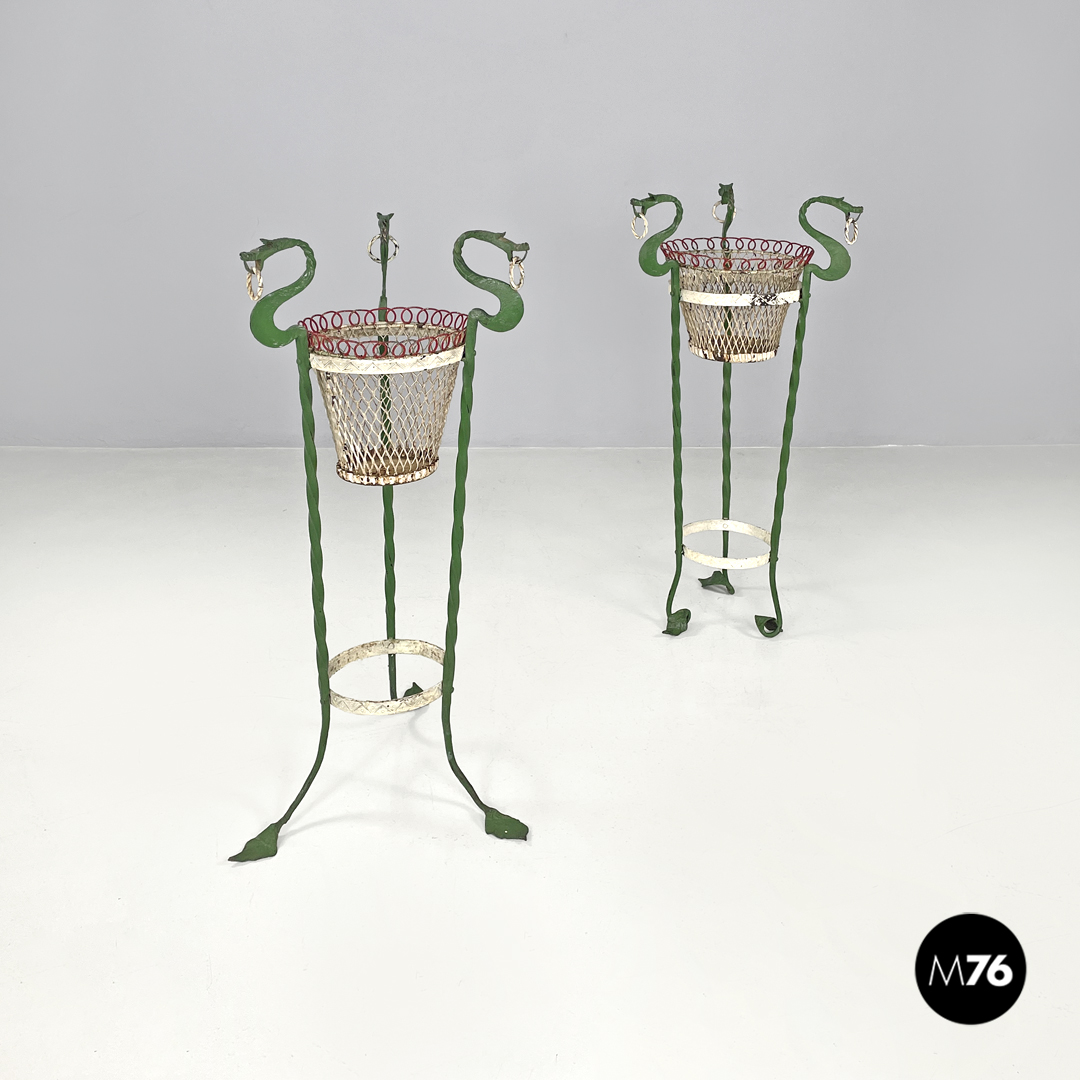 Coppia di portavasi in ferro battuto. Le due strutture sono entrambe composte da tre barre di ferro a torciglione verniciate di verde e che terminano con piedini a forma di foglia ma differiscono nella composizione dell’appoggio a terra: in uno le “foglie” si sviluppano verso l’esterno mentre nell’altro verso l’interno. Le tre barre nella parte alta prendono la forma di un drago decorativo con ciascuno un anello tra i denti sotto si trova una fascia in metallo decorata e verniciata di bianco che contiene il portavasi che è a base tonda e decorato dai colori bianco e rosso.