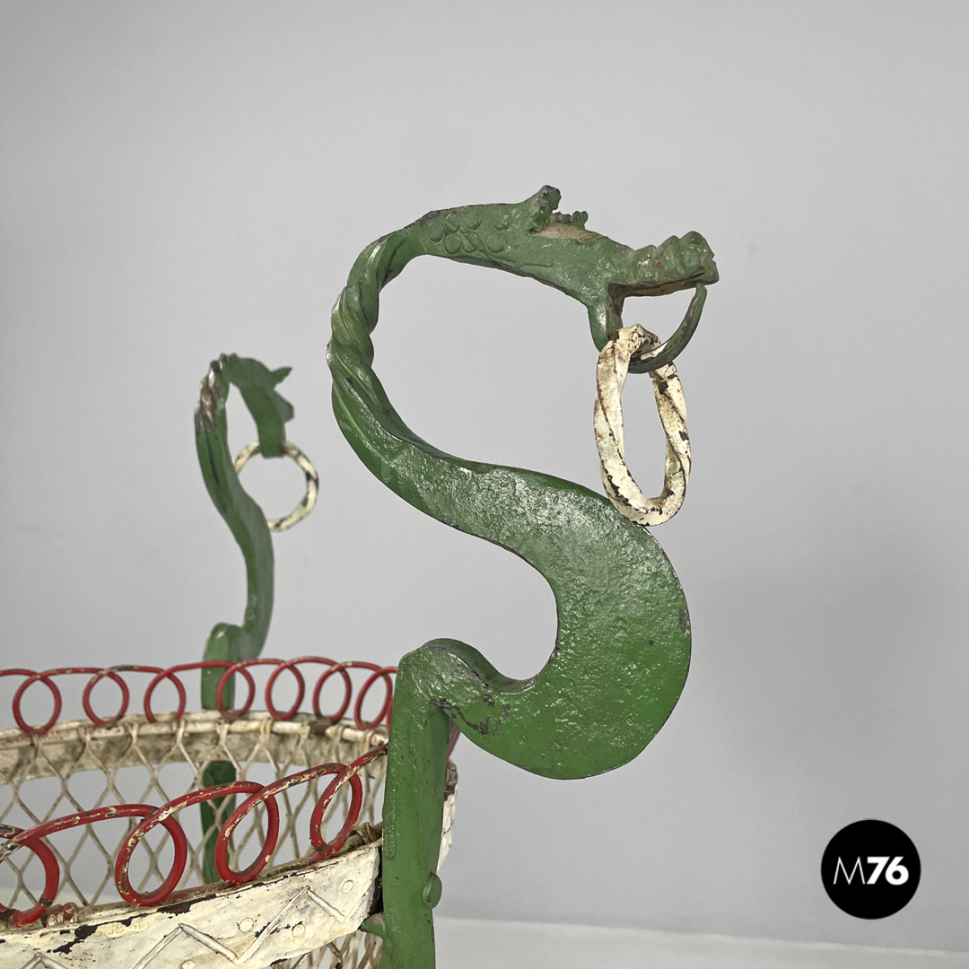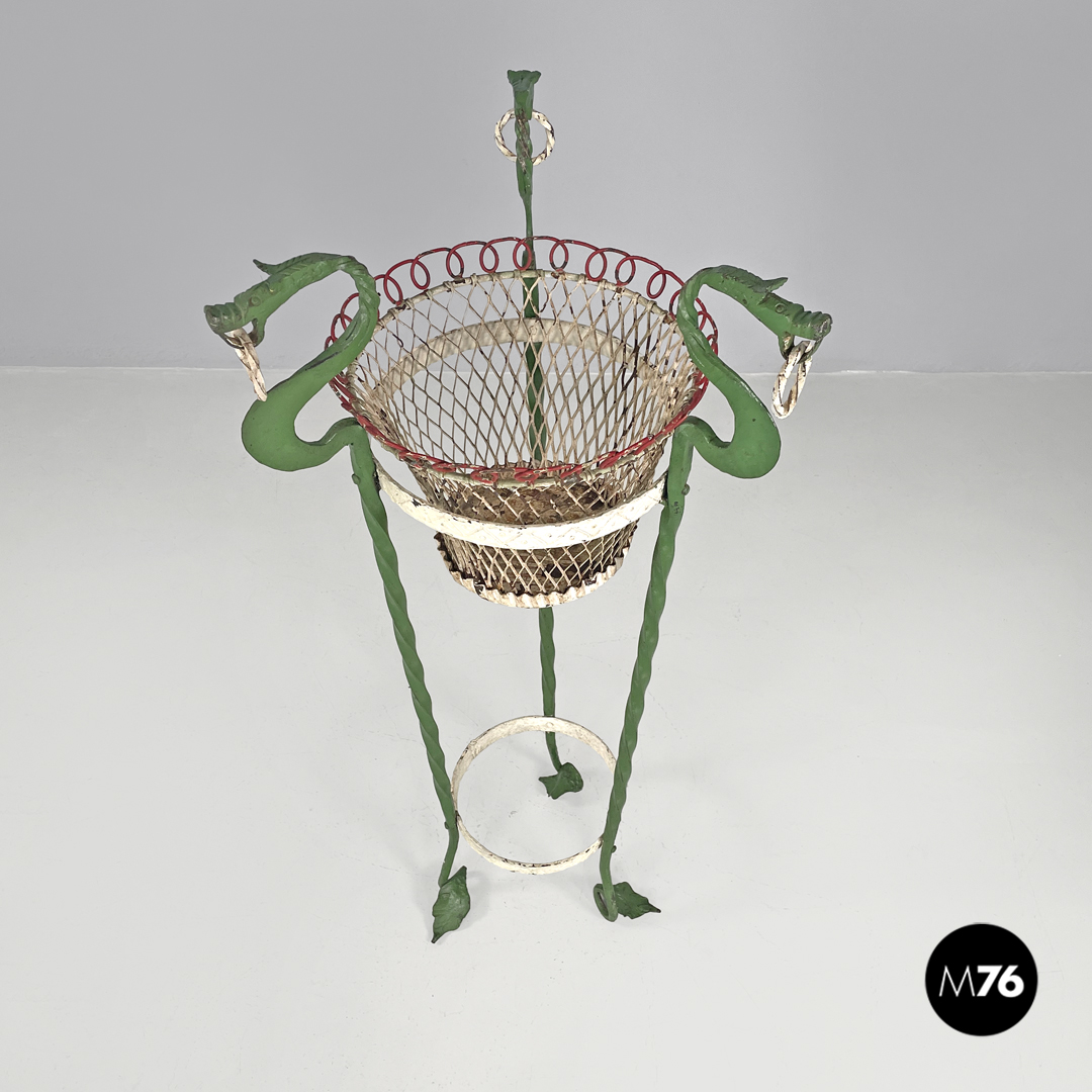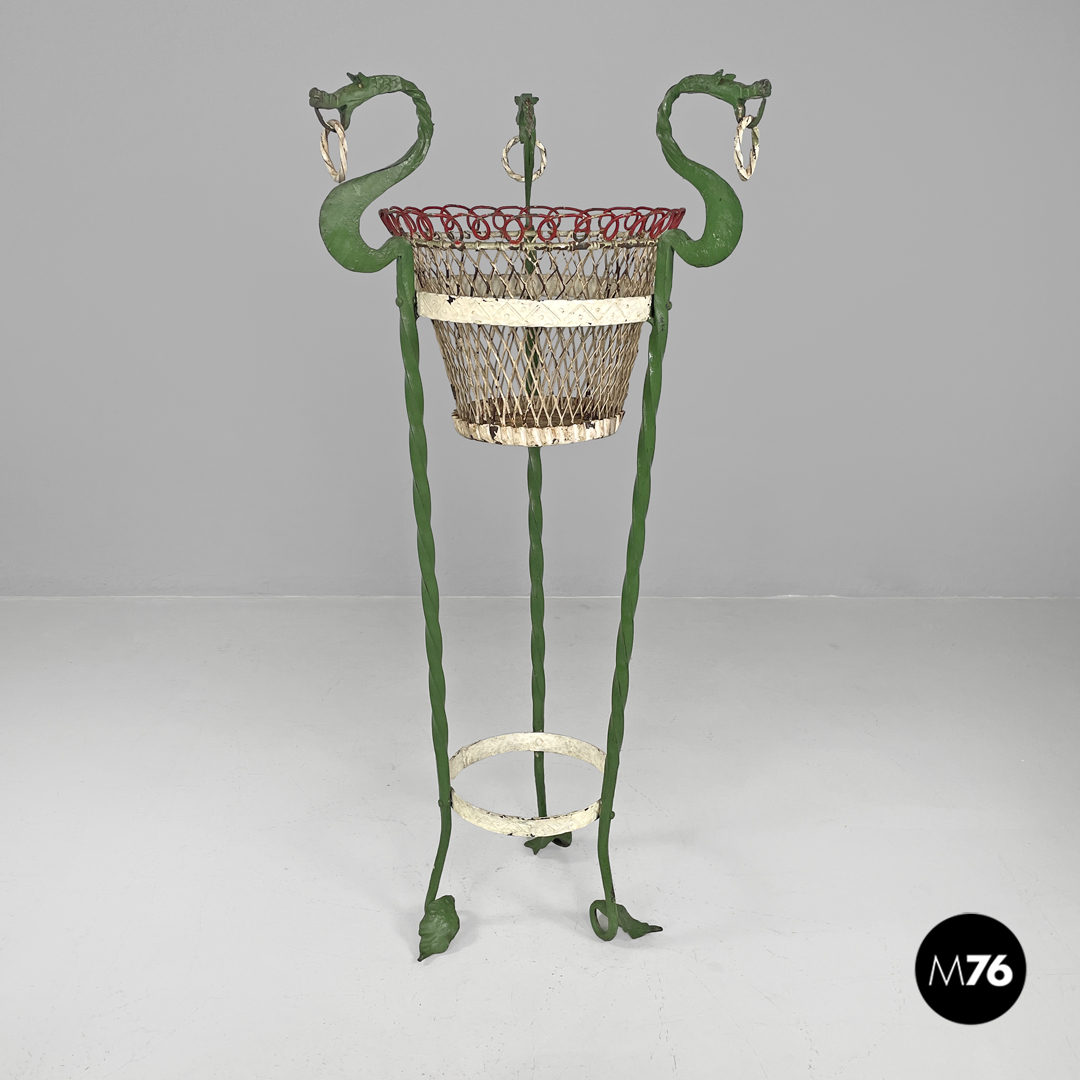 Coppia di portavasi in ferro battuto. Le due strutture sono entrambe composte da tre barre di ferro a torciglione verniciate di verde e che terminano con piedini a forma di foglia ma differiscono nella composizione dell’appoggio a terra: in uno le “foglie” si sviluppano verso l’esterno mentre nell’altro verso l’interno. Le tre barre nella parte alta prendono la forma di un drago decorativo con ciascuno un anello tra i denti sotto si trova una fascia in metallo decorata e verniciata di bianco che contiene il portavasi che è a base tonda e decorato dai colori bianco e rosso.