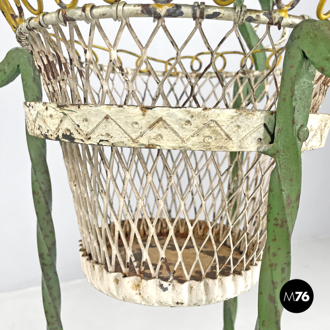 Portavasi in ferro battuto. La struttura è composta da tre barre di ferro a torciglione verniciate di verde che terminano con piedini a forma di foglia che si sviluppano verso l’interno. Le tre barre nella parte alta prendono la forma di un drago decorativo con ciascuno un anello tra i denti sotto si trova una fascia in metallo decorata e verniciata di bianco che contiene il portavasi che è a base tonda e decorato dai colori bianco e giallo. Utilizzabile anche in ambiente esterno come un giardino o un terrazzo.
