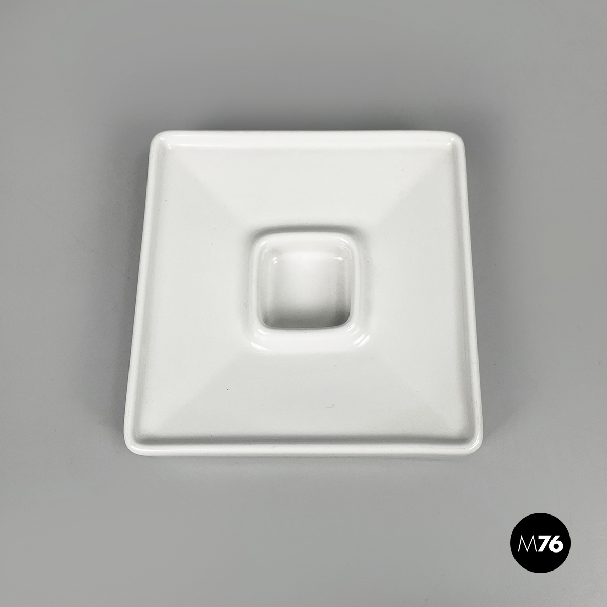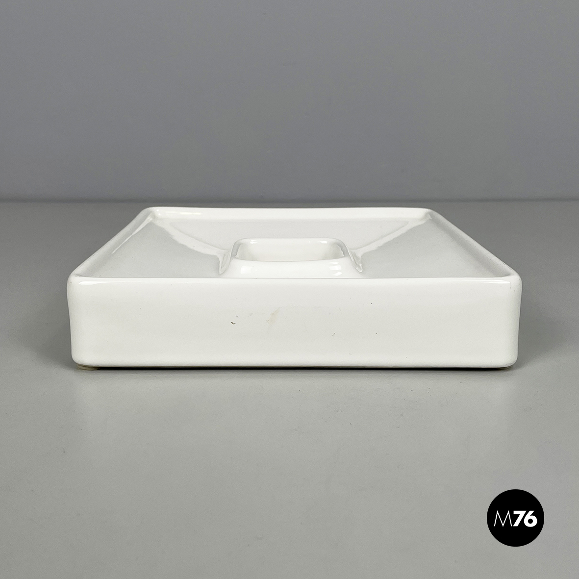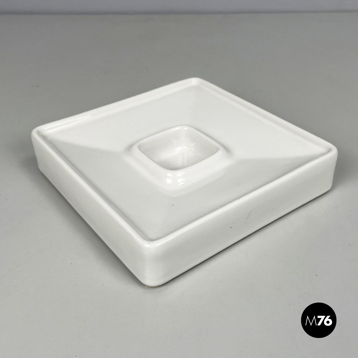 Posacenere da tavolo a base quadrata in ceramica bianca. Al centro del piatto è presente un vano, anche esso quadrato. Profilo leggermente rialzato.
