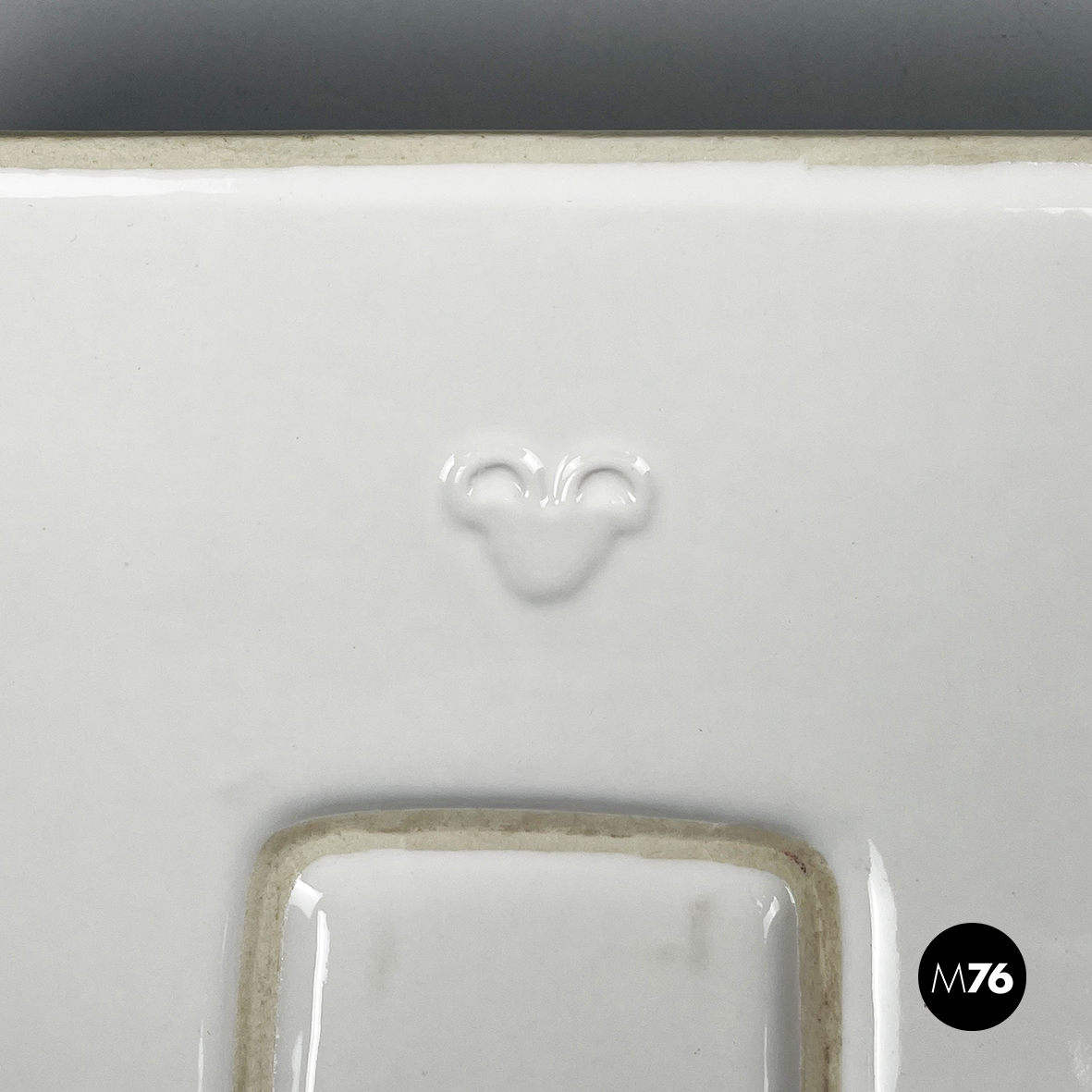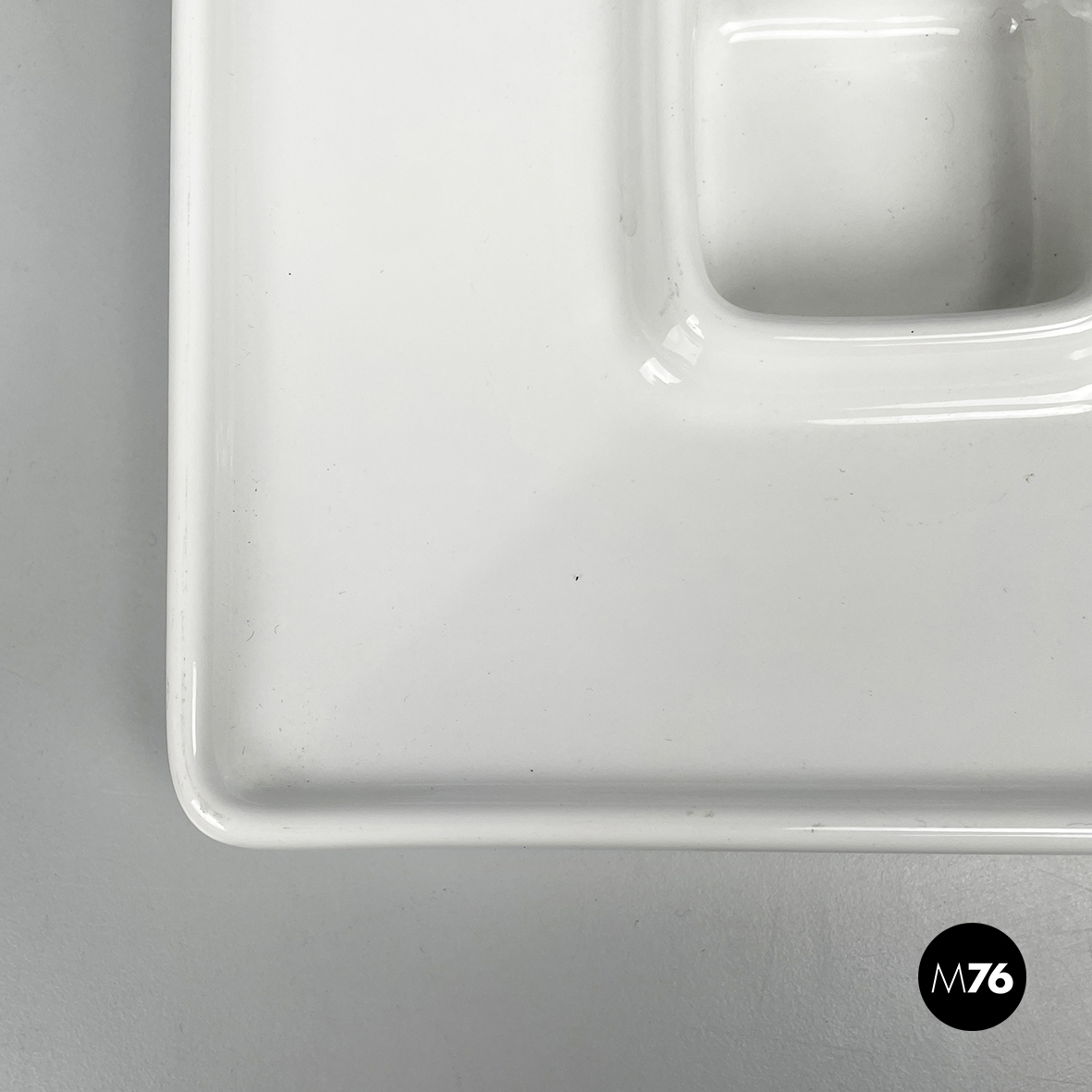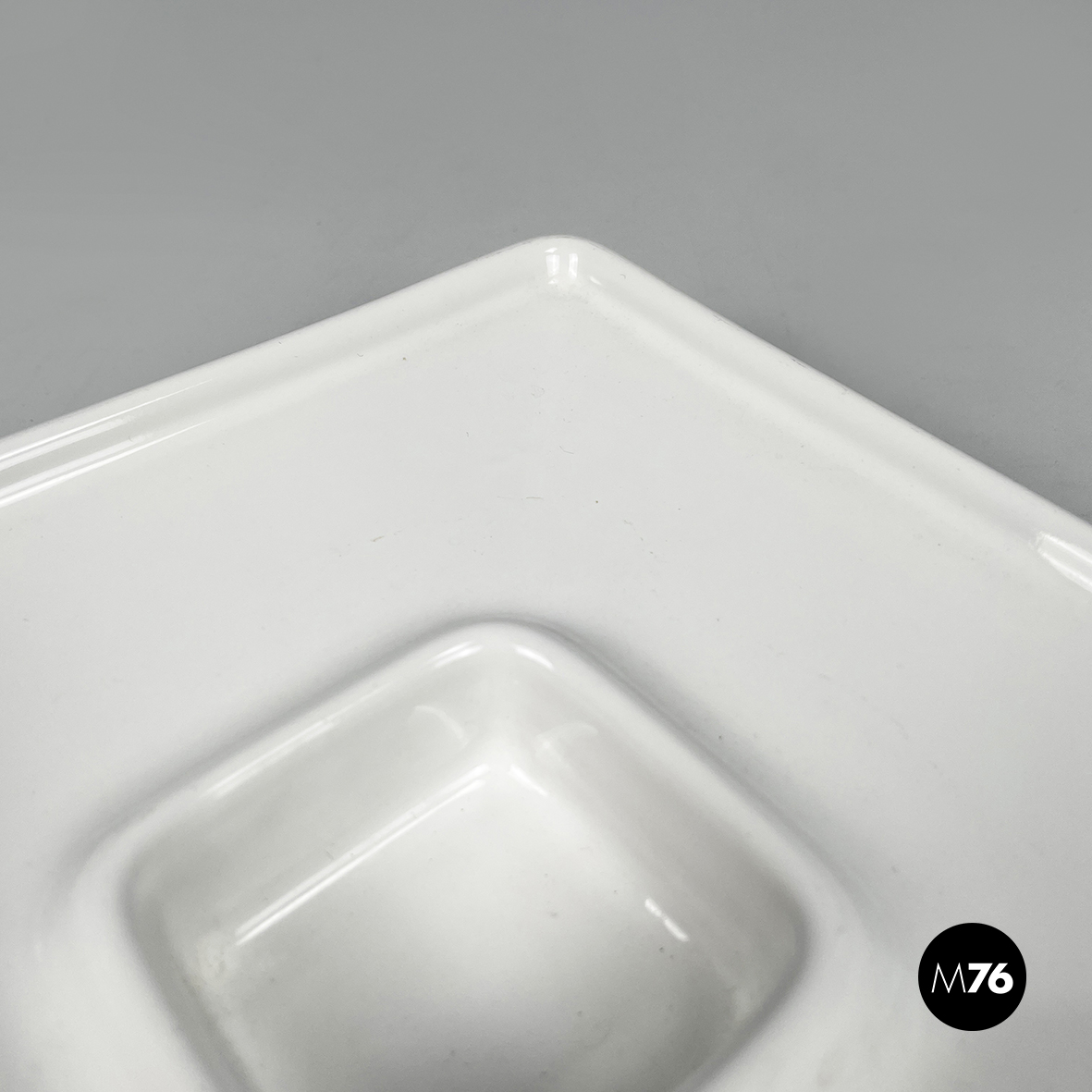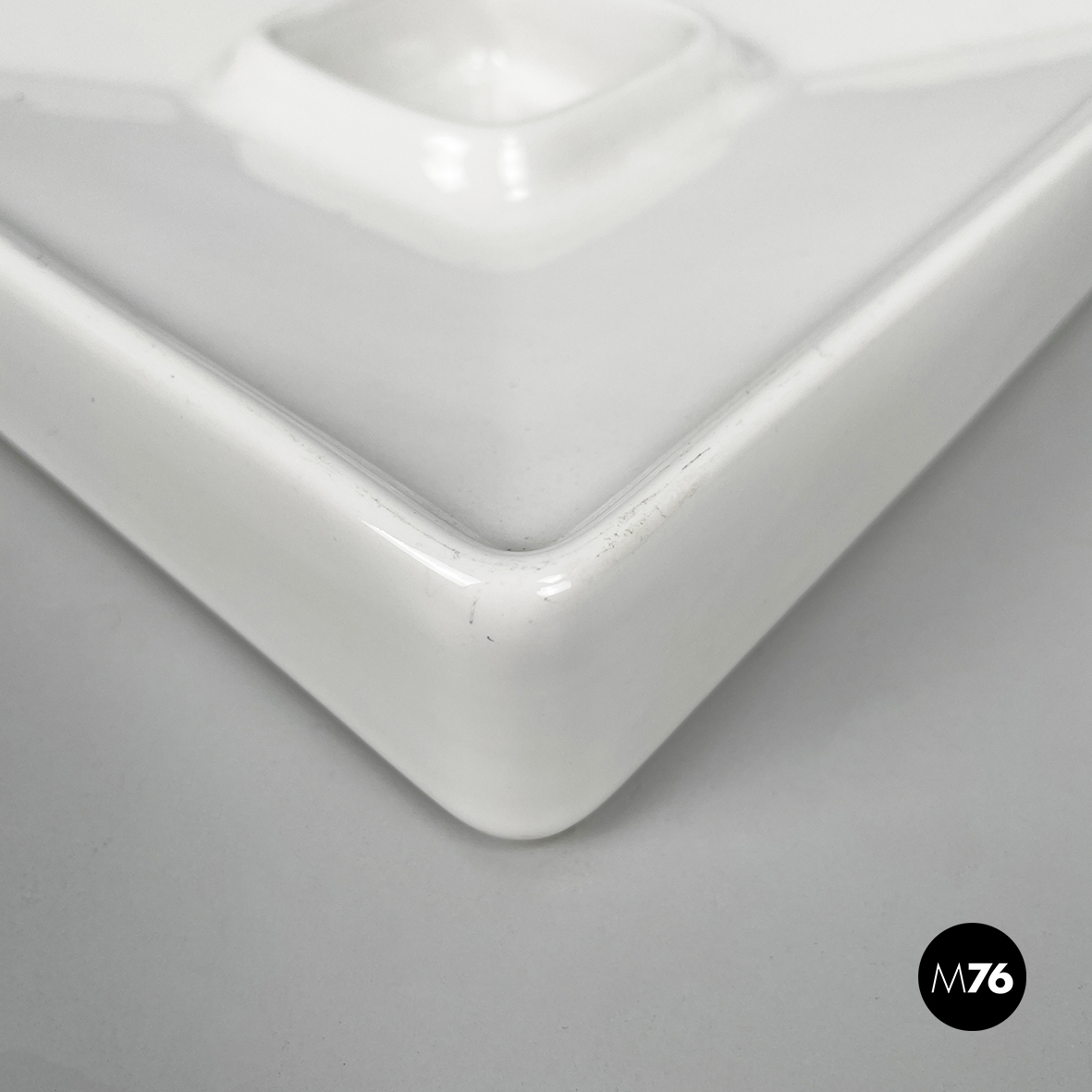 Posacenere da tavolo a base quadrata in ceramica bianca. Al centro del piatto è presente un vano, anche esso quadrato. Profilo leggermente rialzato.