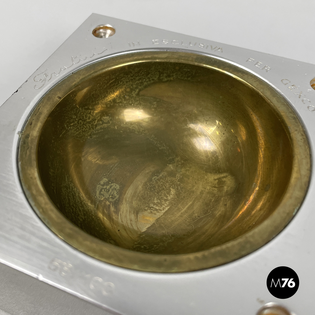 Posacenere da tavolo a base quadrata in alluminio. La struttura cubica è composta da due parti, ciascuna con una rientranza concava semicircolare in ottone. Sugli angoli delle due parti sono presenti rispettivamente quattro semisfere e quattro fori per incastrarle.