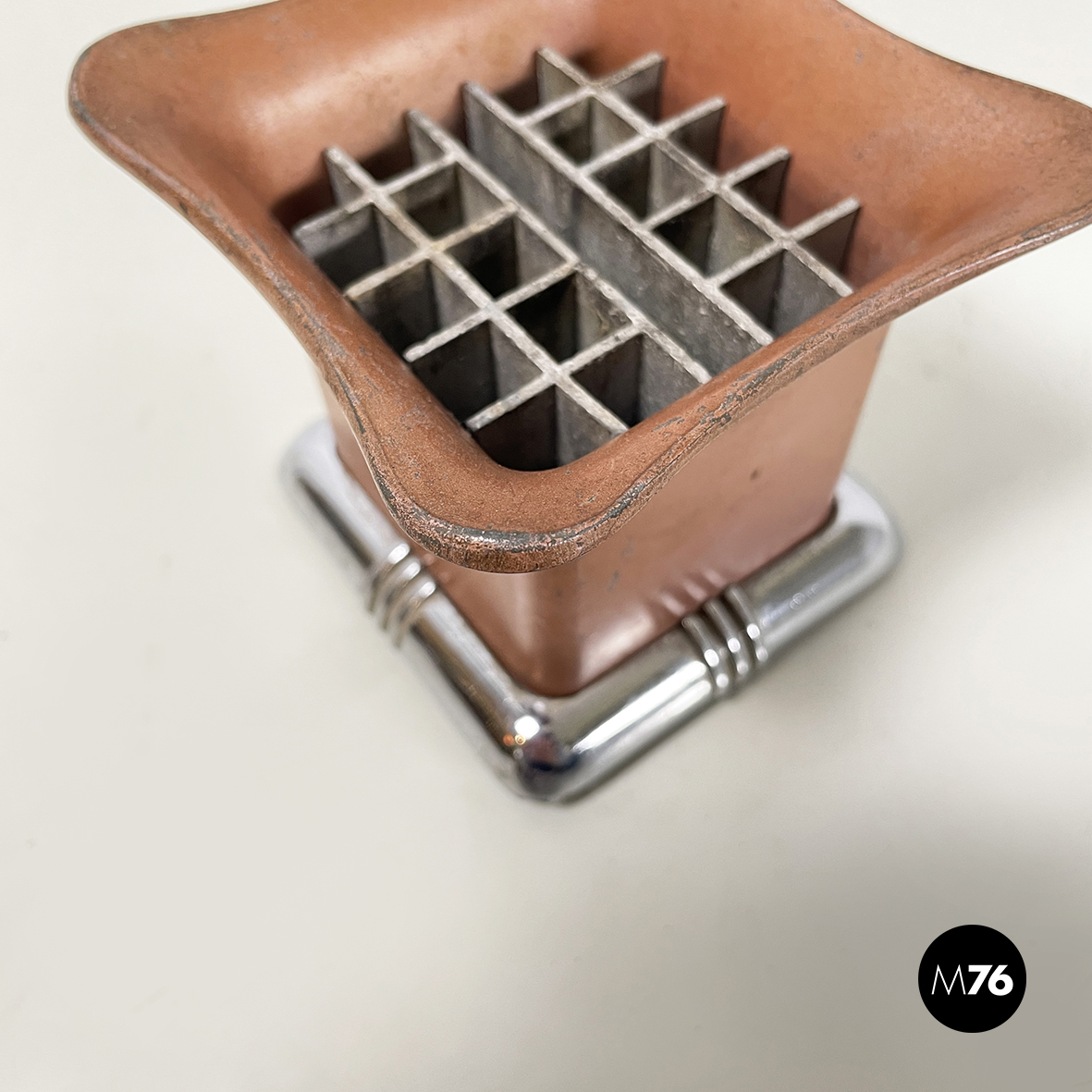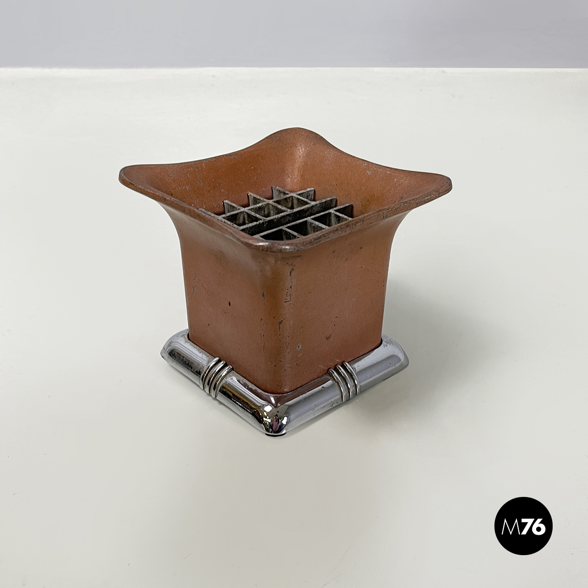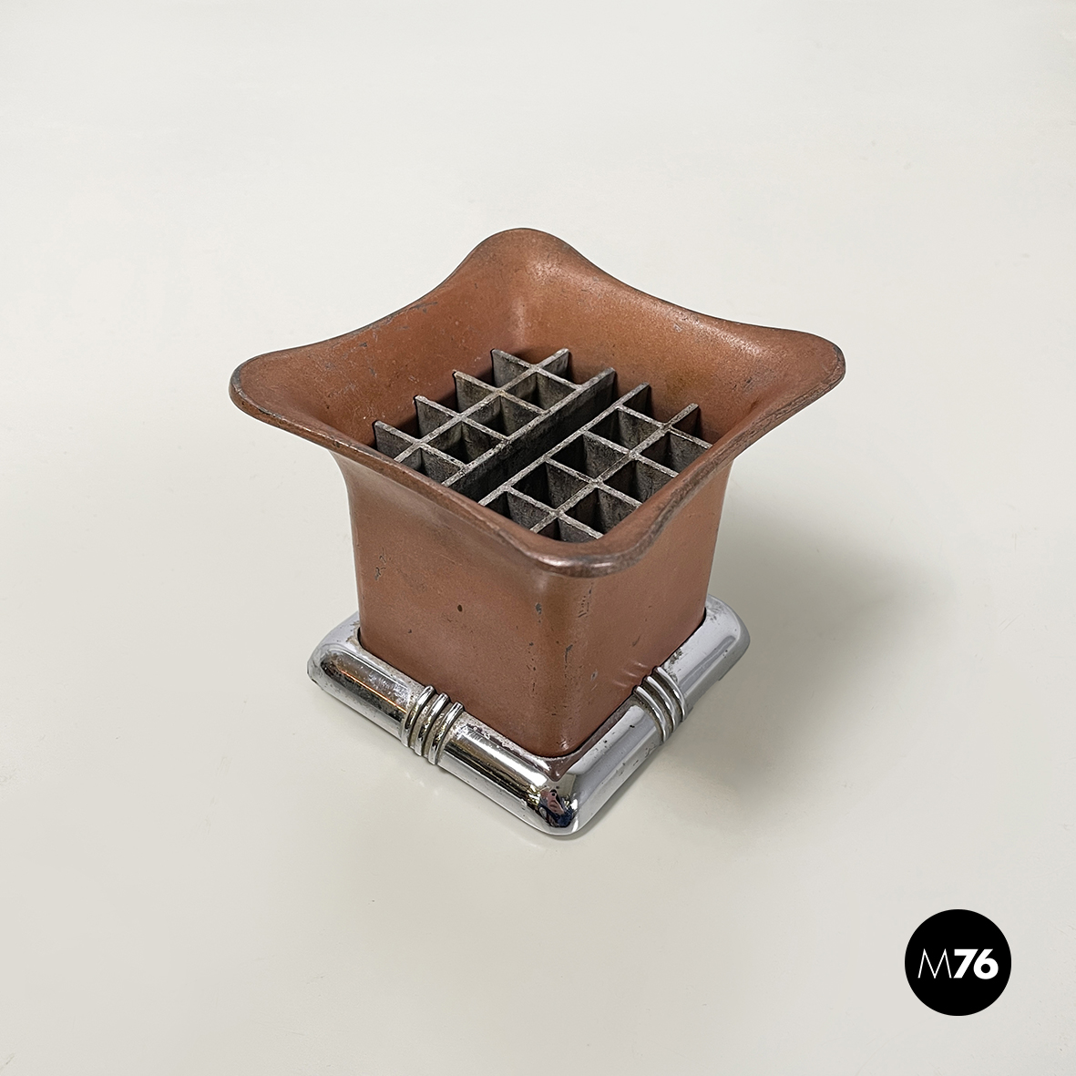 Posacenere da tavolo a base rettangolare in metallo. Nella parte alta è presente una grata per la cenere della sigarette. La struttura è in metallo verniciato rosso-mattone. La base squadrata ad angoli arrotondati è in metallo con finitura argentata.