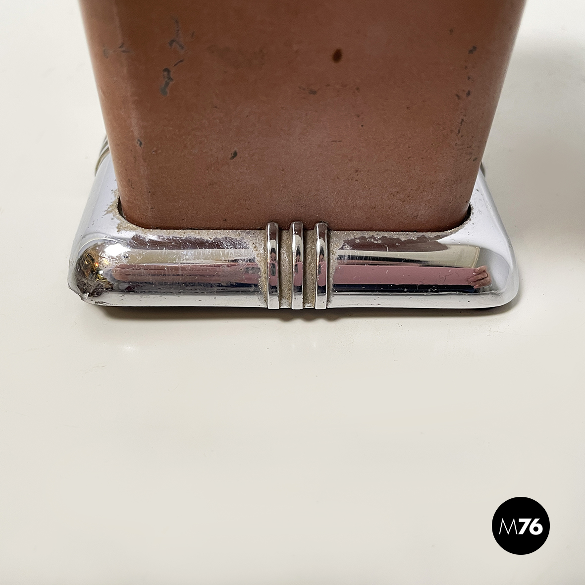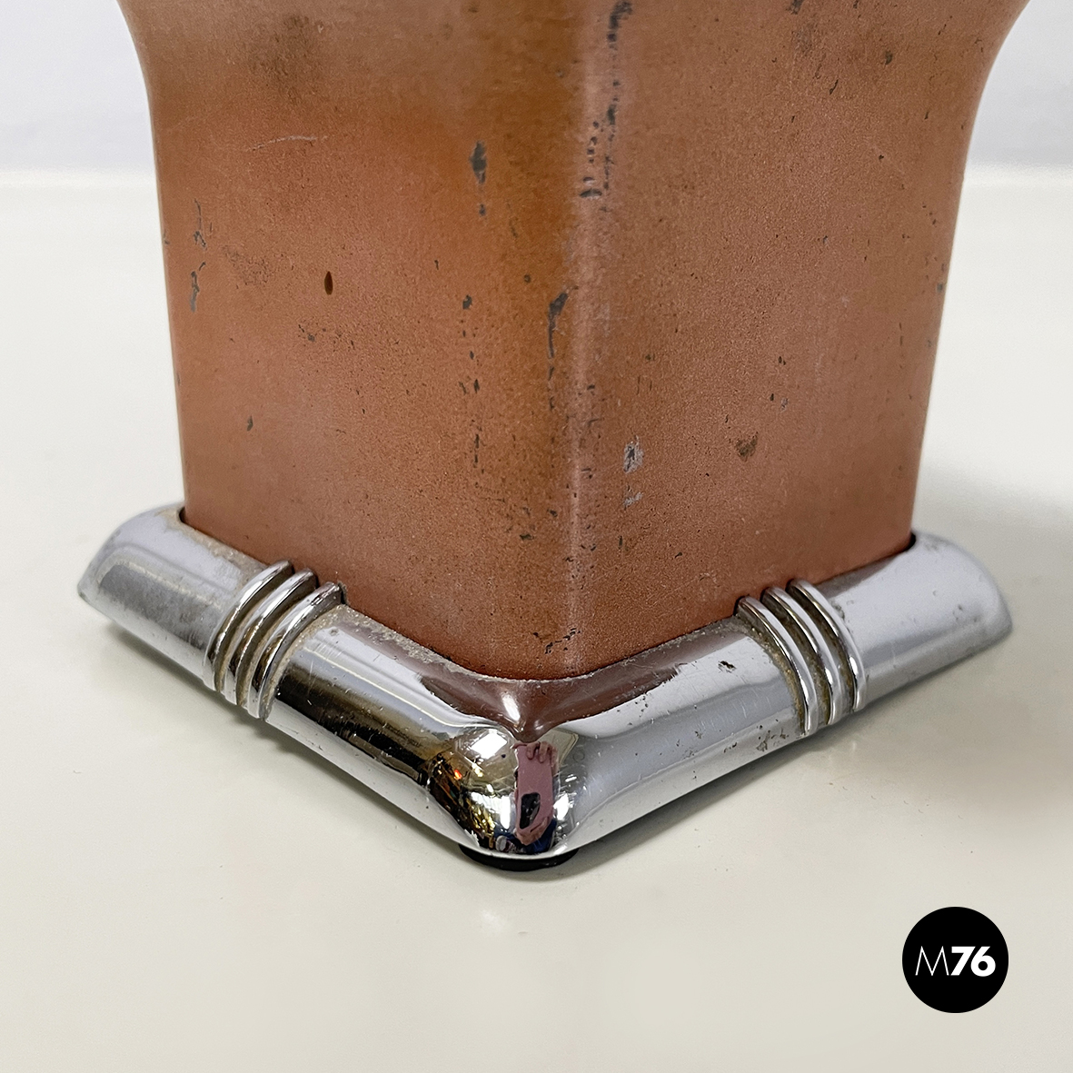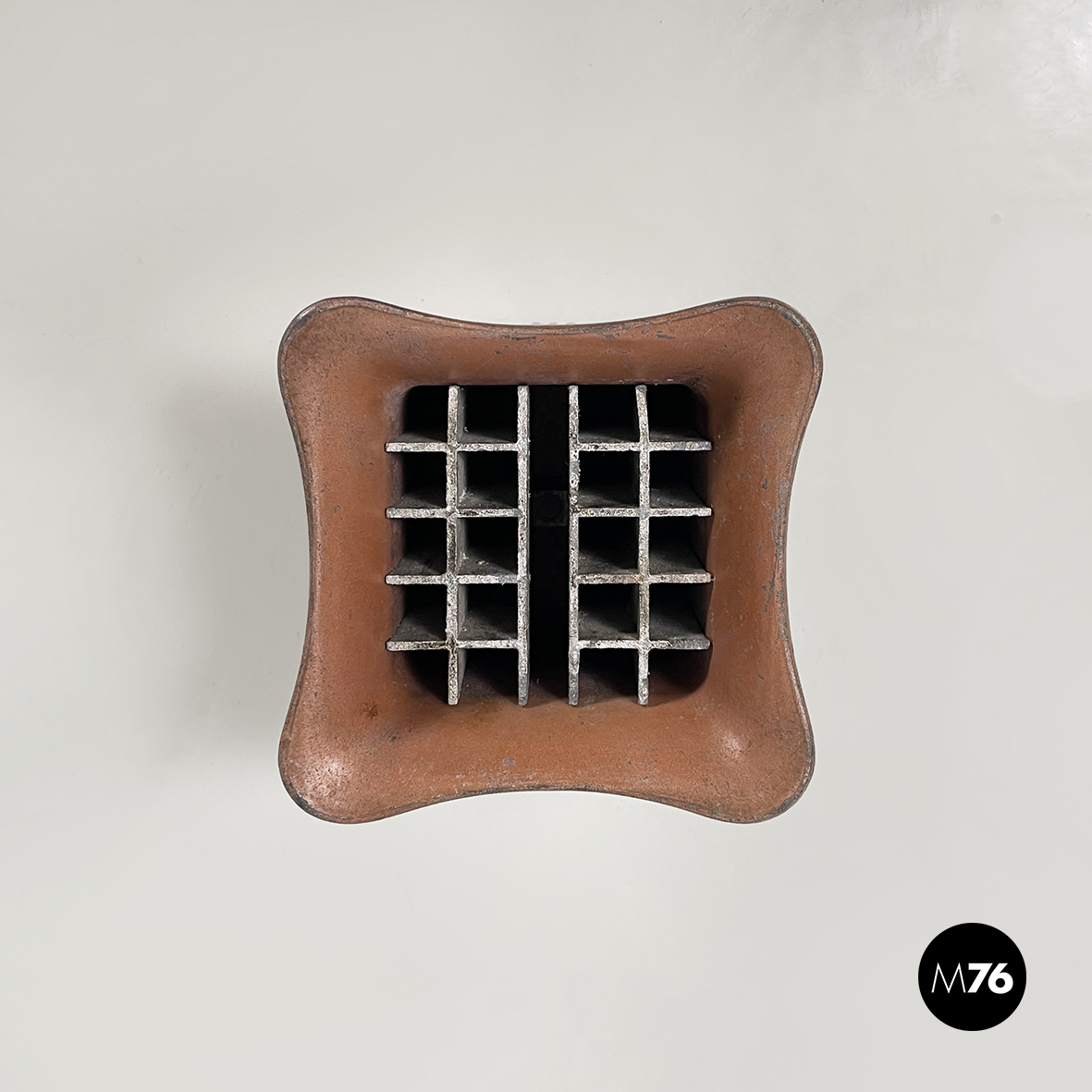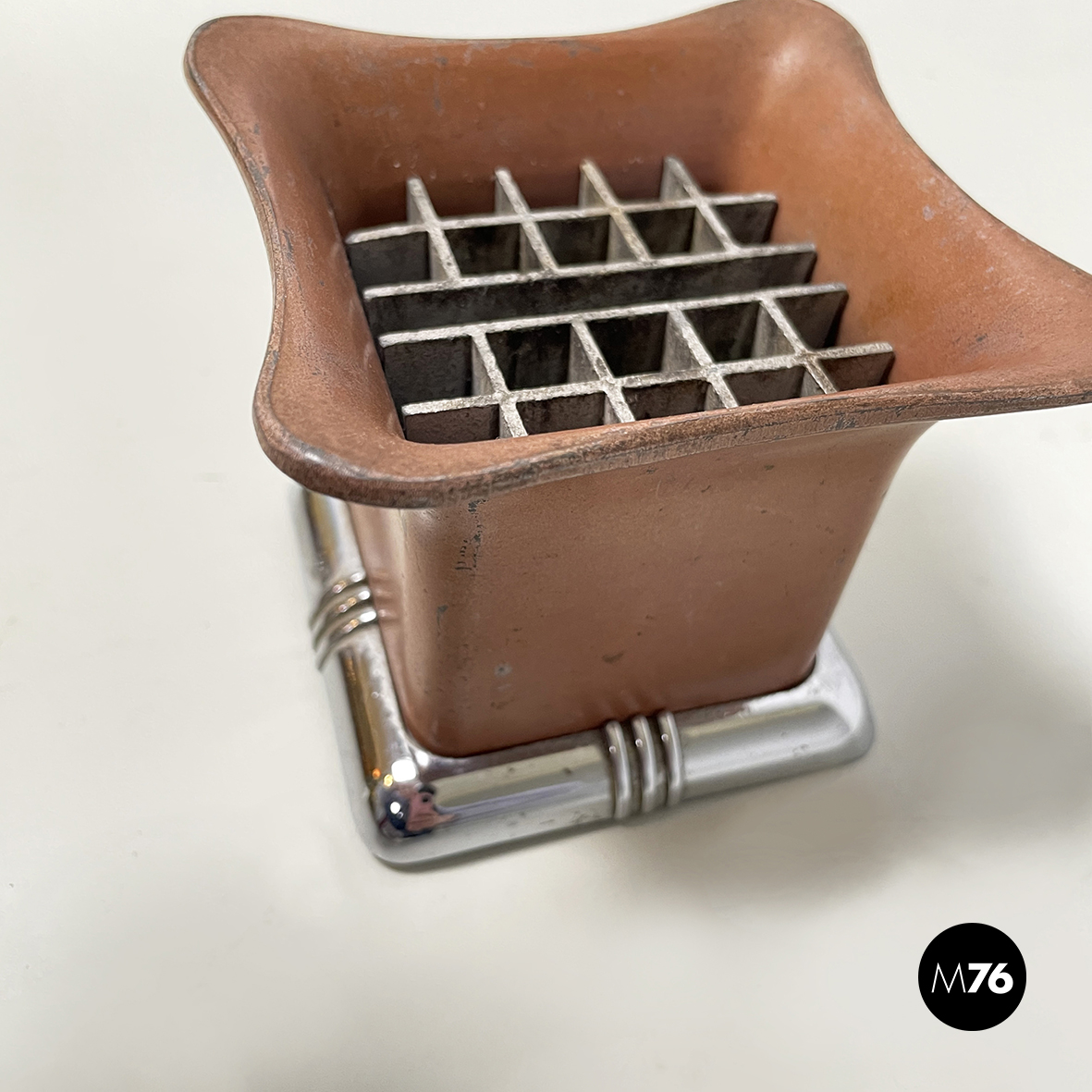Posacenere da tavolo a base rettangolare in metallo. Nella parte alta è presente una grata per la cenere della sigarette. La struttura è in metallo verniciato rosso-mattone. La base squadrata ad angoli arrotondati è in metallo con finitura argentata.